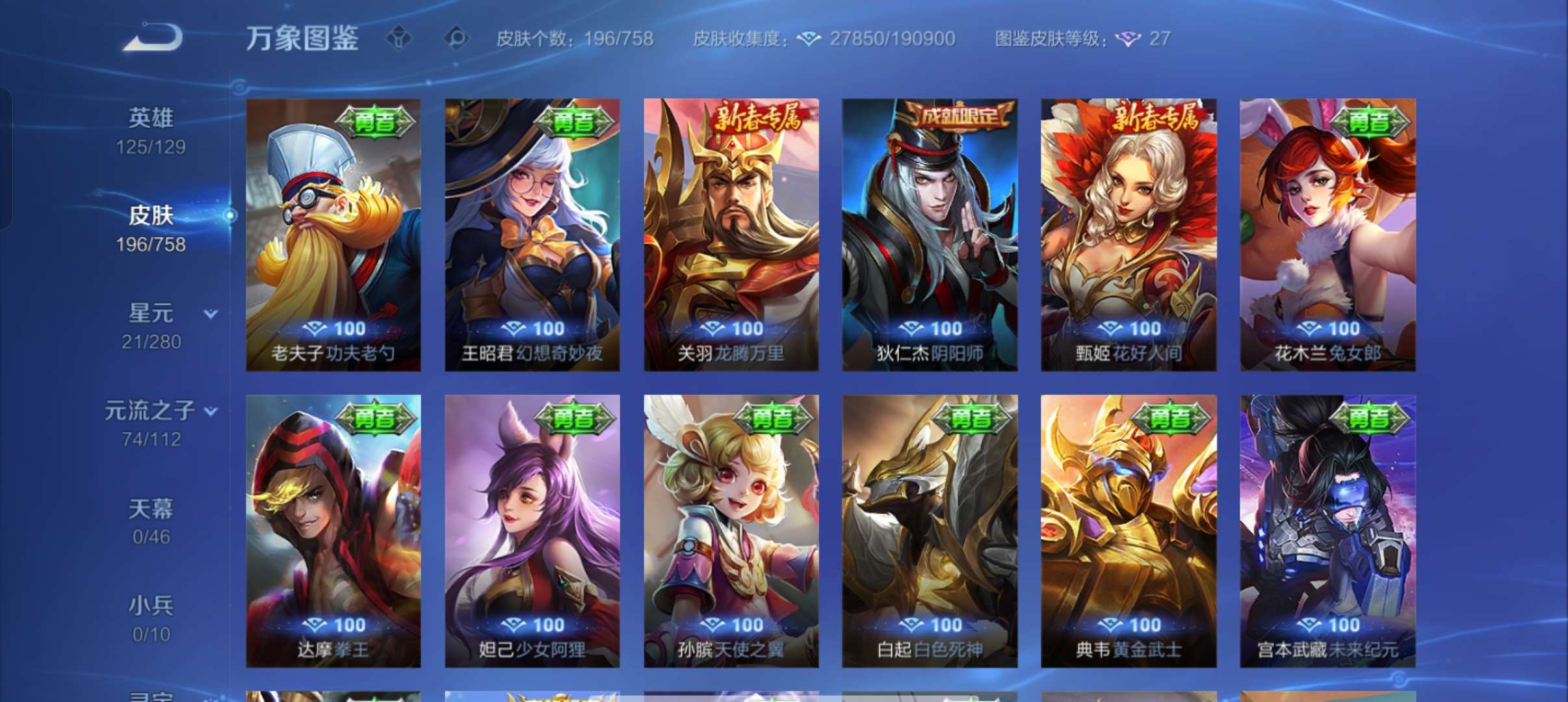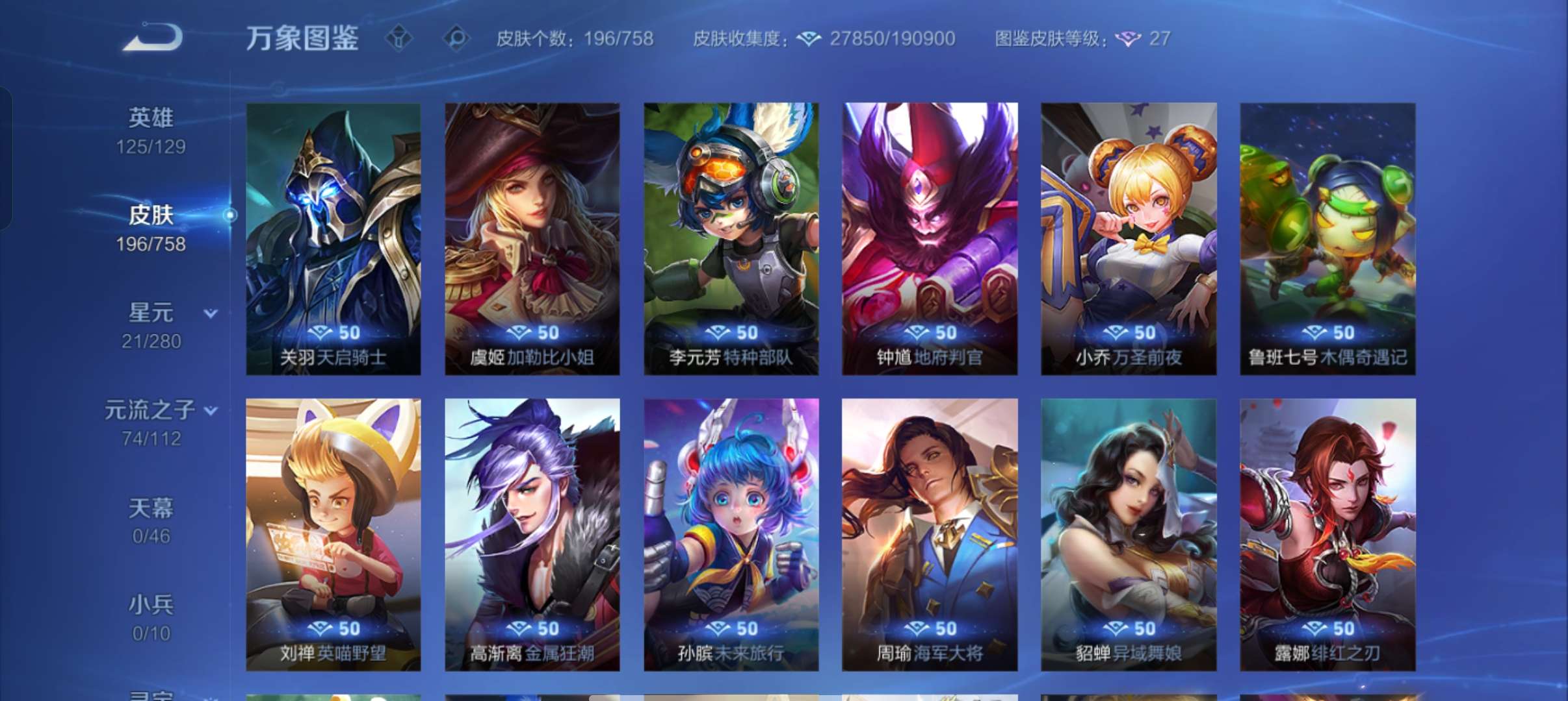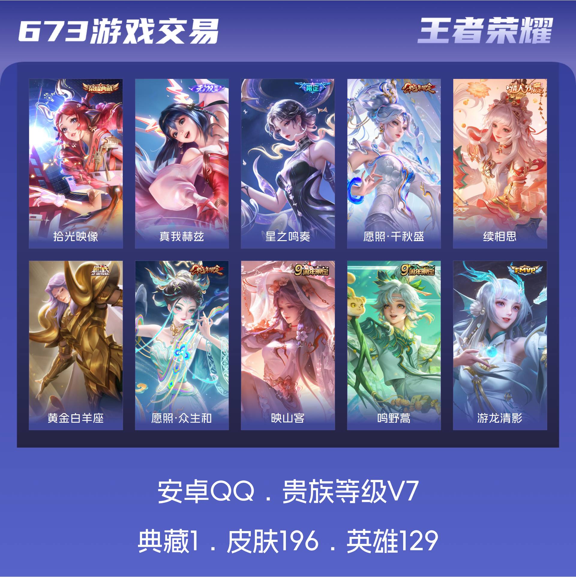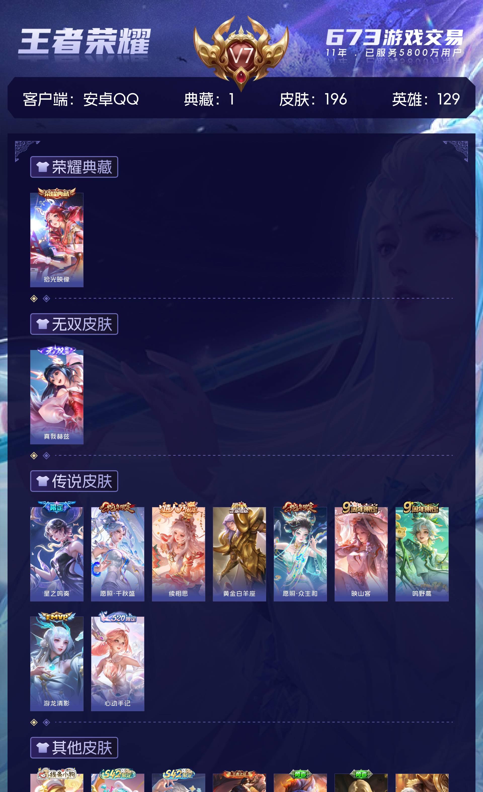 V7 皮肤196 英雄129 至尊星耀 荣耀典藏1 无双皮肤1 传说9 其他皮肤190
