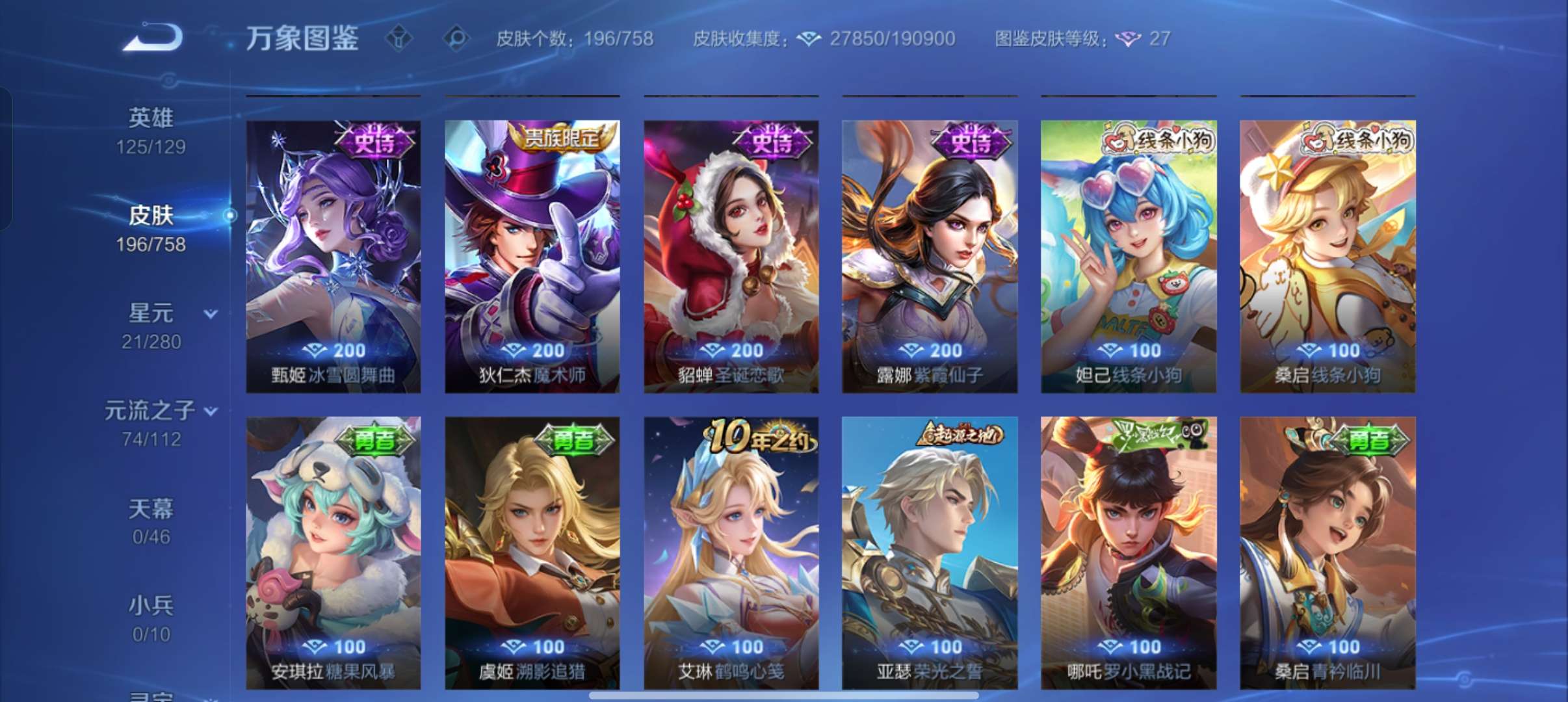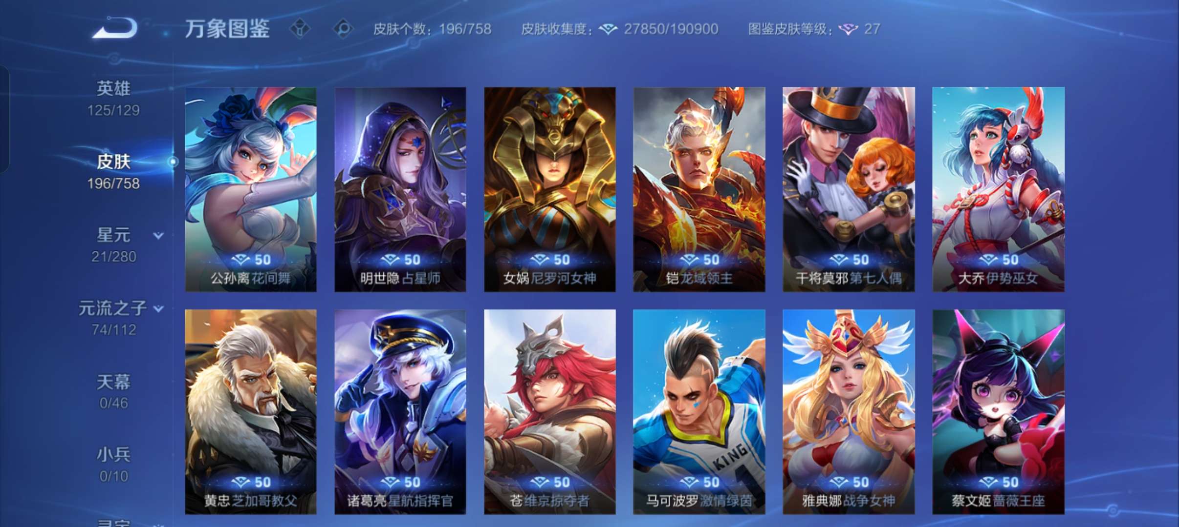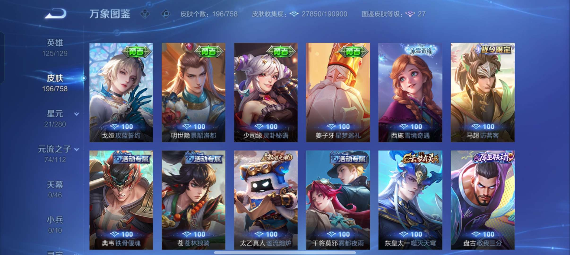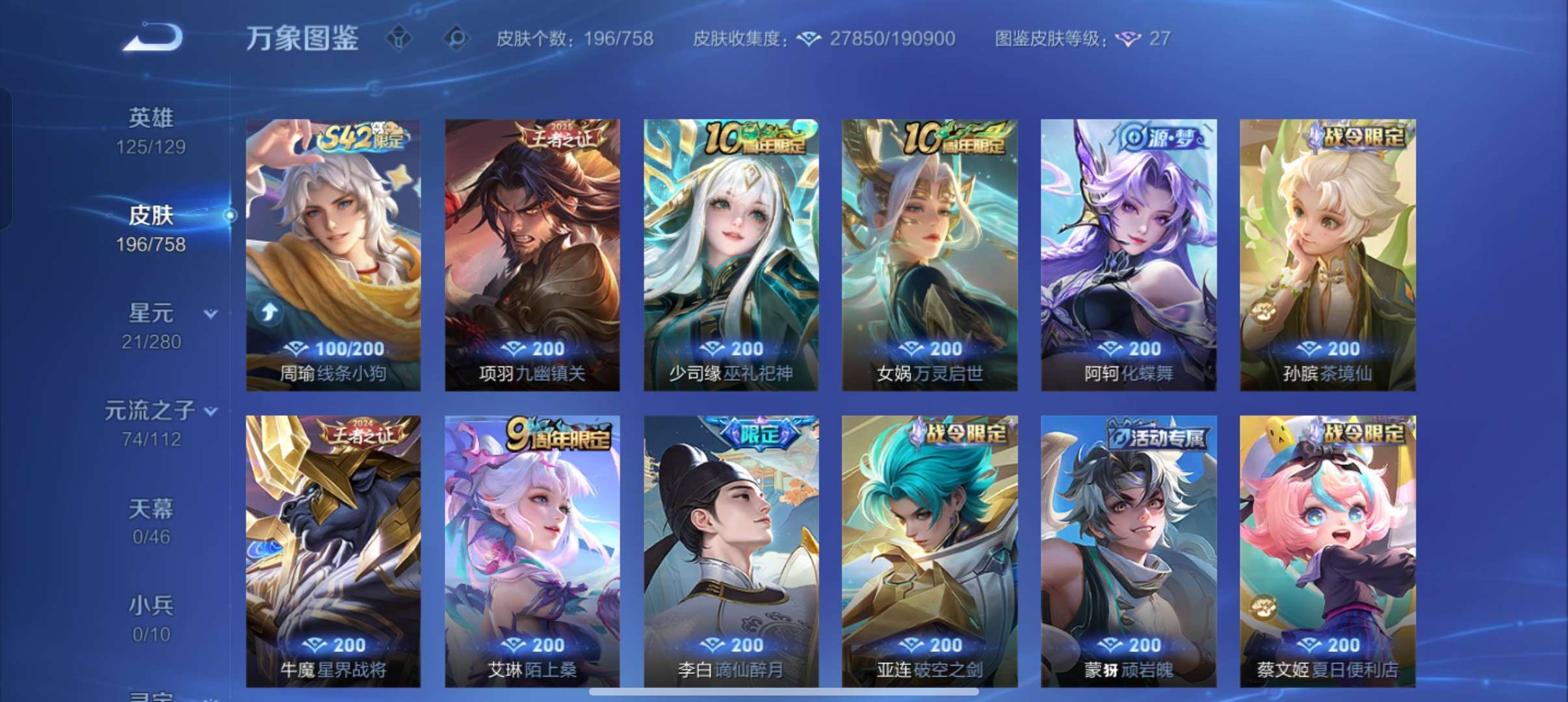 V7 皮肤196 英雄129 至尊星耀 荣耀典藏1 无双皮肤1 传说9 其他皮肤190