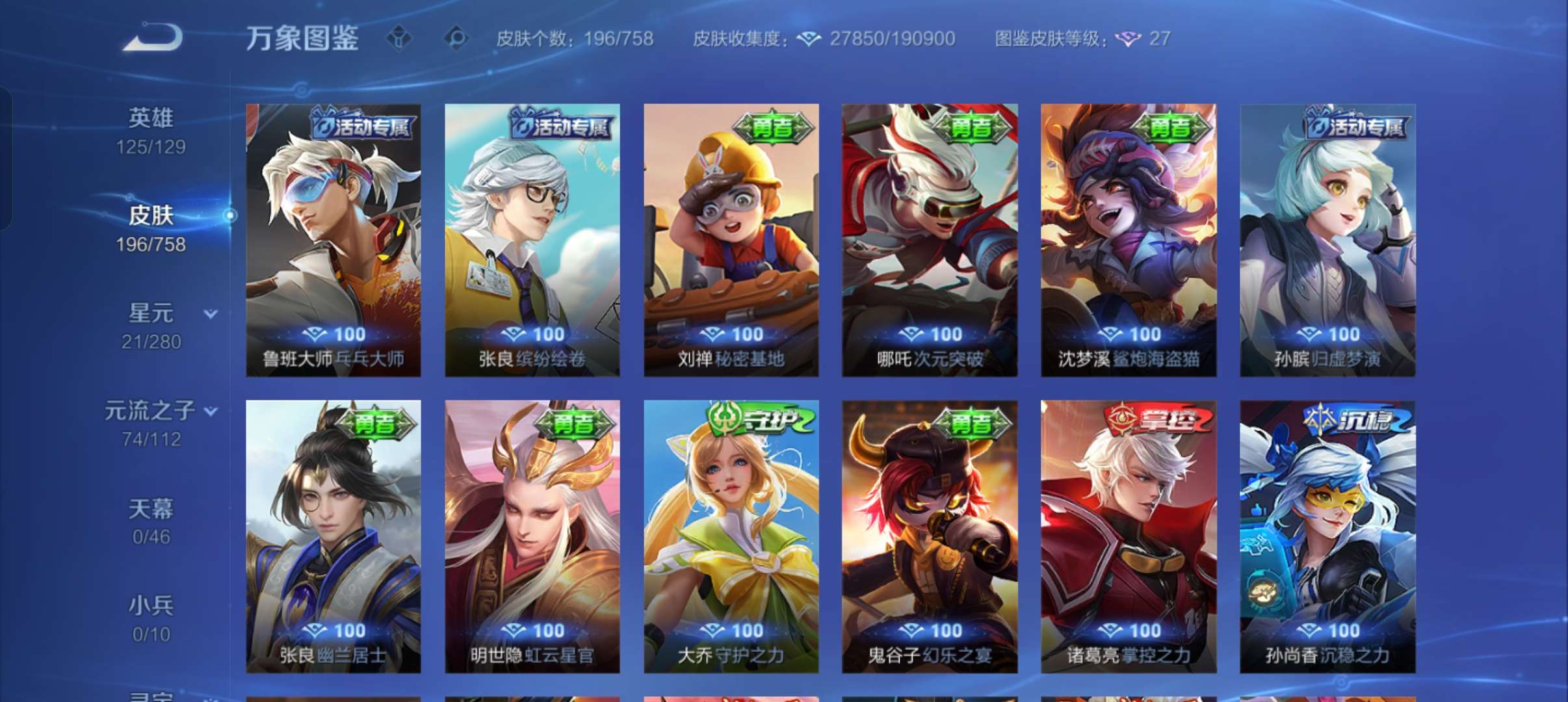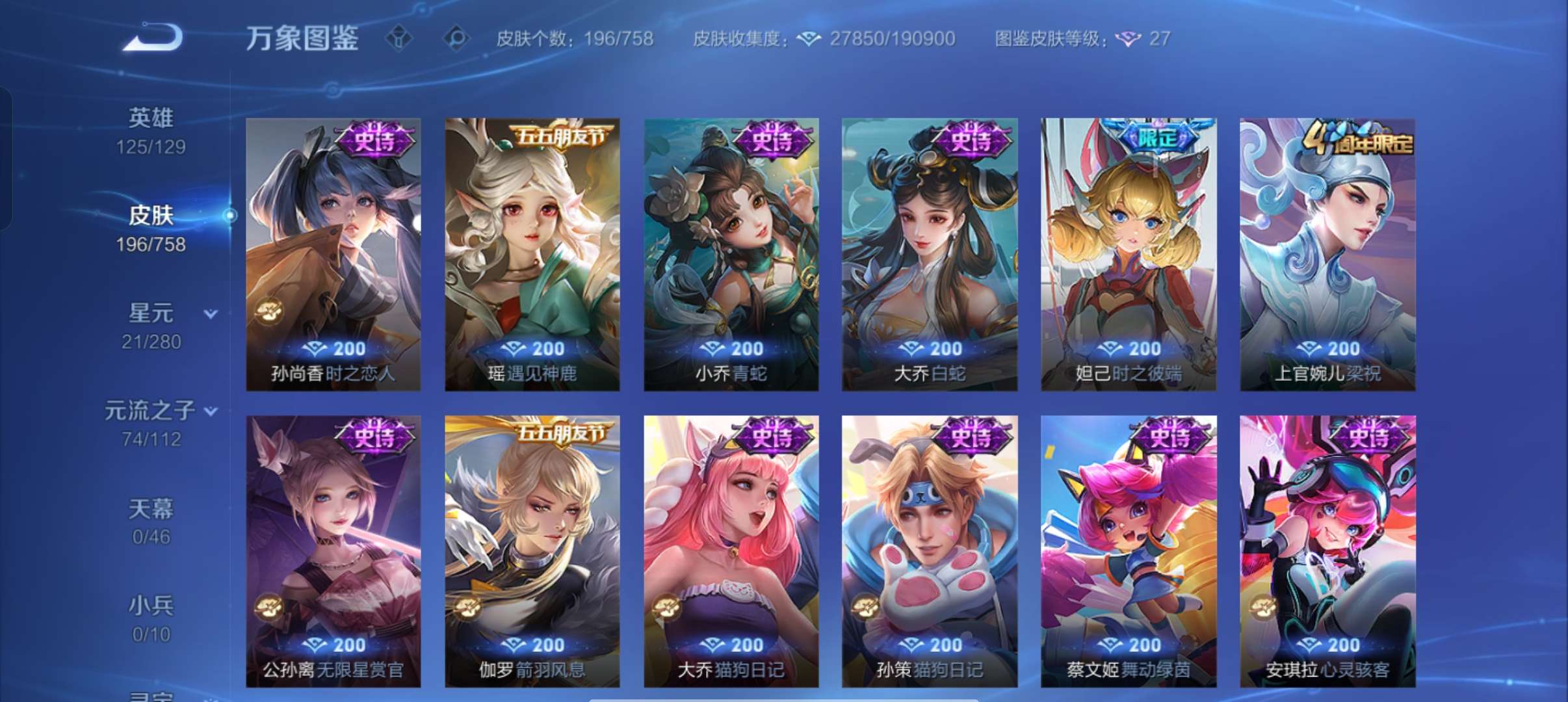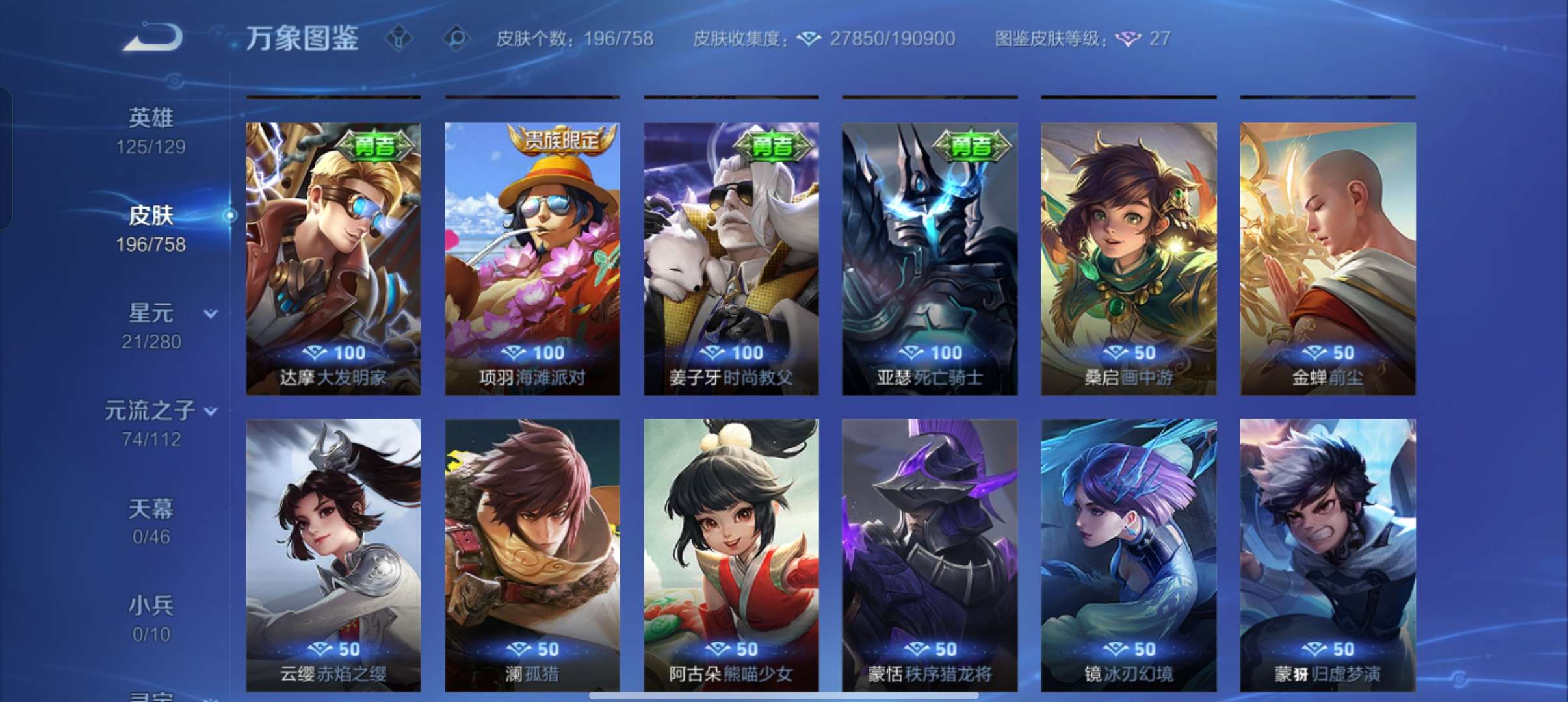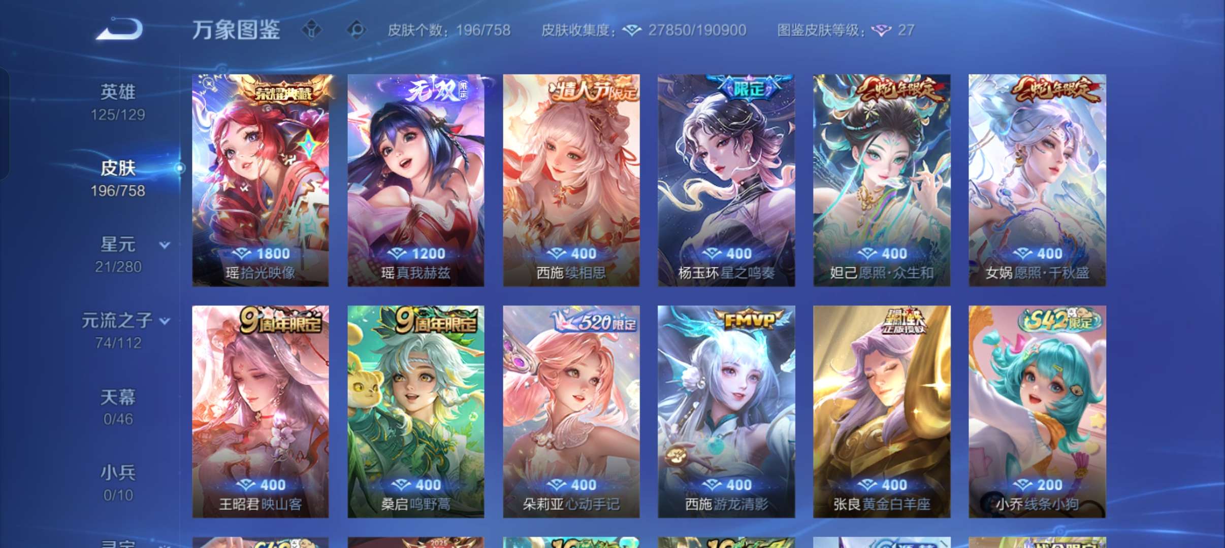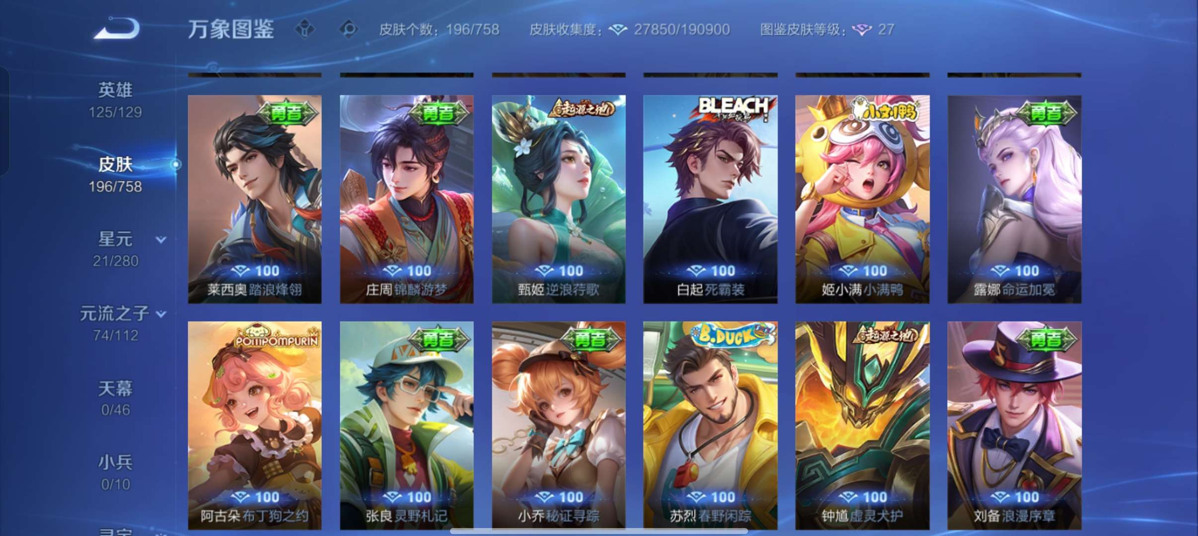 V7 皮肤196 英雄129 至尊星耀 荣耀典藏1 无双皮肤1 传说9 其他皮肤190