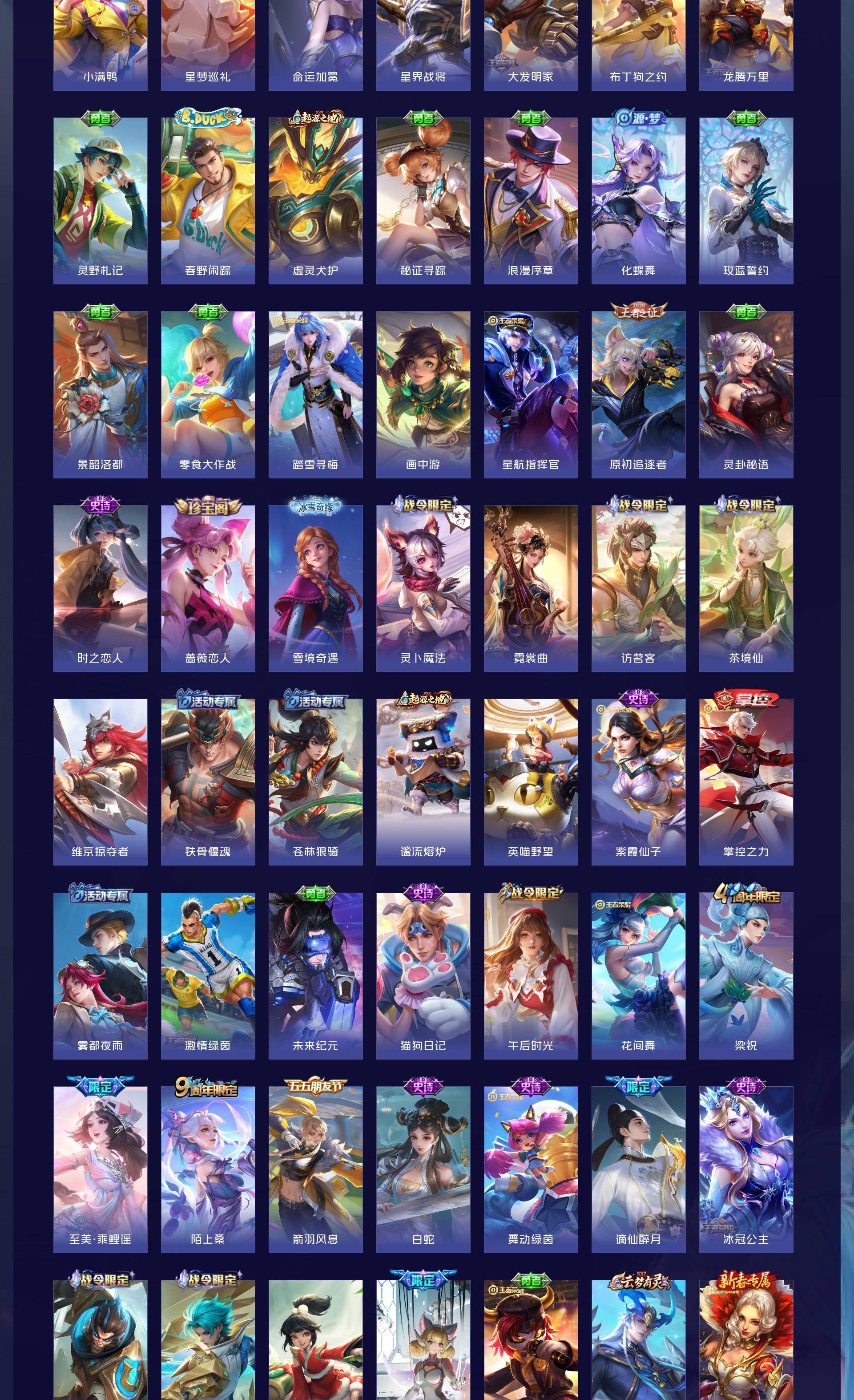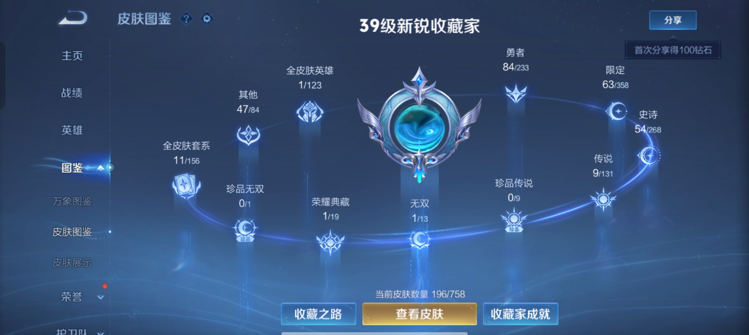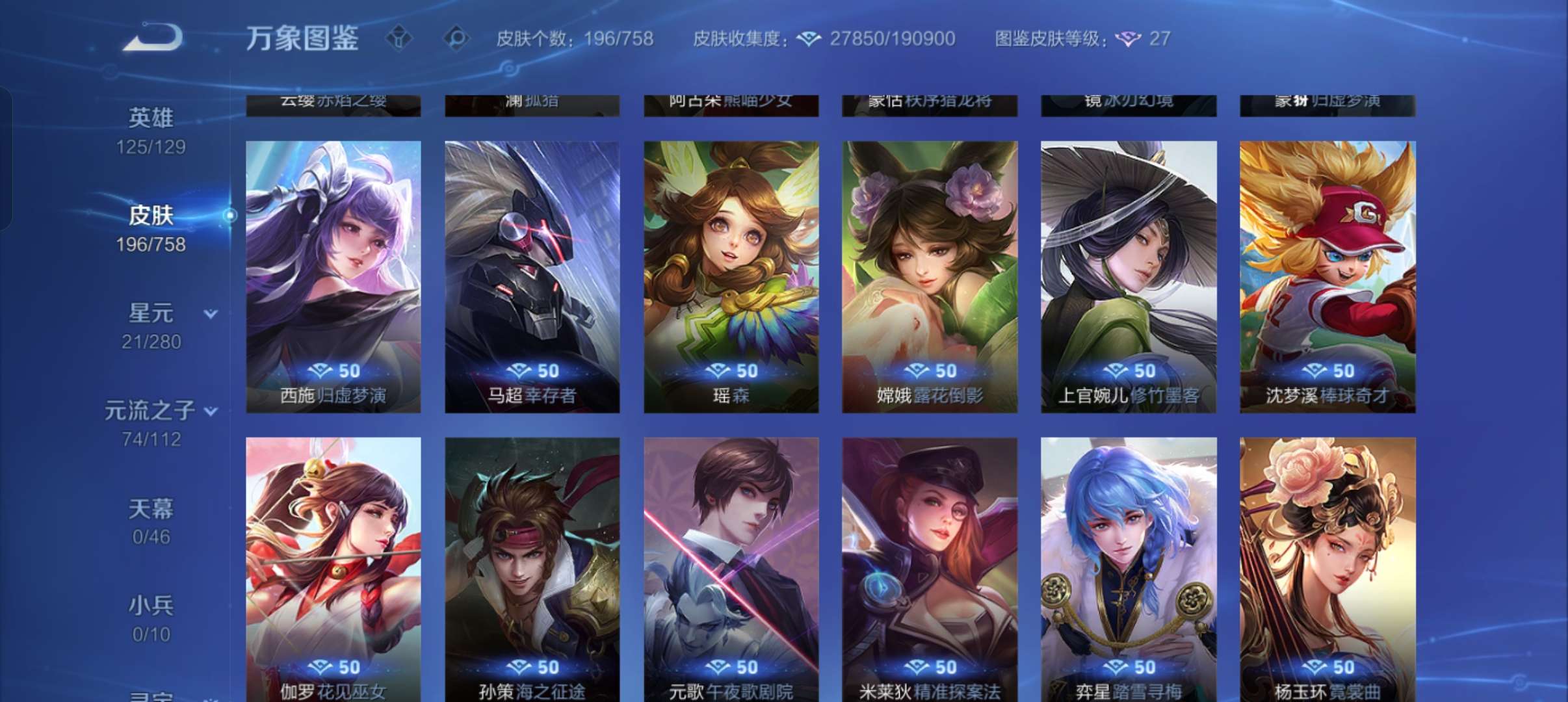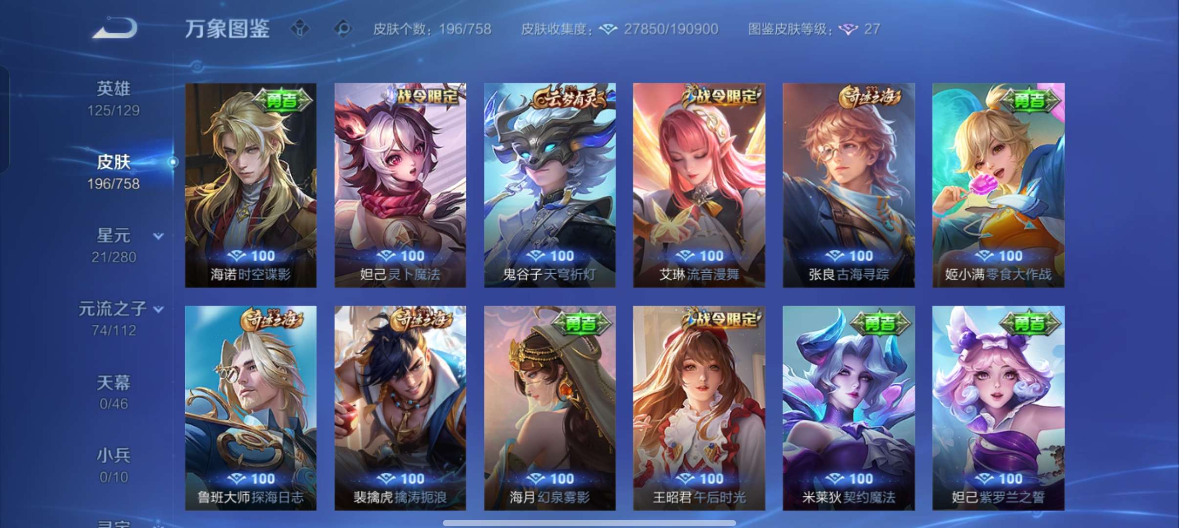 V7 皮肤196 英雄129 至尊星耀 荣耀典藏1 无双皮肤1 传说9 其他皮肤190