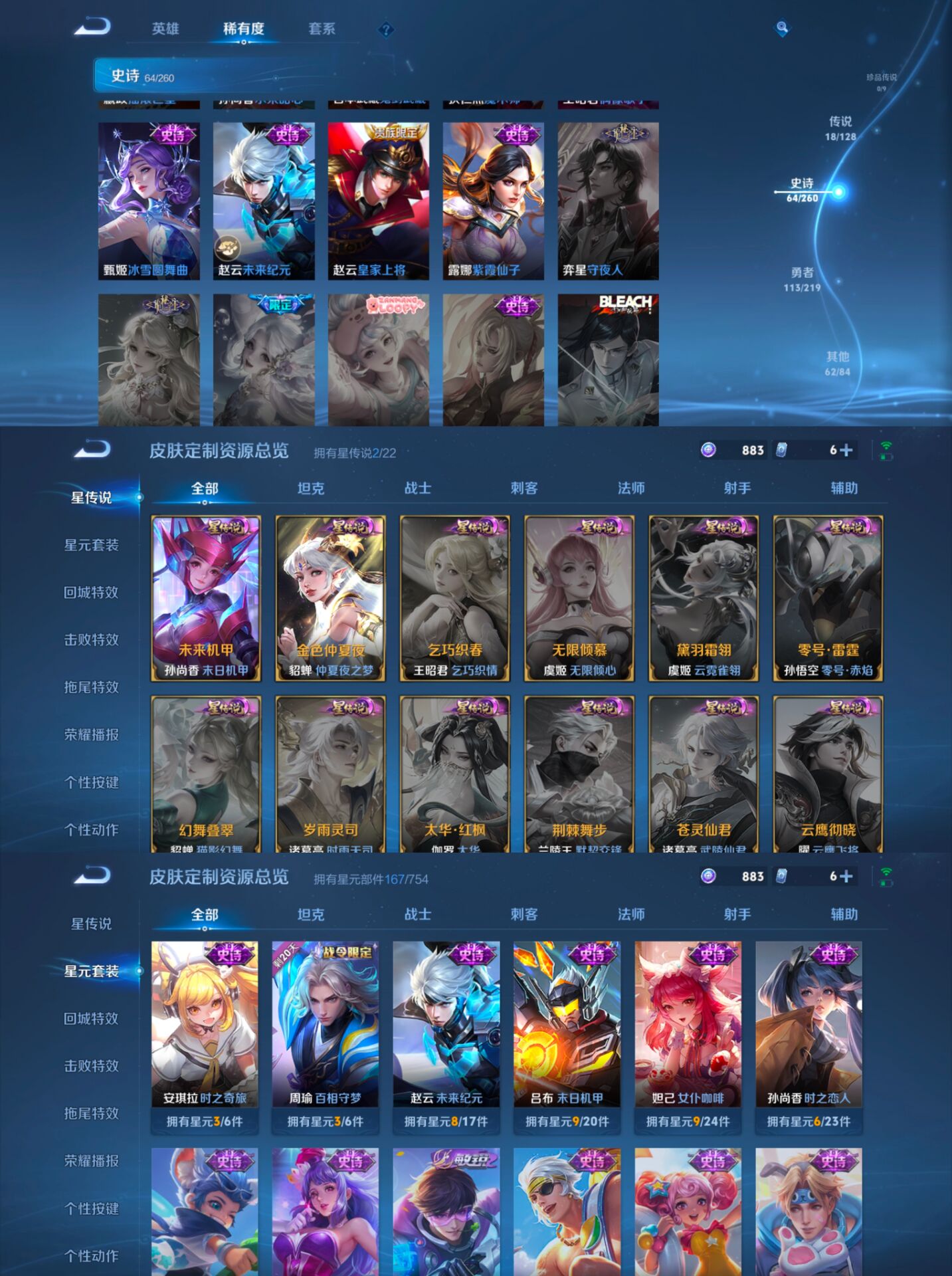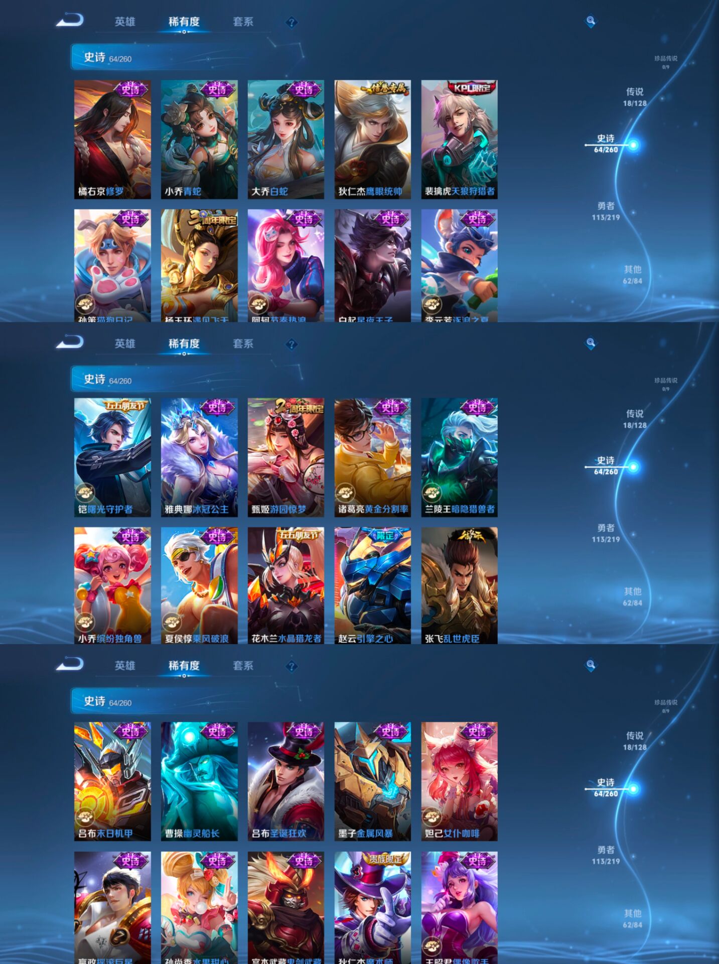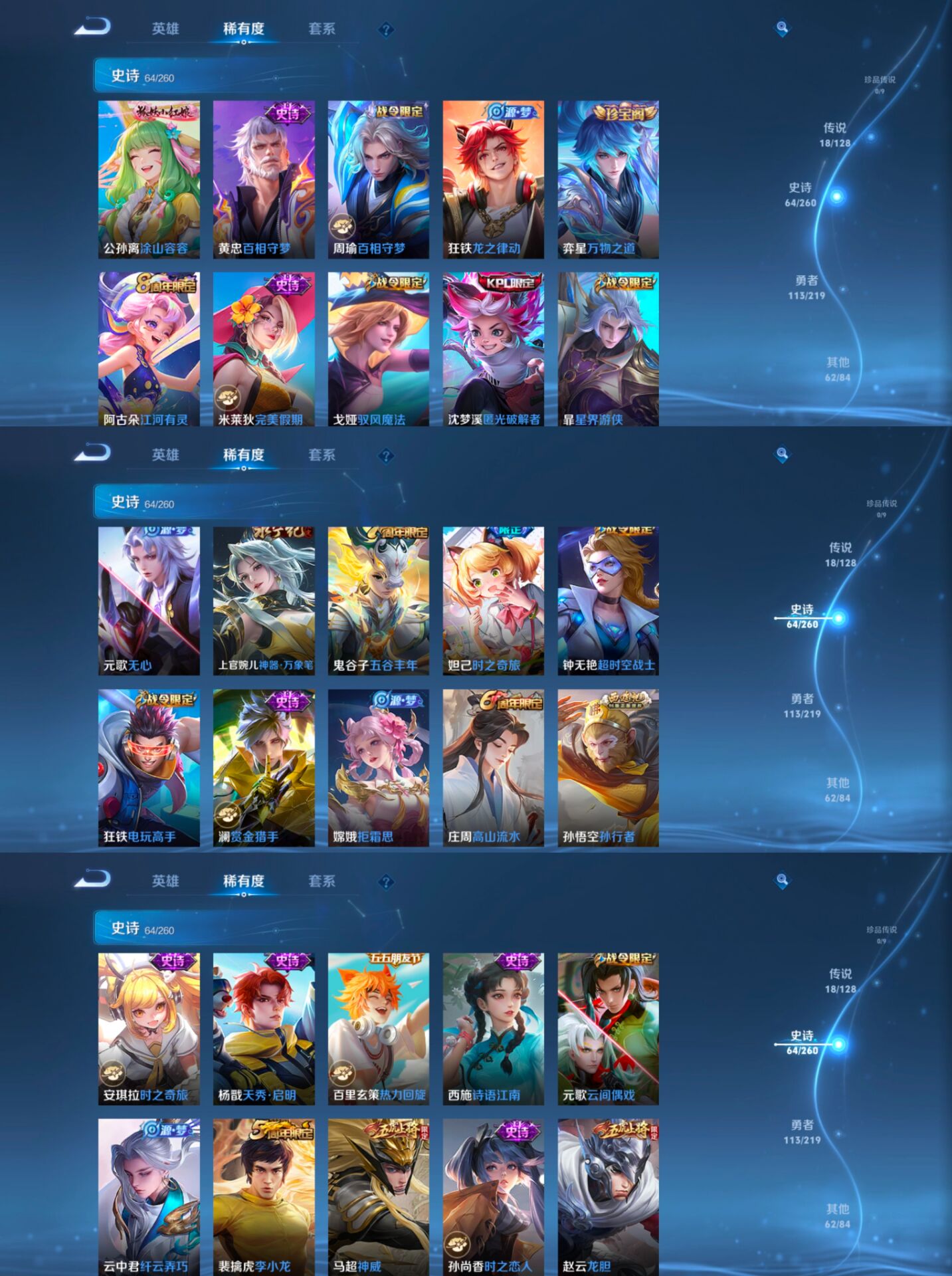 【史诗皮肤】 龙之律动 神器·万象笔 神威 天狼狩猎者 孙行者 诗语江南 引擎之心 聚星闪耀 江河有灵 布丁狗之约 完美运算 谧流熔炉 漠中幻影 百相守梦 百相守梦 神器·万