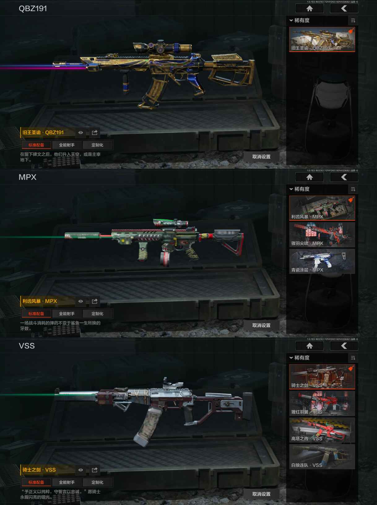 DSTW1758安卓Q-等级30-仓库价值1.2m-科恩币483895 【枪皮】 旧王圣谕·QBZ191 利齿风暴·MPX 骑士之剑·VSS 告丧夜曲·AR57 【套装】 国王卫队礼装·轻装 【刀皮】 热能武器·补牢 赢家匕首