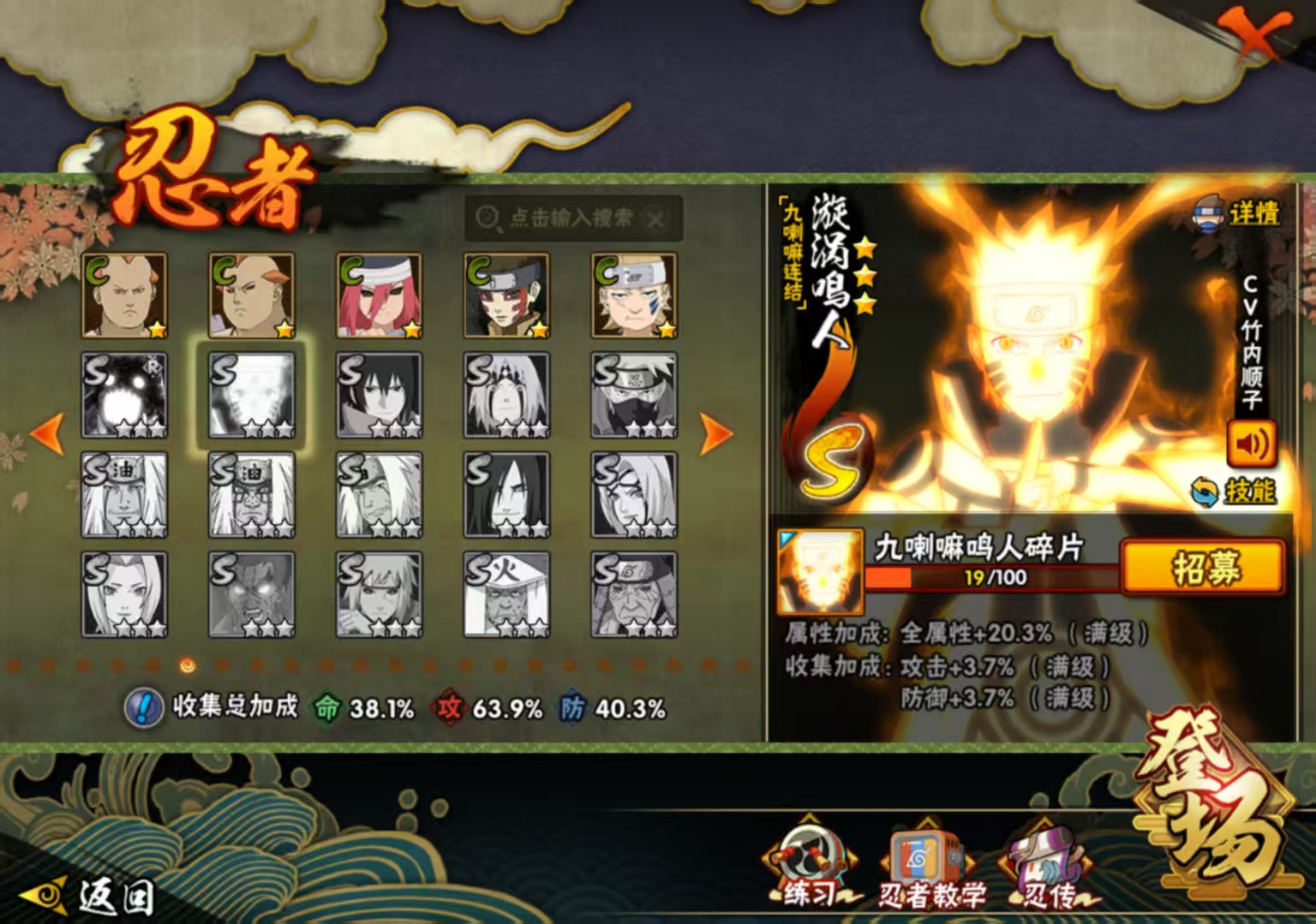 8s,十尾带土49片,黄猿19片,迈特凯34片,忍战土台16片,夏日鼬和专属通灵