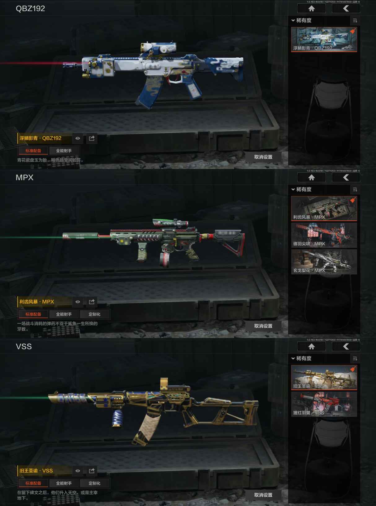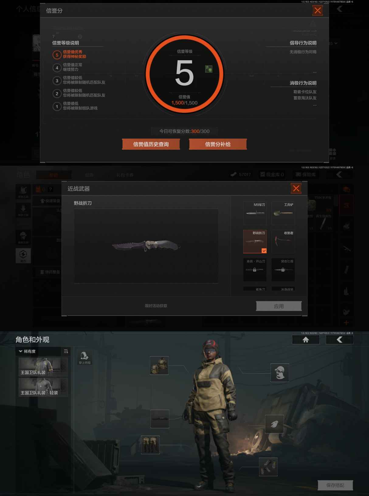 DSTW1844安卓Q-等级30-仓库价值171k-科恩币57k-【套装】 王国卫队礼装 王国卫队礼装,轻装 【枪皮】 告丧夜曲·AR57 旗帜·AEK 旧王圣谕·QBZ191 浮鳞影青·QBZ192 利齿风暴·MPX 旧王圣谕:VSS 棱光裂变·QBU191 【近战武器】 收割者 野战折刀