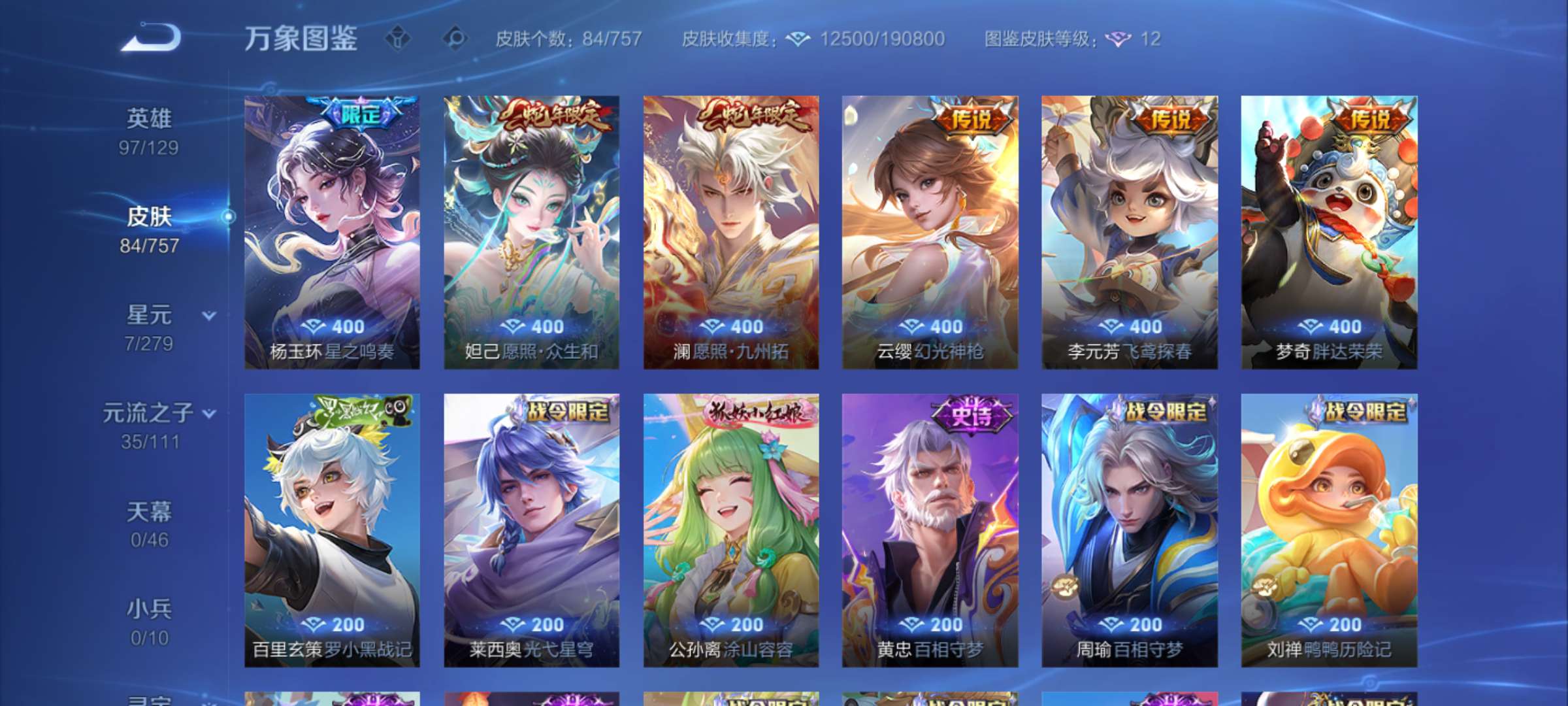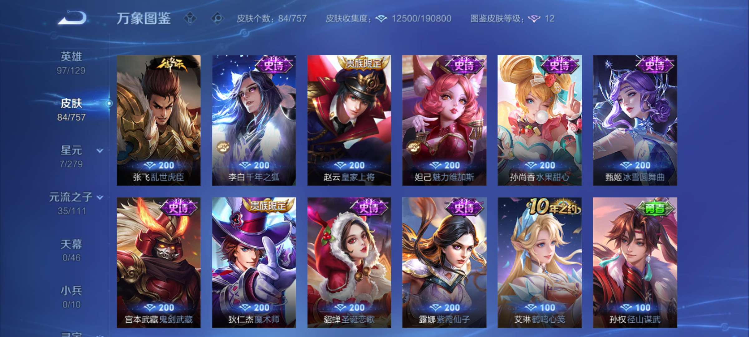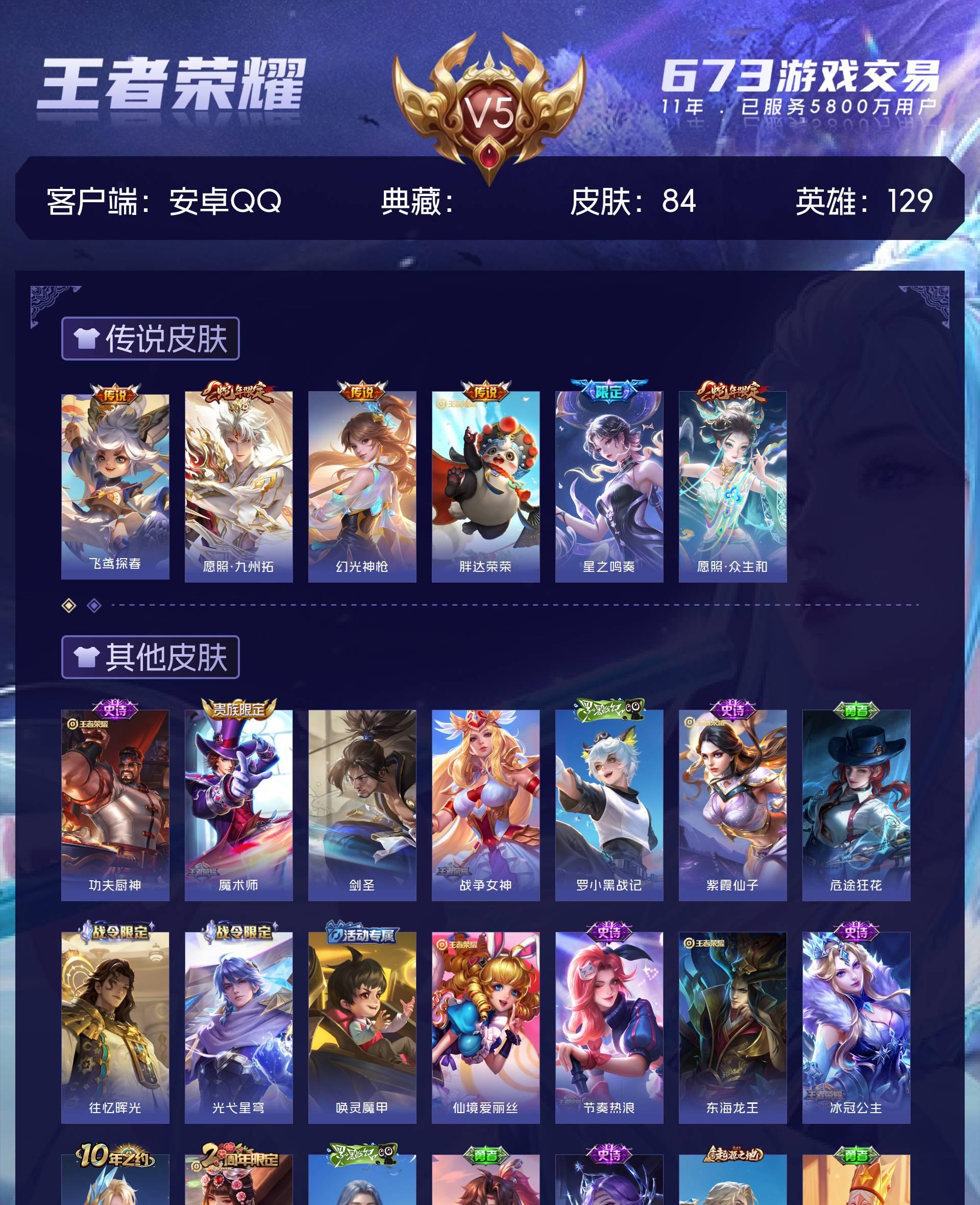 V5 皮肤84 英雄129 永恒钻石 传说6 其他皮肤83
