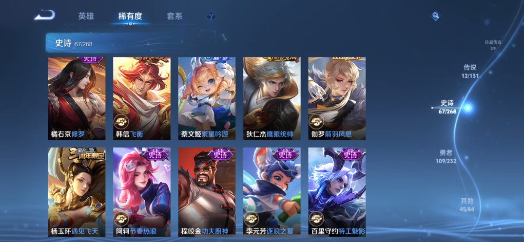 【史诗皮肤】 星界战将 百相守梦 飞衡 玫瑰异探 谧流熔炉 御风骁将 白晶晶 霸王别姬 地狱燃心 霸王别姬 九幽镇关 山海·玄木吟 埋骨钱 聚星闪耀 江河有灵 决胜大满贯 荣光圣徽 百相守梦 万灵启世 奇幻香踪