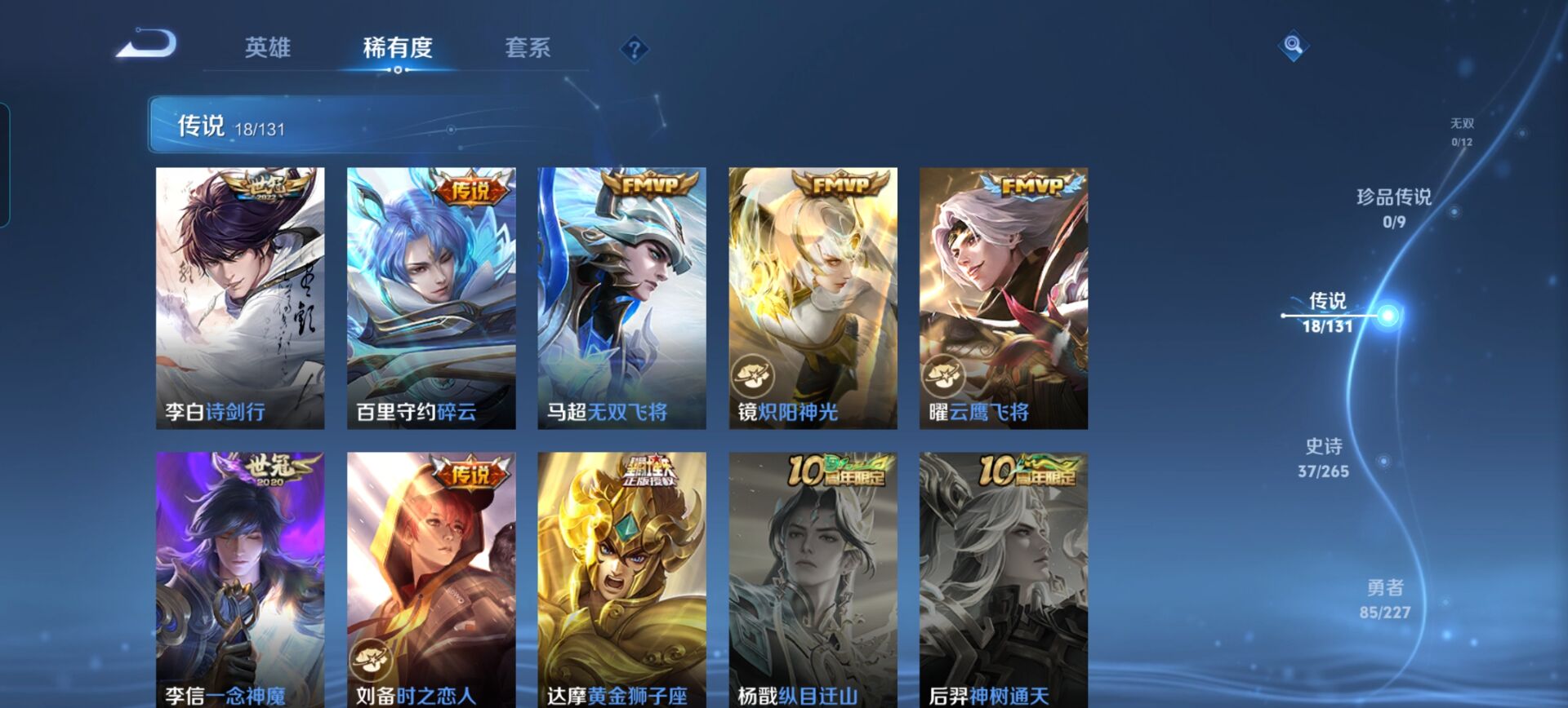 【传说皮肤】 鸣野蒿 鹤归松栖 惊梅引 霜月吟 续相思 幻光神枪 愿照·山河定 祥瑞亨通 愿照·九州拓 愿照·岁时盈 诗剑行 碎云 无双飞将 黄金狮子座 炽阳神光 一念神魔 时之恋人 云鹰飞将