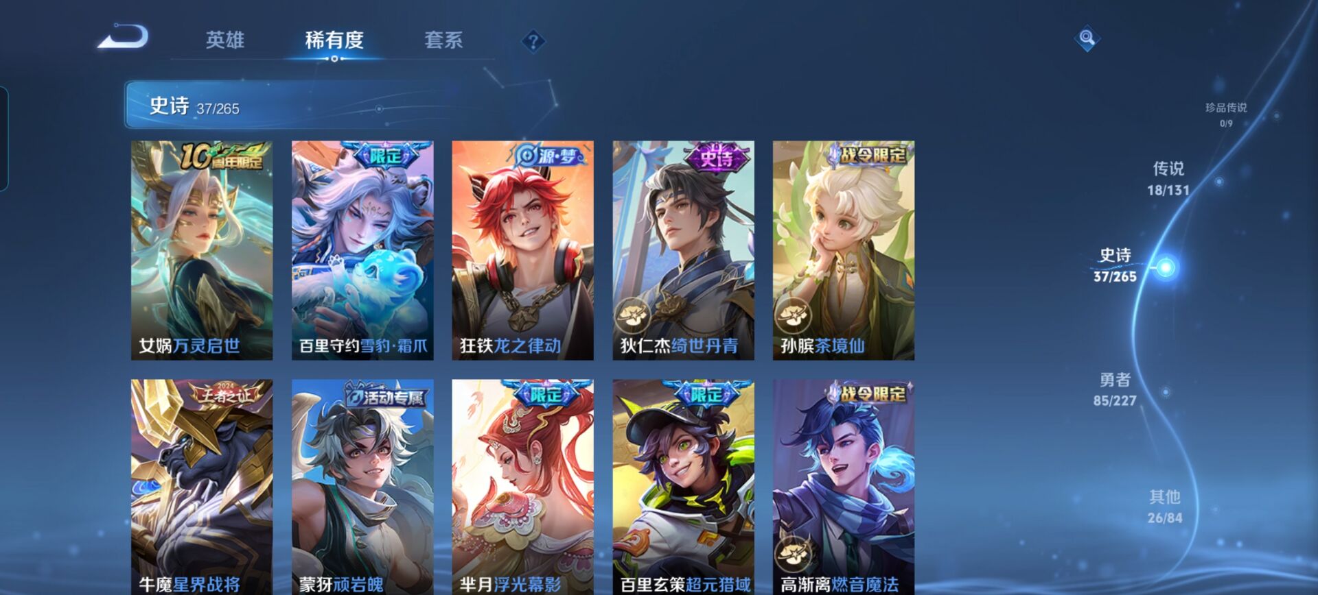 【史诗皮肤】 茶境仙 星界战将 龙之律动 绮世丹青 雪豹·霜爪 浮光幕影 超元猎域 御风骁将 鹤归松栖 浮光幕影 王牌新星 聚星闪耀 布丁狗之约 超元猎域 完美运算 谧流熔炉 漠中幻影 驭风魔法 魅语 幽灵船长 魔