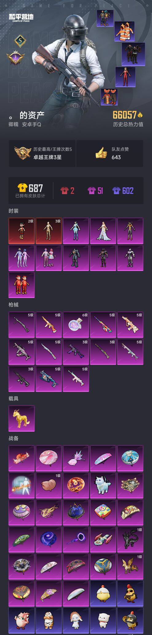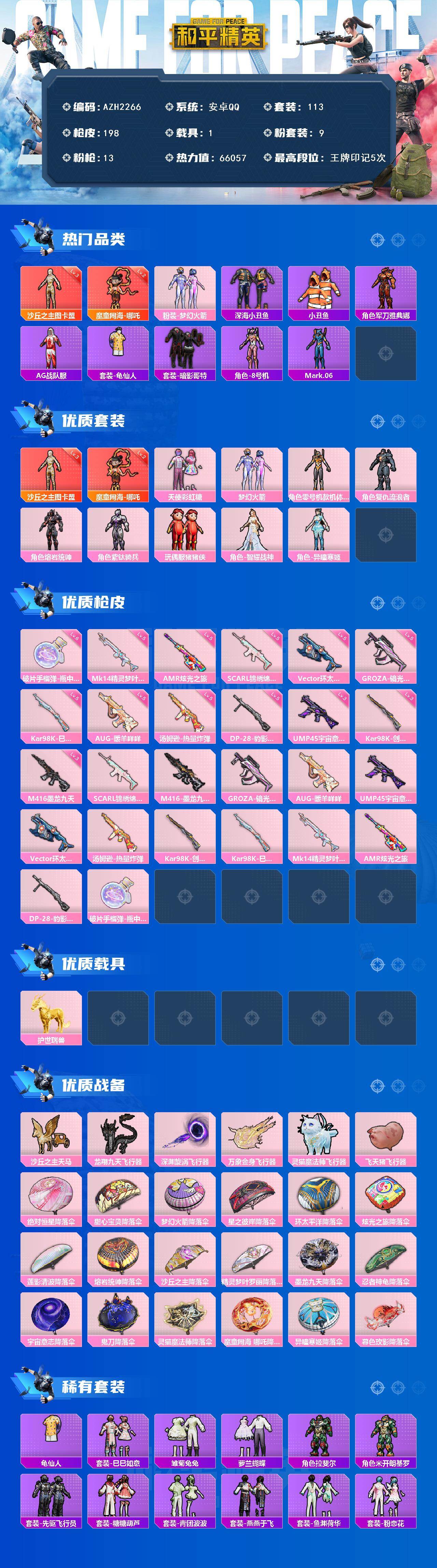 【AZH2266】安卓 手Q【三级图卡盟 二级哪吒 梦幻火箭黄螳螂 深海小丑鱼暗影哥特 1载具】2神装-9粉装-13特效枪-1载具-8粉色飞行器-66057热力值-5王牌印记-113套装-198枪皮