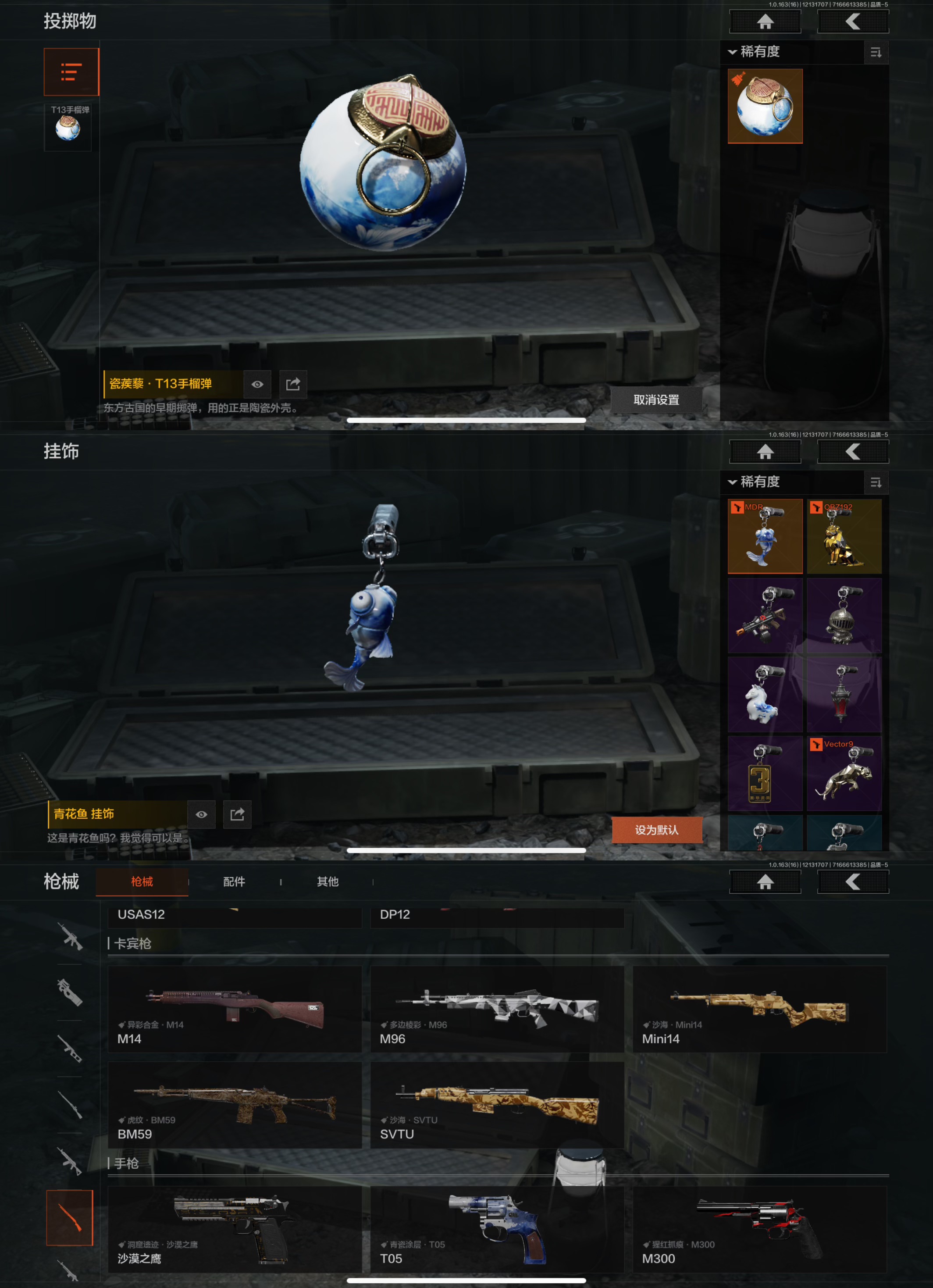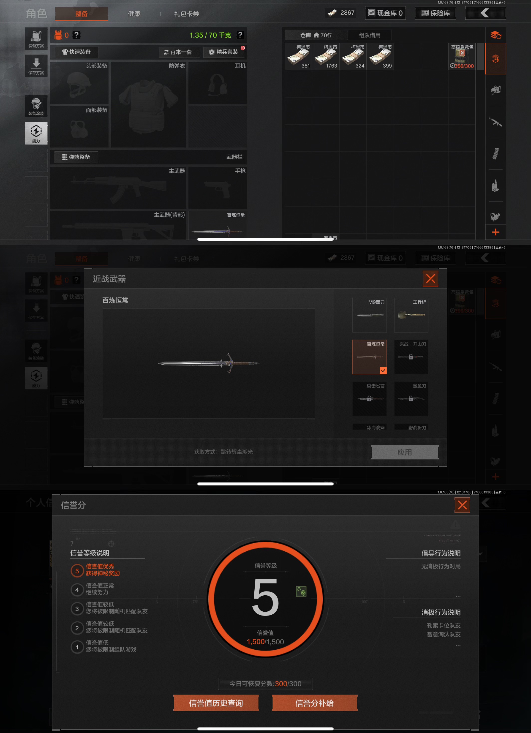 DSTW1749【百炼恒常 3金枪 1金投掷物】苹果Q-等级30-仓库价值5.3k-科恩币2867 【枪皮】骑士之剑·VSS 旧王圣谕·QBZ191 包络战术·AKM 【套装】MILITECH·紧急特派 都市夜影套装 【刀皮】M9军刀 百炼恒常 工兵铲 【投掷物】瓷蒺藜·T13手榴弹 【挂饰】青花鱼 挂饰