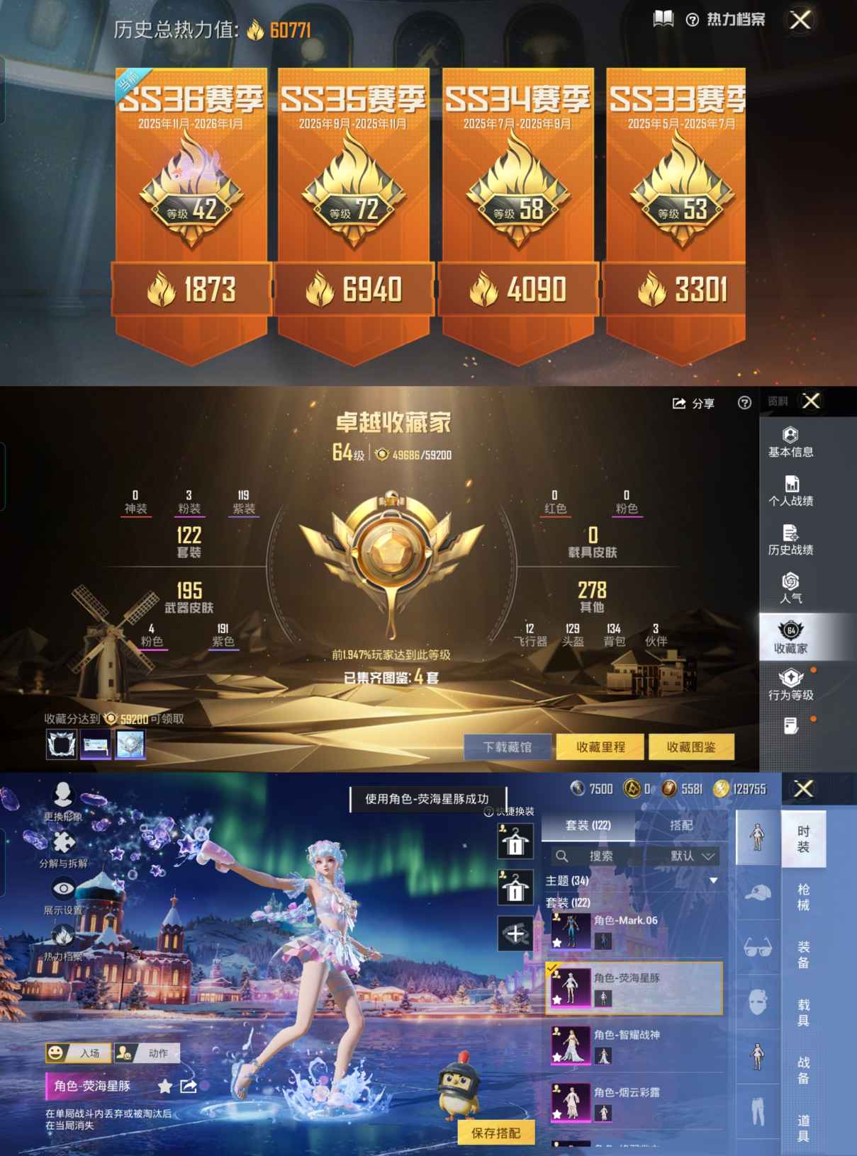 3粉装4特效枪4热门122套装208枪皮 60771热力值 12印记