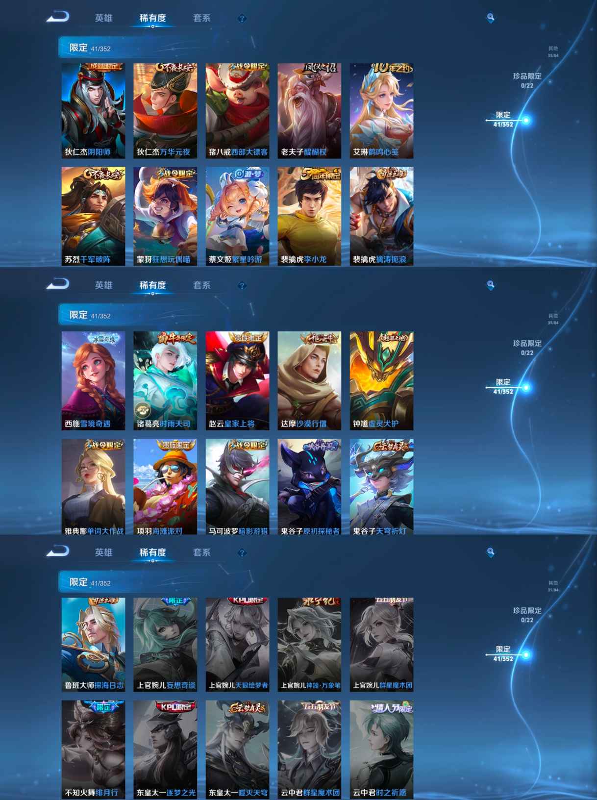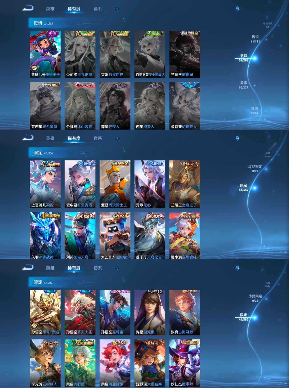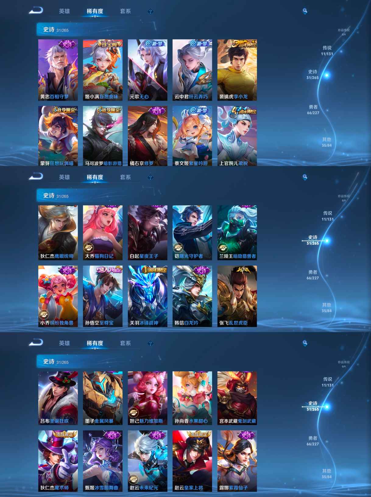 【史诗皮肤】 冰锋战神 电玩小子 至尊宝 聚星闪耀 谧流熔炉 百相守梦 繁星吟游 魅力维加斯 猫狗日记 魔术师 鹰眼统帅 鬼剑武藏 白龙吟 修罗 曙光守护者 暗隐猎兽者 紫霞仙子 圣诞狂欢 暗影游猎 狂想玩偶喵 金属风暴 梁祝 李小龙 水果甜心 缤纷独角兽 纤云弄巧 乱世虎臣 皇家