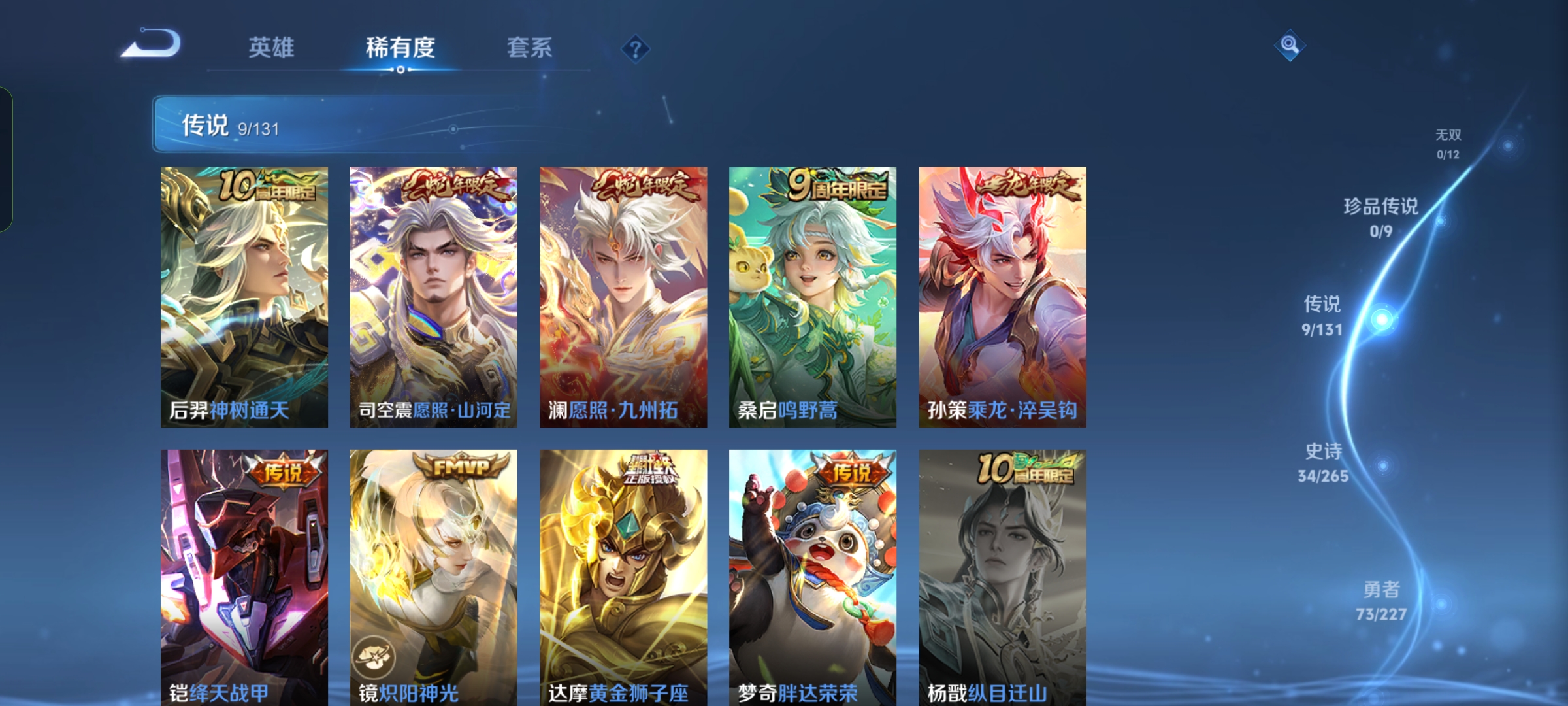 【传说皮肤】 鸣野蒿 乘龙·淬吴钩 愿照·山河定 愿照·九州拓 黄金狮子座 炽阳神光 绛天战甲 胖达荣荣