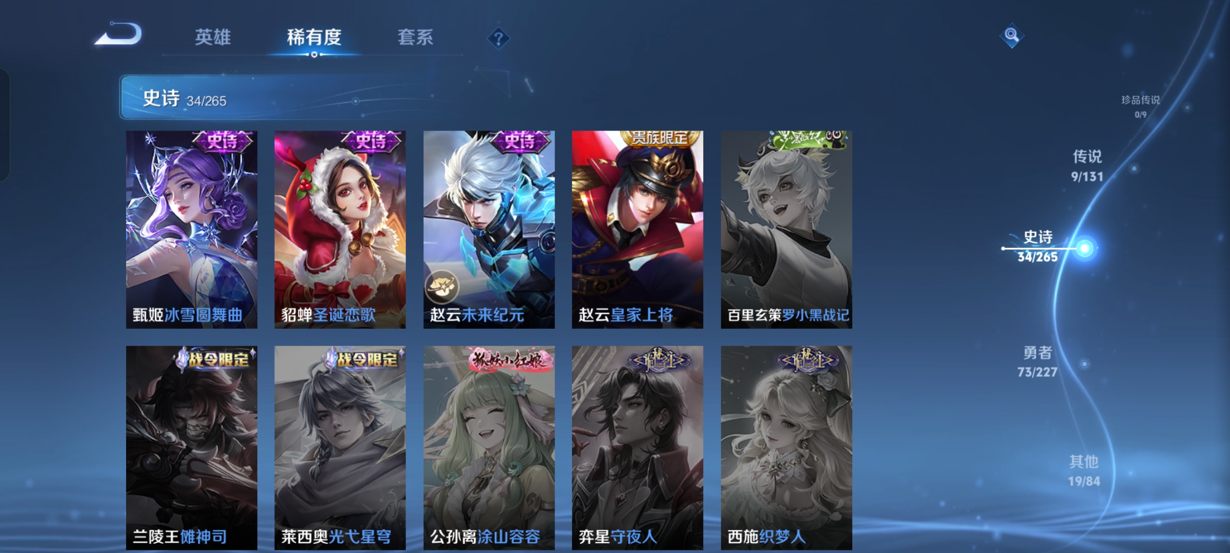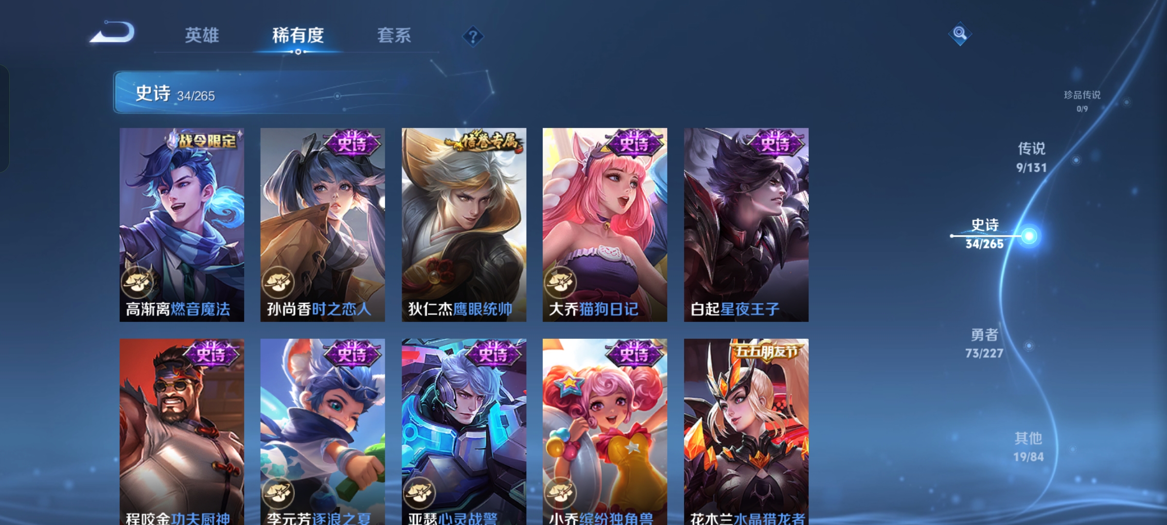 【史诗皮肤】 蔬乡物语 蔬乡物语 破空之剑 星界战将 龙之律动 绮世丹青 敬我三分 狼魂孤将 布丁狗之约 完美运算 谧流熔炉 漠中幻影 百相守梦 功夫厨神 女仆咖啡 魅力维加斯 猫狗日记 魔术师 鹰眼统帅 圣诞恋歌 鬼剑武藏 水晶猎龙者 千年之狐 逐浪之夏 圣诞狂欢 末日机甲 金属风暴 水果甜