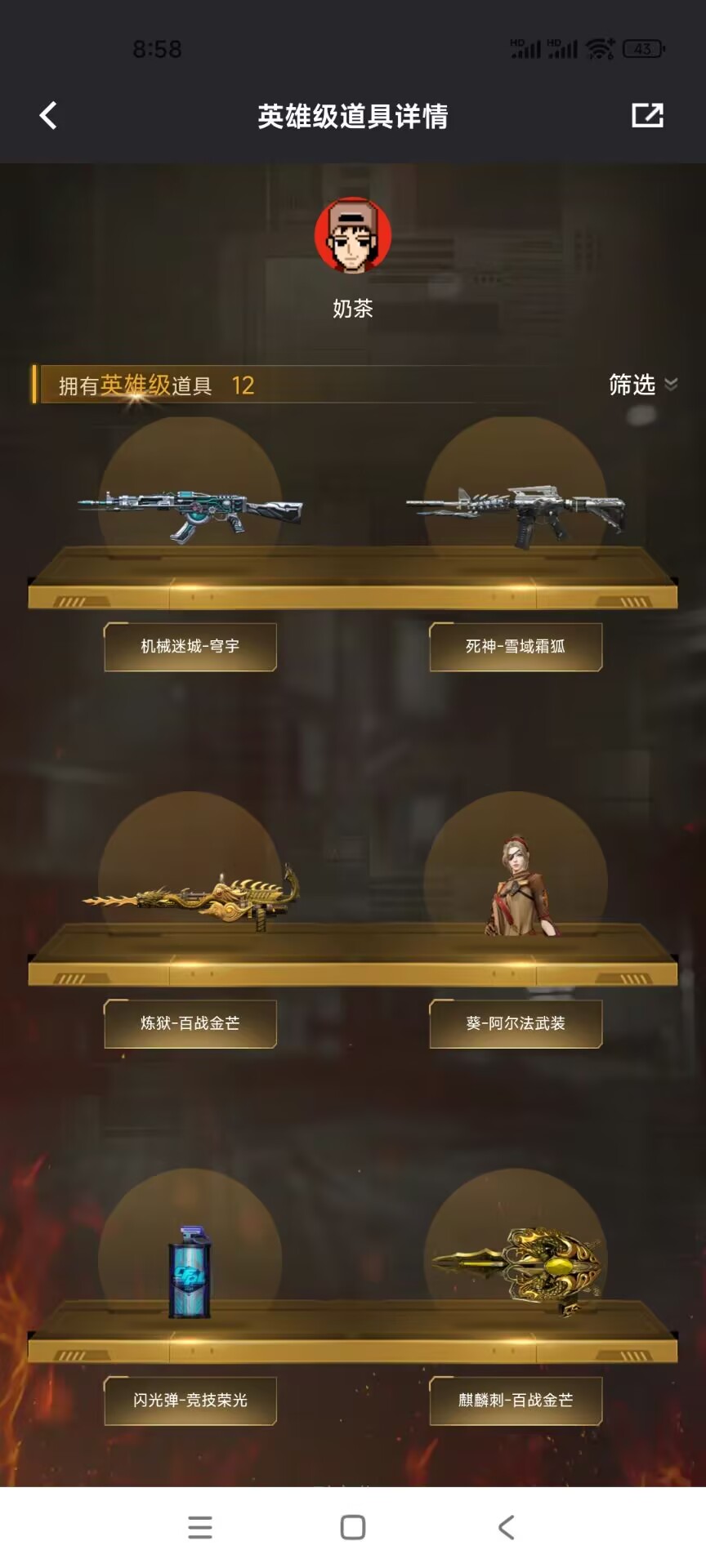 【英雄级武器】Barrett-碧霄极光 M4A1-千变 Barrett-碧霄极光 炼狱-百战金芒 机械迷城-穹宇 麒麟刺-百战金芒 M4A1-再燃火线 死神-雪域霜狐 擎天-竞技荣光 闪光弹-竞技荣光