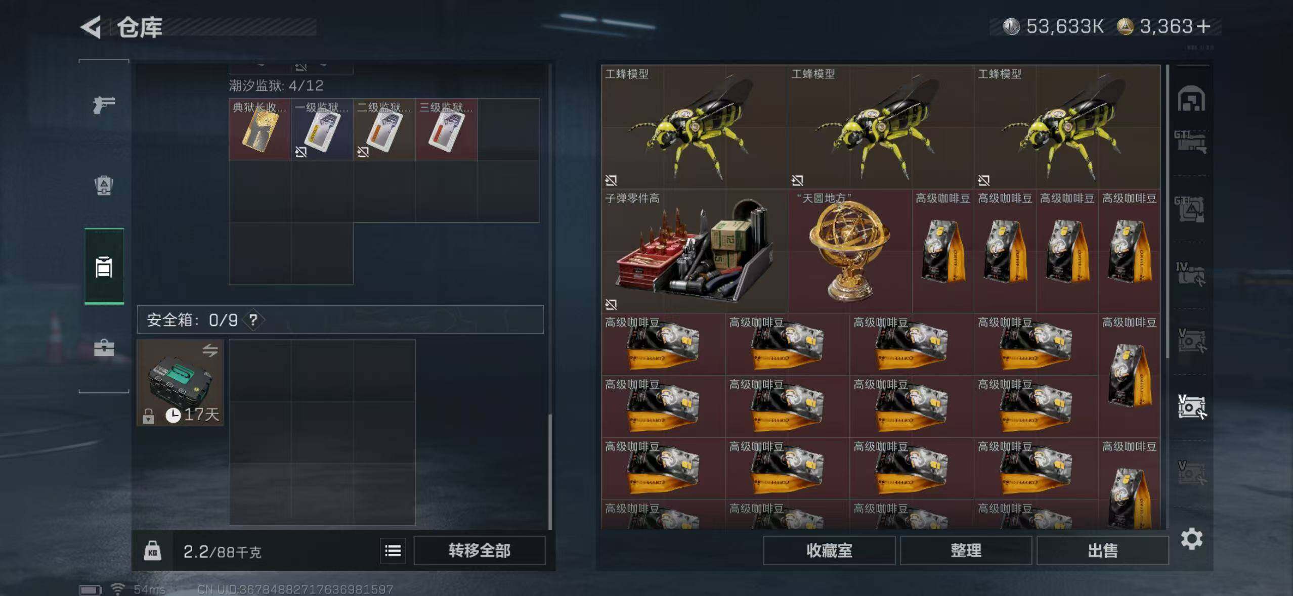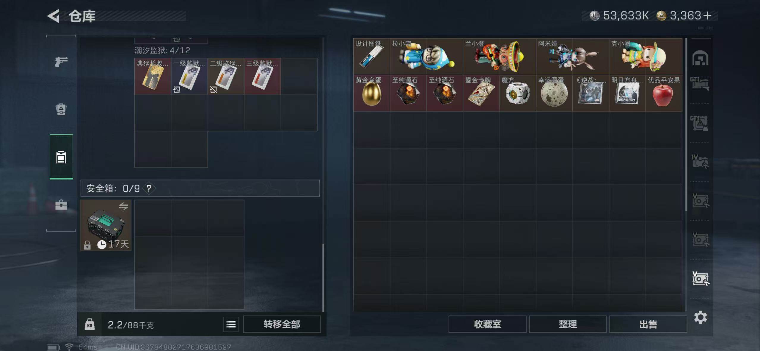 【SJ859】满体满负满仓三角币:3075行动等级:60 总资产:307.6M 哈夫币:5363.4W 近战武器:近战武器-北极星 干员皮肤:电锯惊魂,送葬人·无题密令,维什戴尔,黑·天际线 安全箱:顶级安全箱9(3x3) 满部门