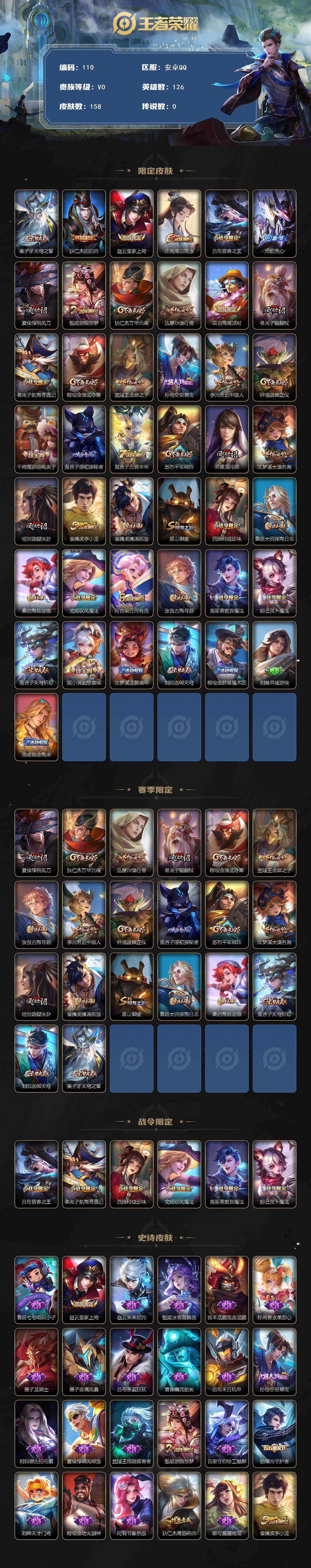【贵族V5 126英雄 158皮肤 至尊宝】安卓Q-永恒钻石V-126英雄-158皮肤-32史诗