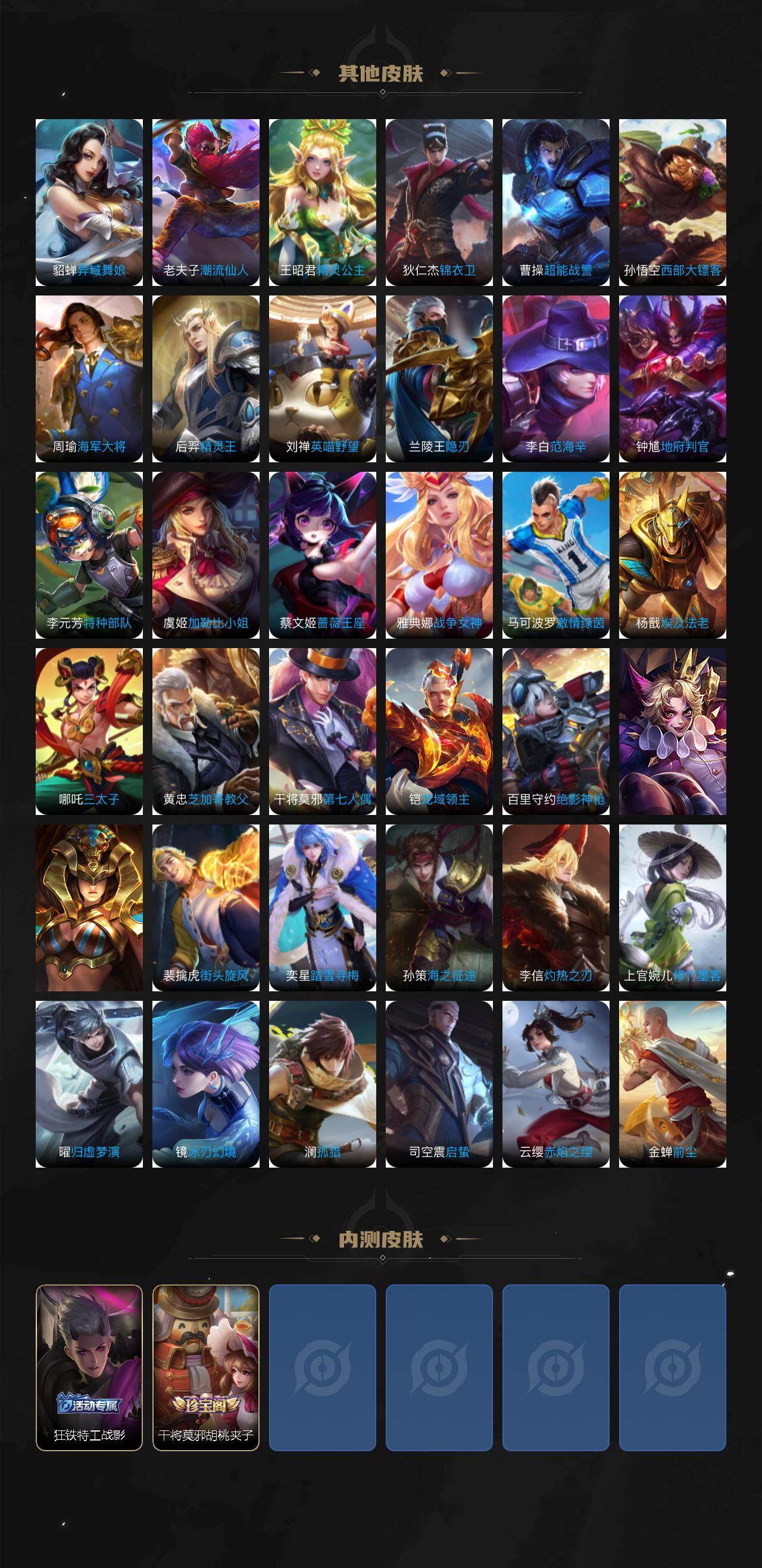 【史诗皮肤】 谧流熔炉 电玩小子 至尊宝 威尼斯狂欢 聚星闪耀 江河有灵 驭风魔法 幽灵船长 功夫厨神 鹰眼统帅 鬼剑武藏 曙光守护者 暗隐猎兽者 航海奇遇记 德古拉伯爵 天才门将 圣诞狂欢 末日机甲 金属风暴 龙骑士 晚萤 李小龙 水果甜心 乘风破浪 皇家上将 冰雪圆舞曲 游园惊梦 高山流水 无心 五谷丰年 未来纪元 节奏热浪 特工魅影