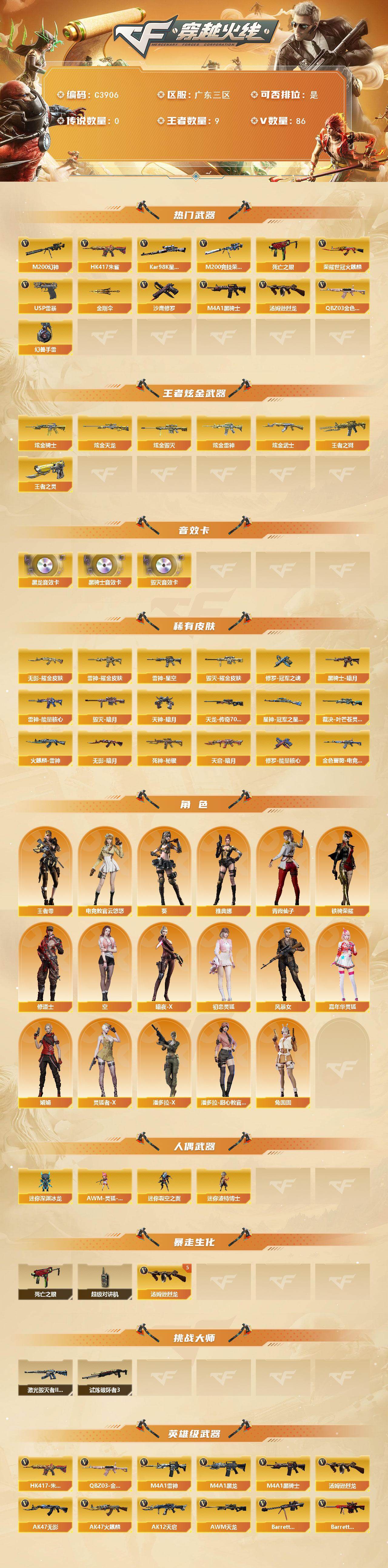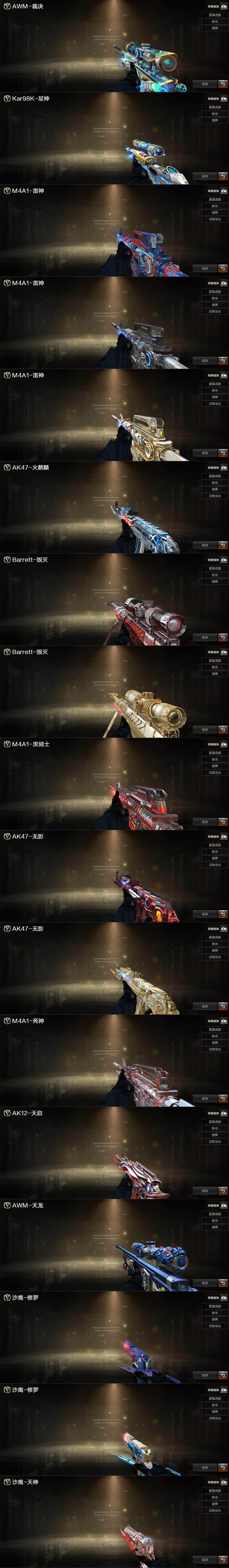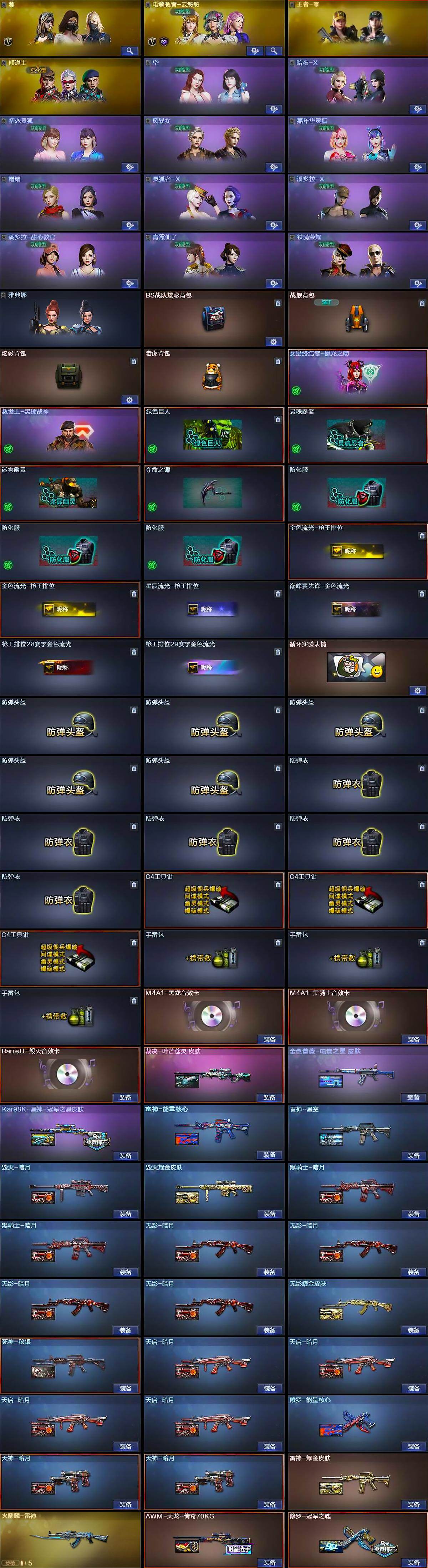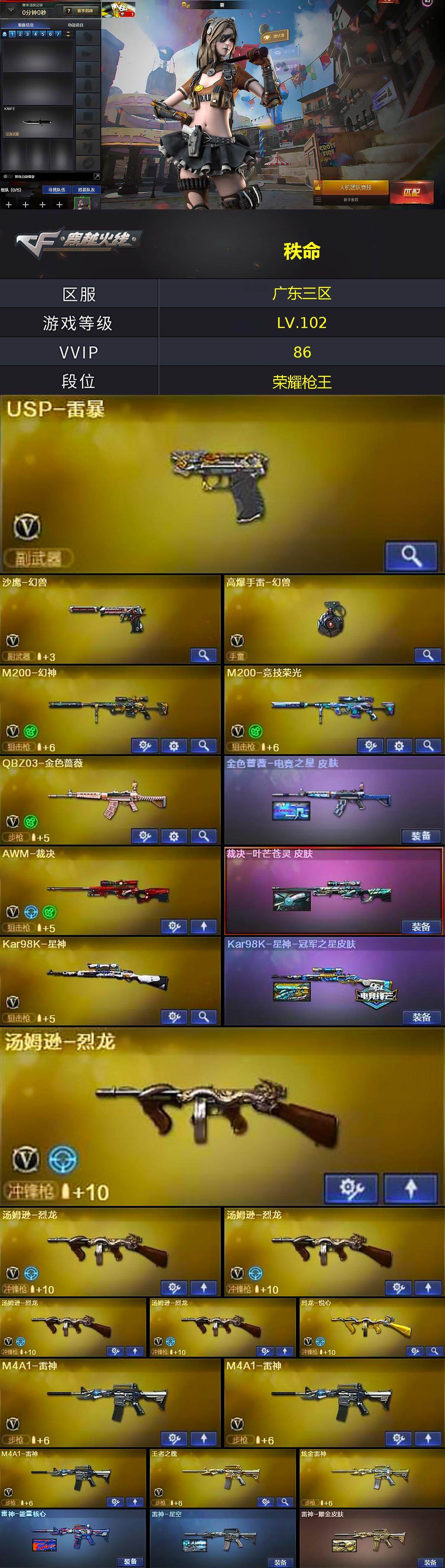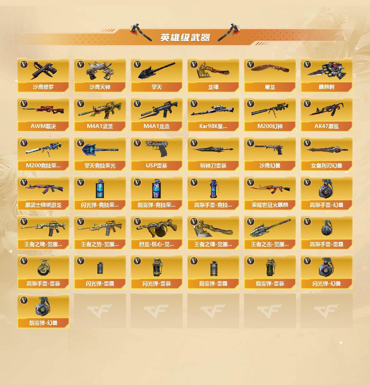 【热门武器】:QBZ03-金色蔷薇,HK417-朱雀,M200-幻神,M200-竞技荣光,死亡之眼,荣耀世冠-火麒麟,Kar98K-星神,M4A1-黑骑士*3,汤姆逊-烈龙*5,USP-雷暴,沙鹰-修罗,金刚伞,高爆手雷-幻兽