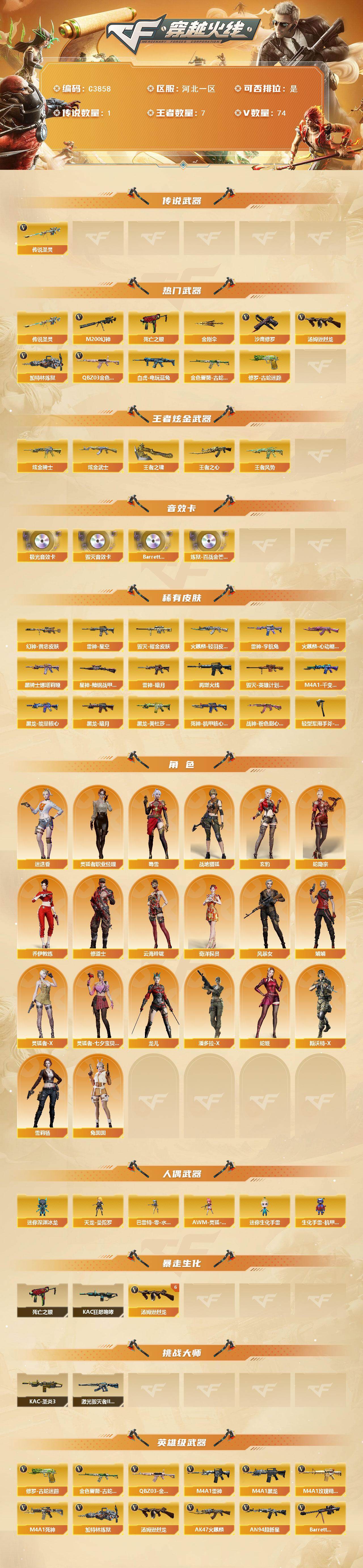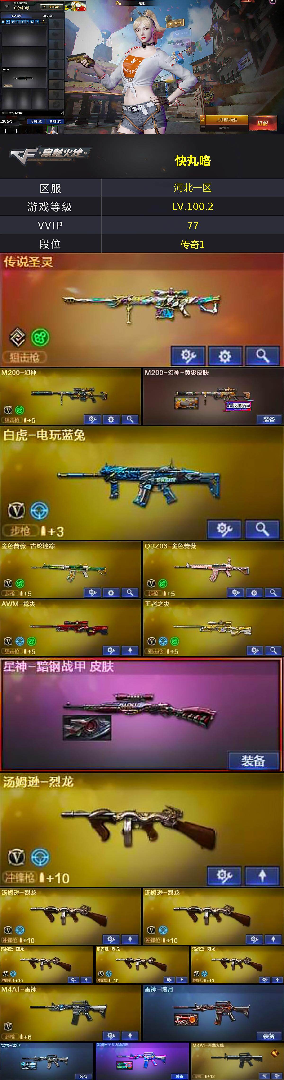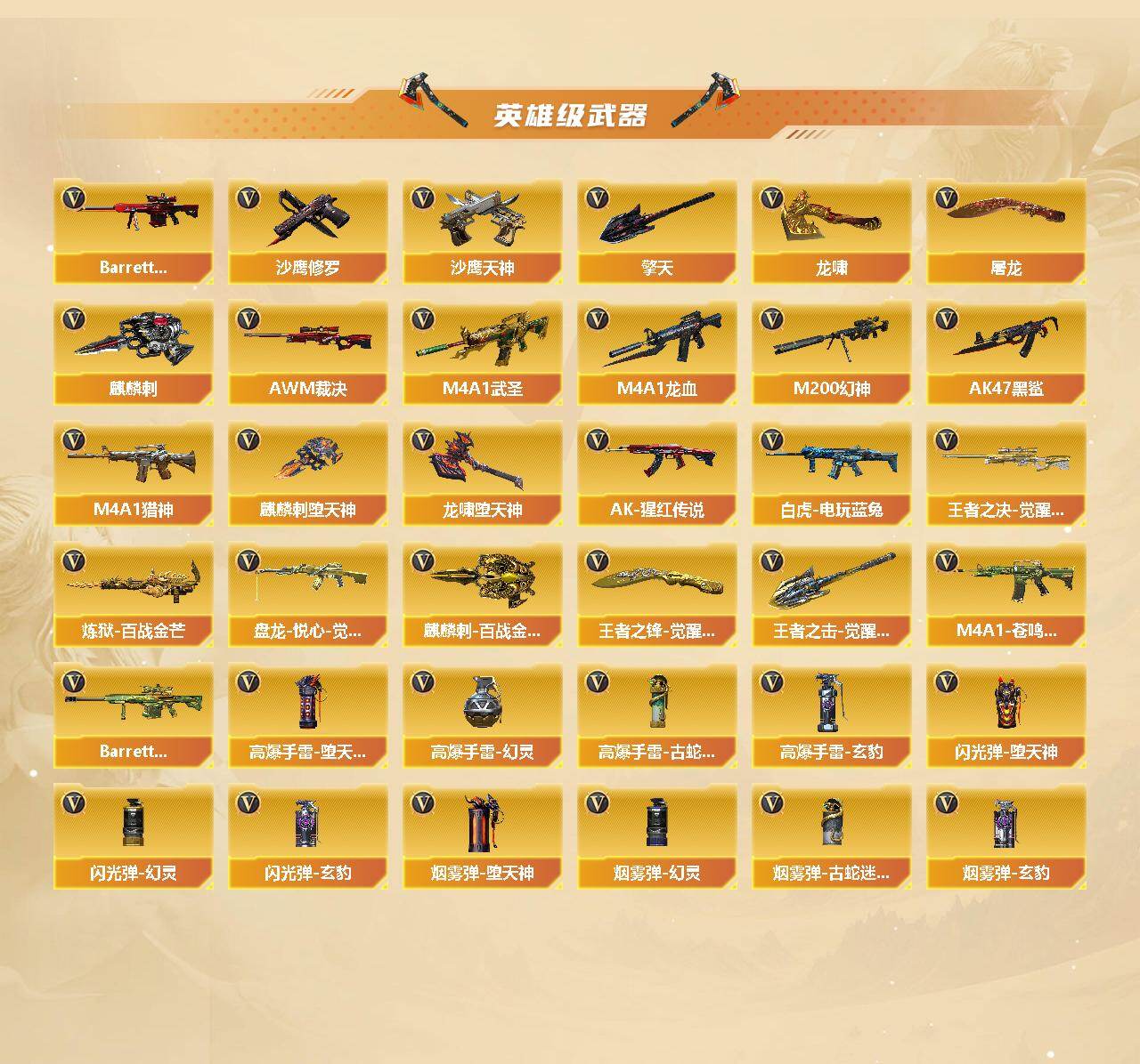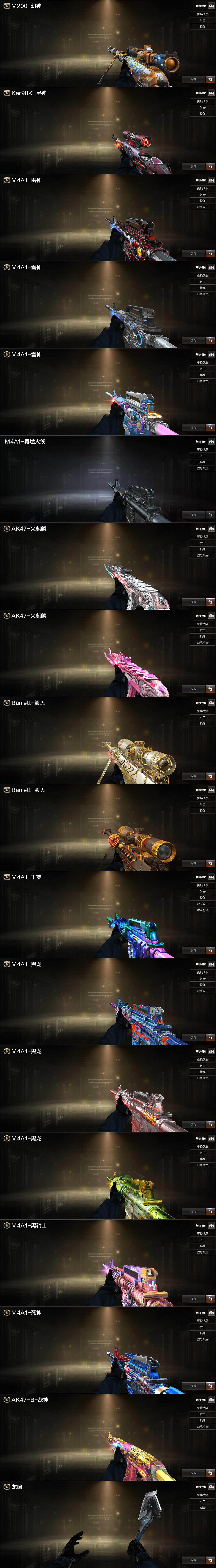 【热门武器】:传说圣灵,QBZ03-金色蔷薇,M200-幻神,金色蔷薇-古蛇迷踪,修罗-古蛇迷踪,死亡之眼*2,白虎-电玩蓝兔,汤姆逊-烈龙*6,加特林-炼狱*3,沙鹰-修罗*2,金刚伞