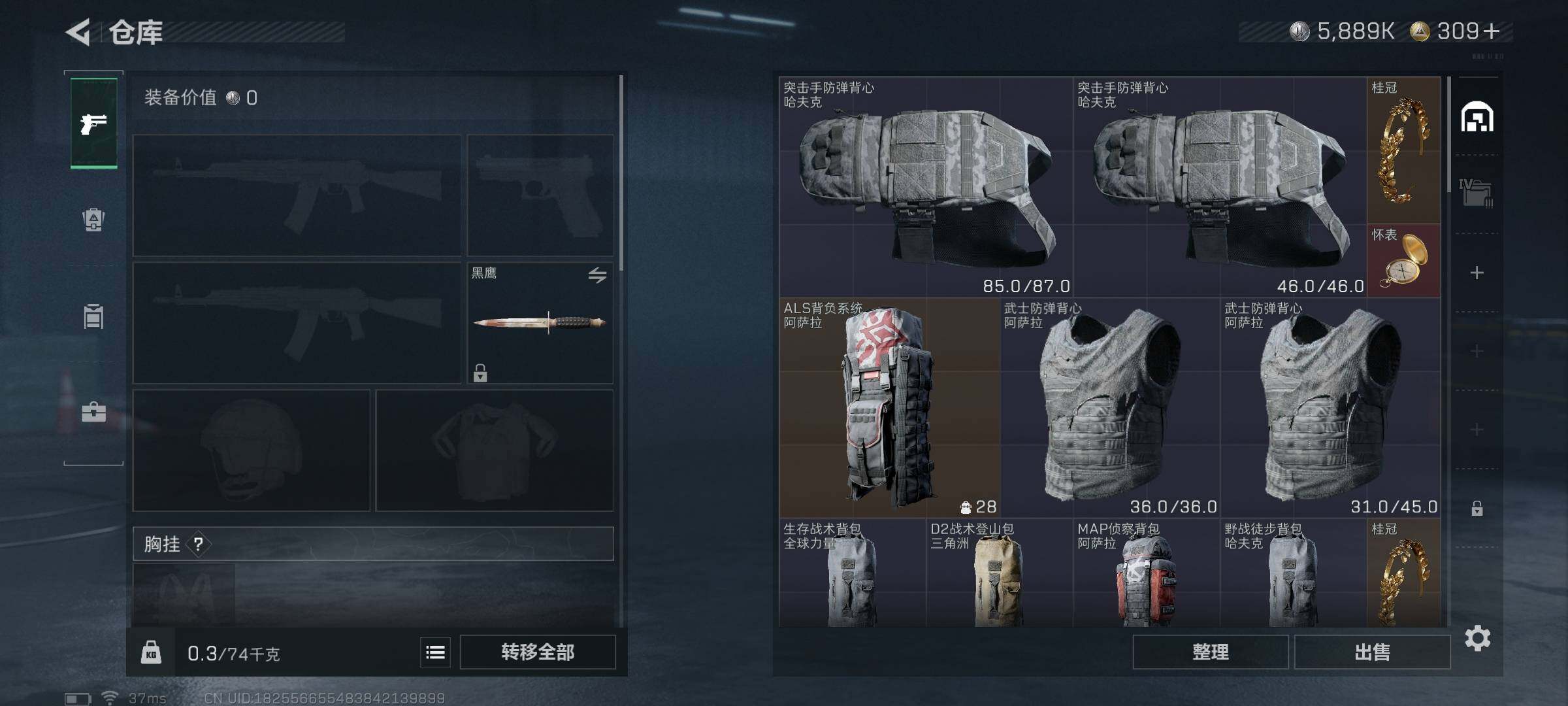 总资产(M):30M/哈夫币(K):5889K/传说枪皮数:2/全面战场等级:25_段位:军士长/烽火地带等级:45_段位:铂金