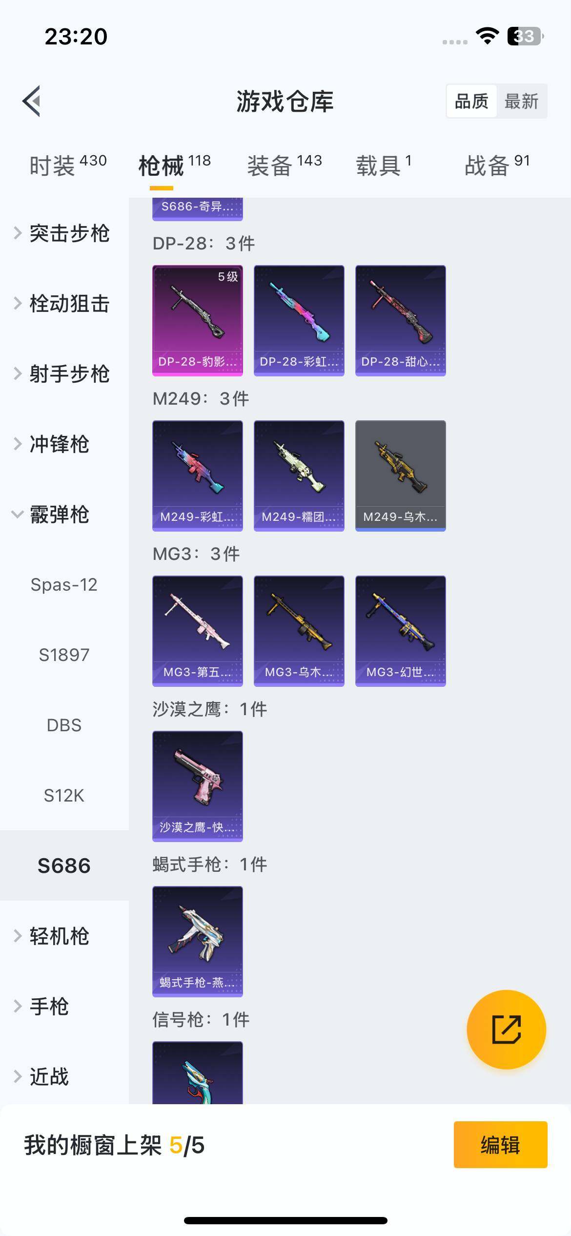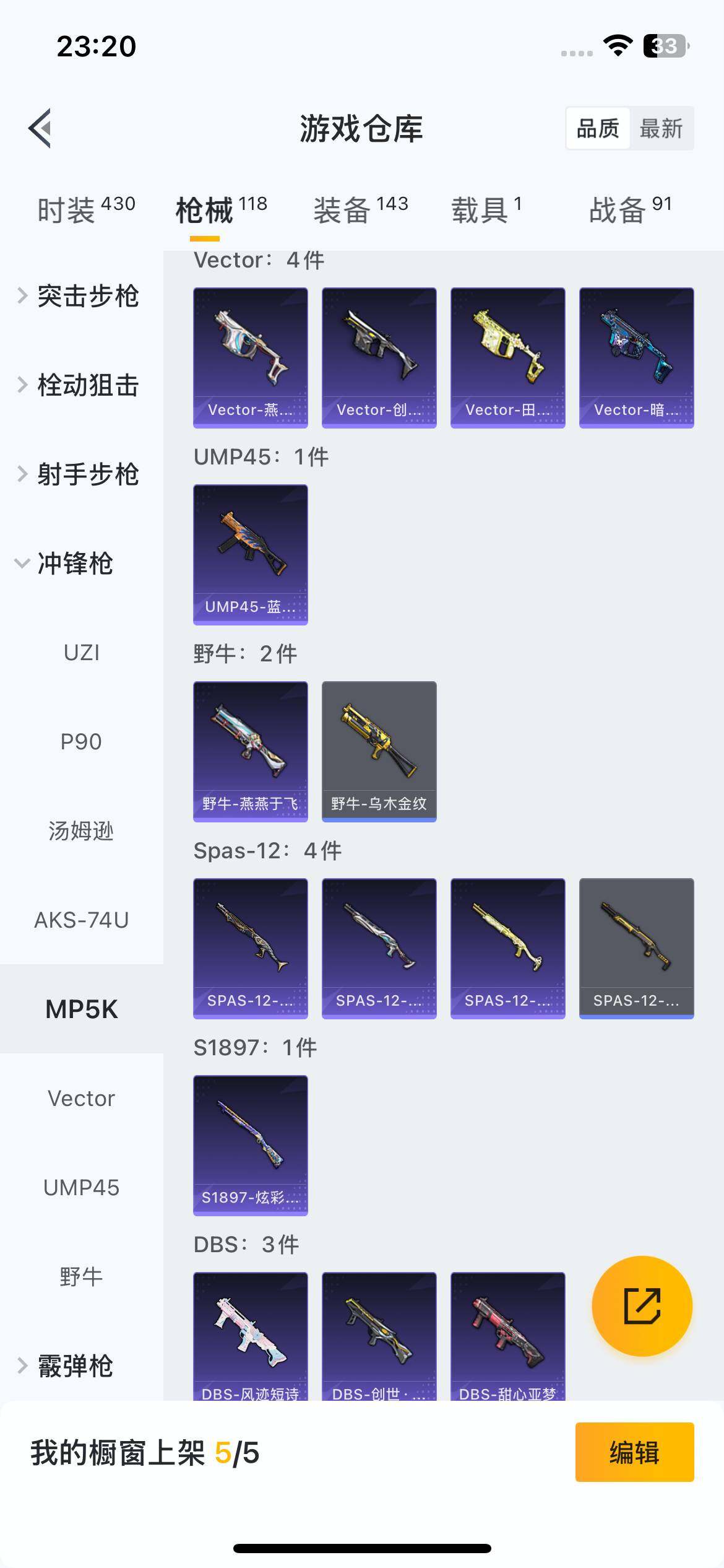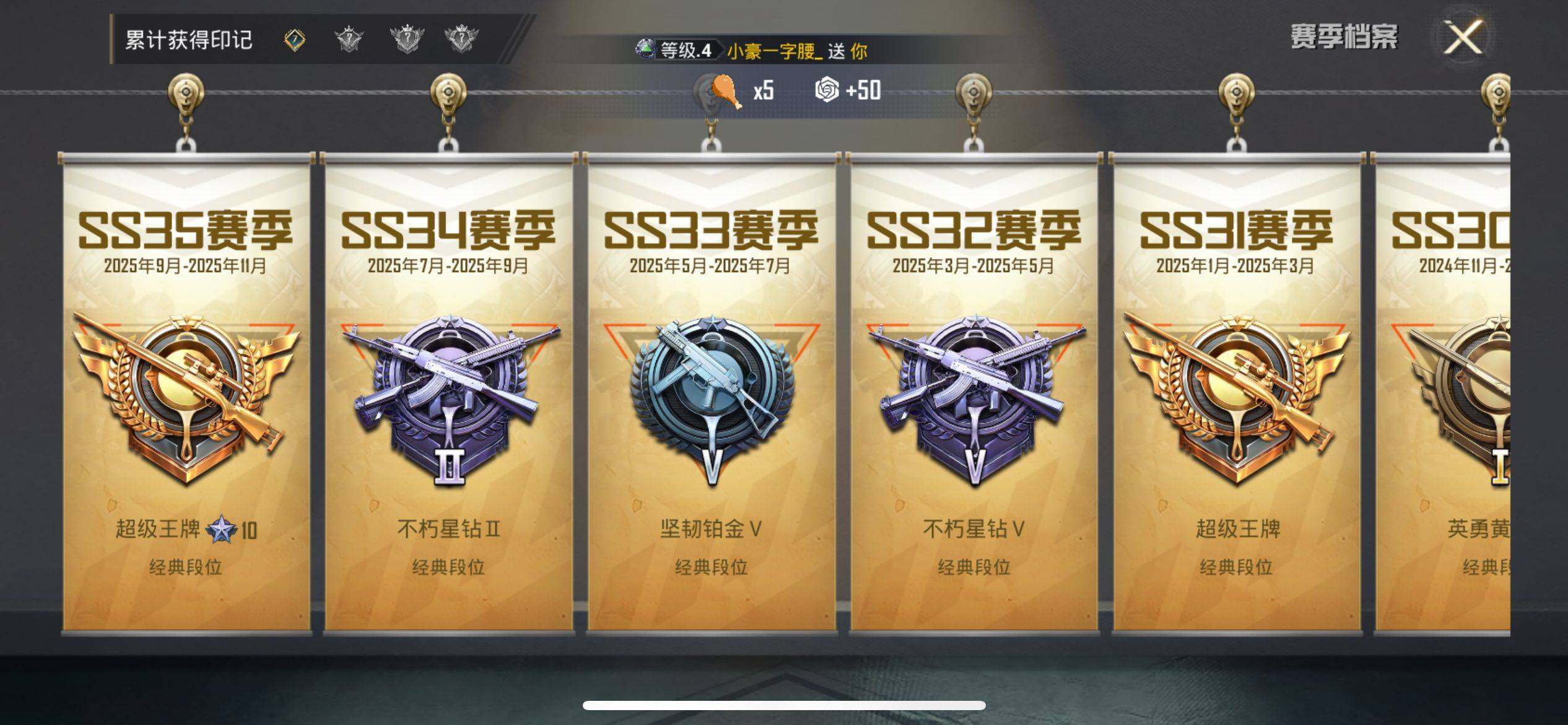 111套装/枪械2/装备143/载具1/战备91/王牌印记7/热力值37605/