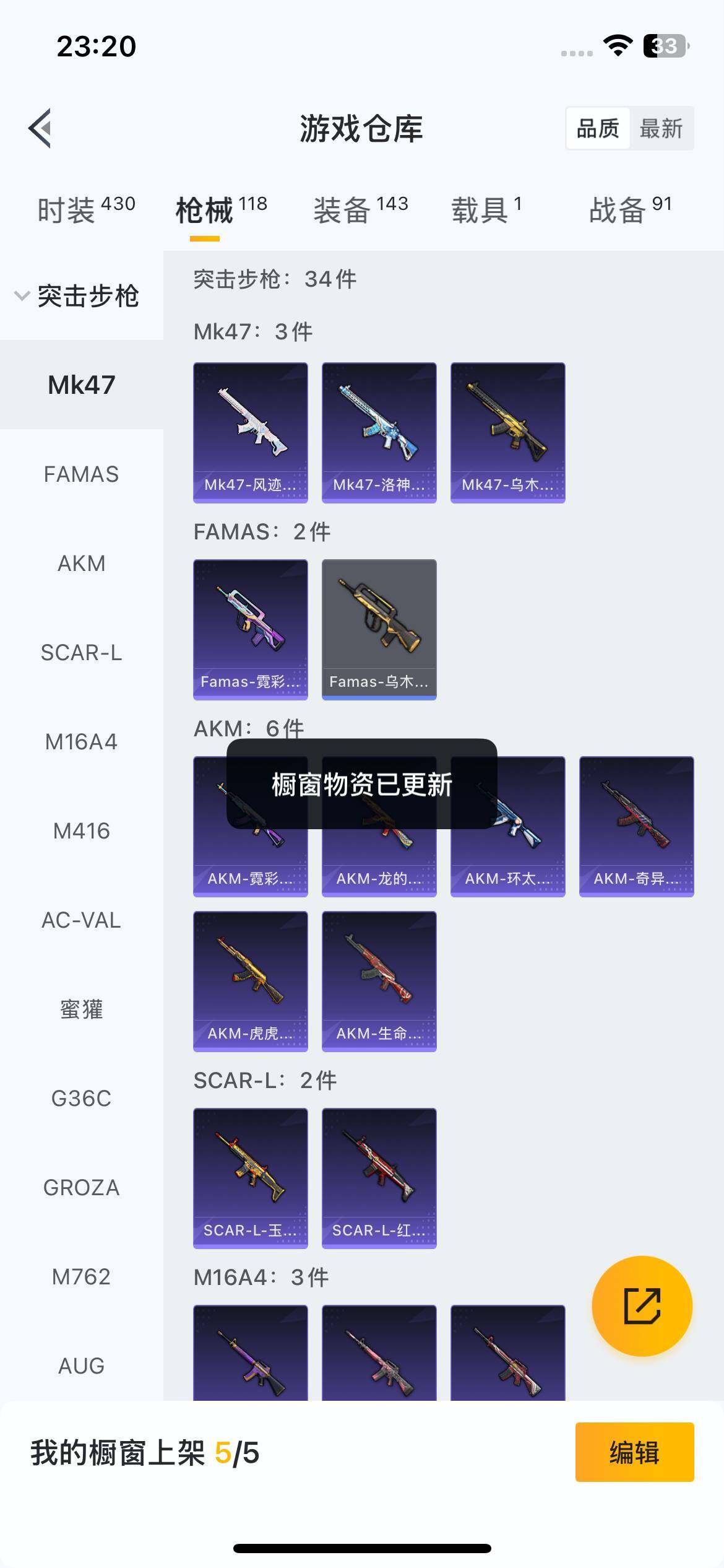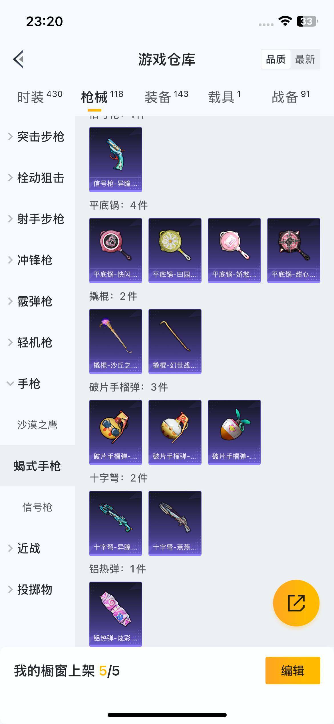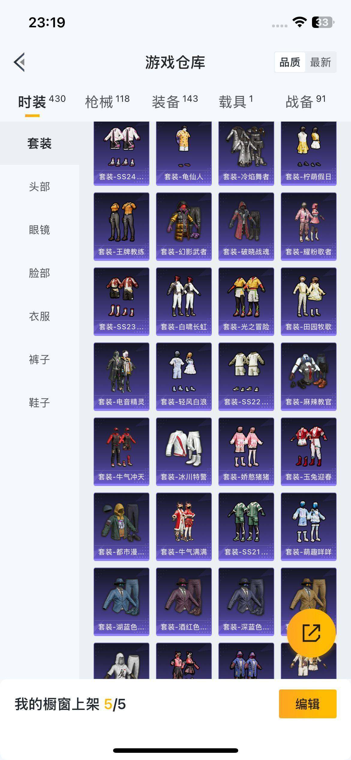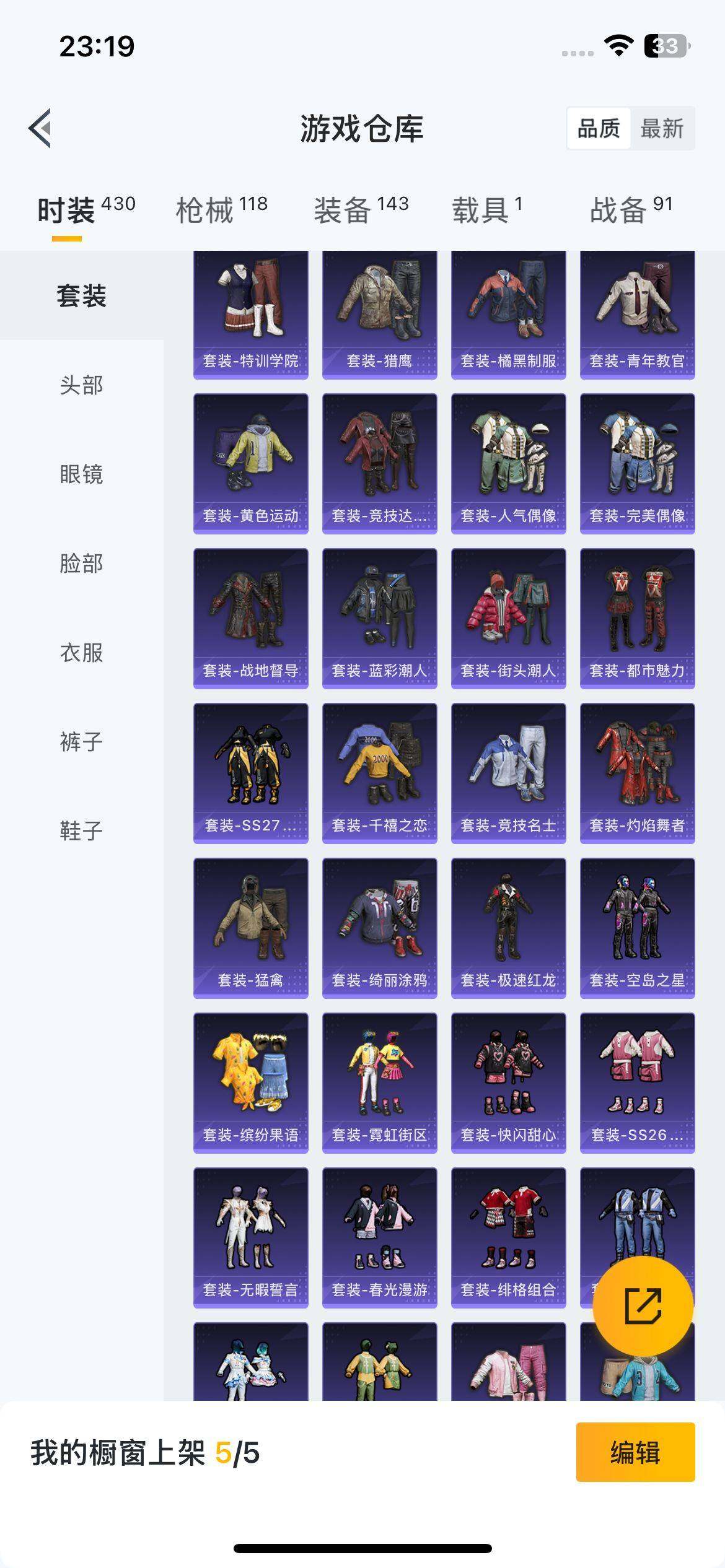 111套装/枪械2/装备143/载具1/战备91/王牌印记7/热力值37605/