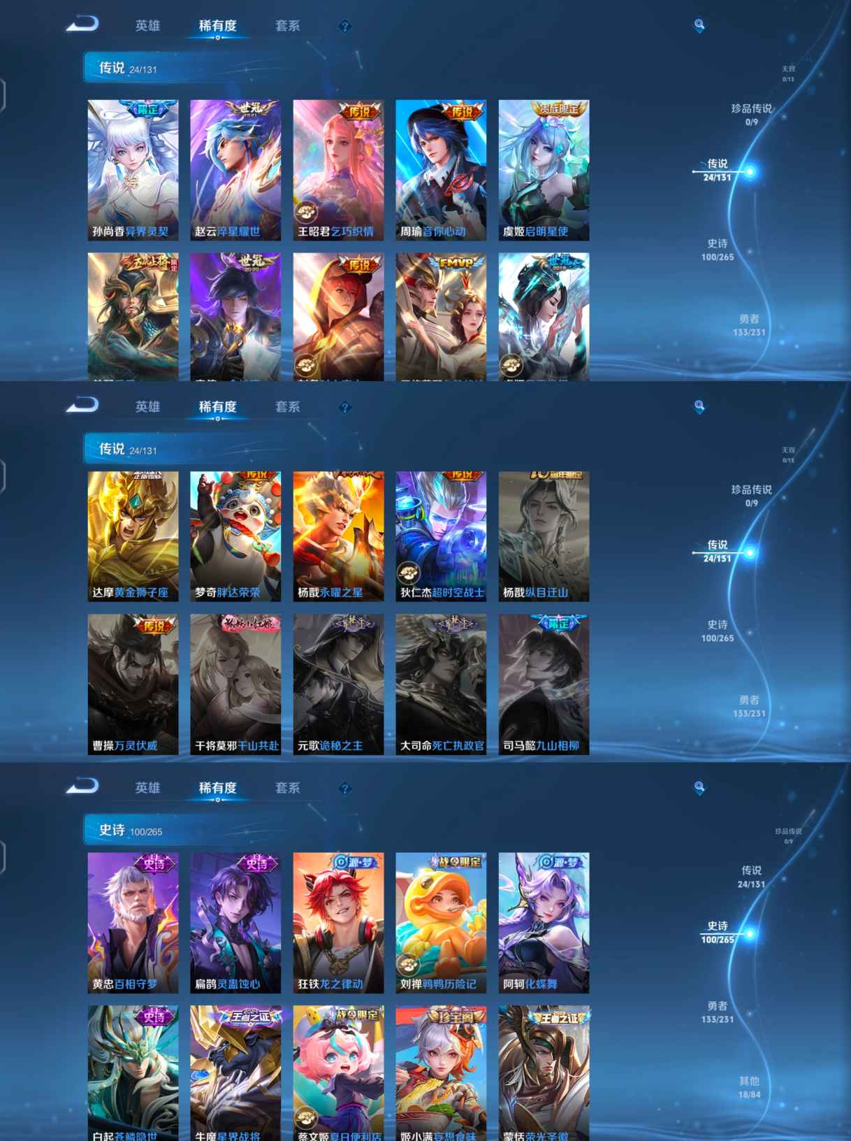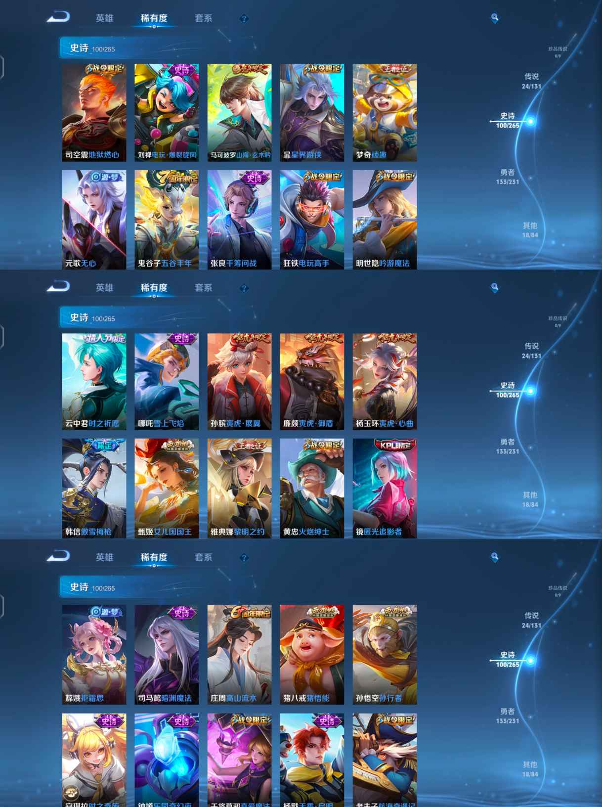【传说皮肤】 鸣野蒿 逐花归海 愿照·山河定 山海·炽霜斩 黄金狮子座 超时空战士 久胜战神 武圣 一念神魔 时之恋人 寅虎·瑞焰 胖达荣荣 补天 寅虎·赤拳 异界灵契 乞巧织情 永曜之星 时之祈愿 云霓雀翎 启明星使 淬星耀世 音你心动 怒海麟威