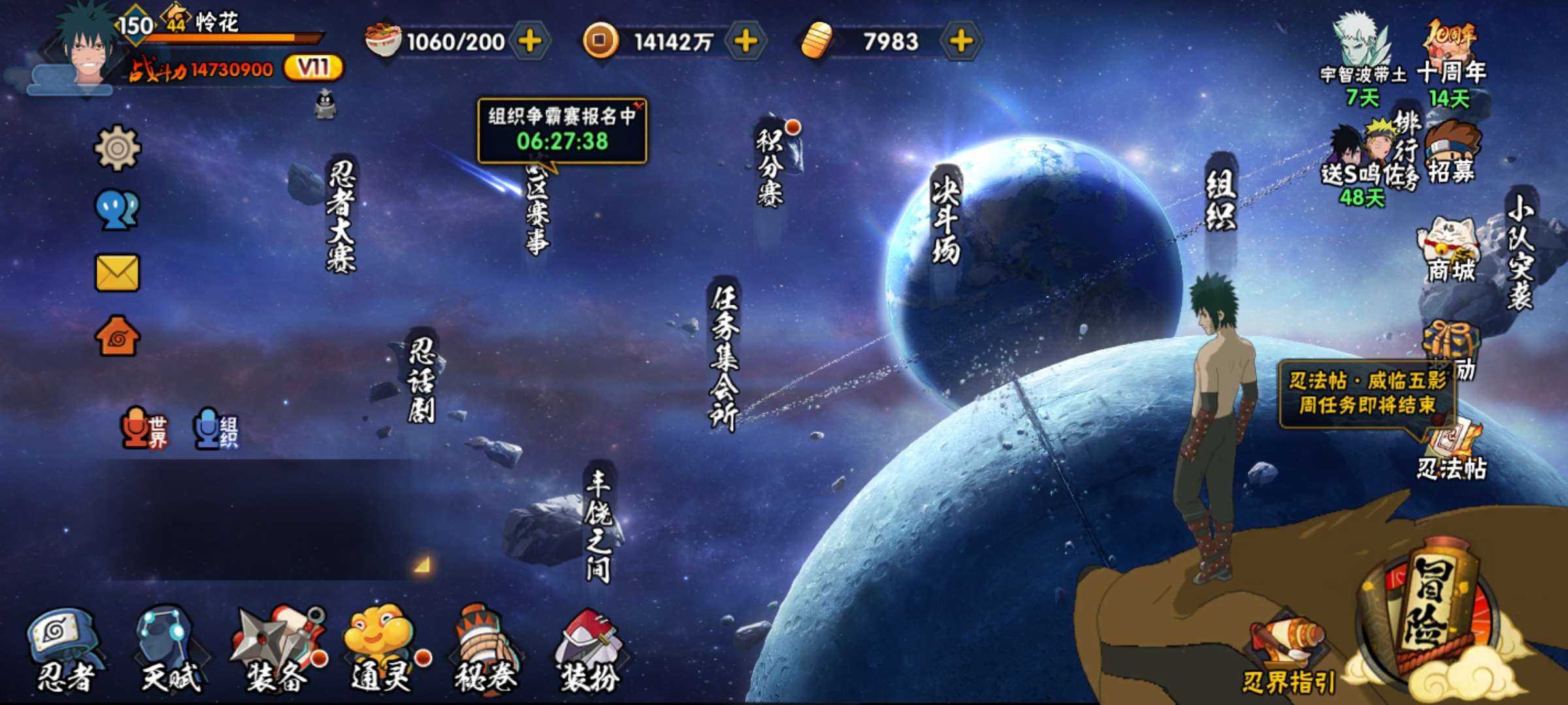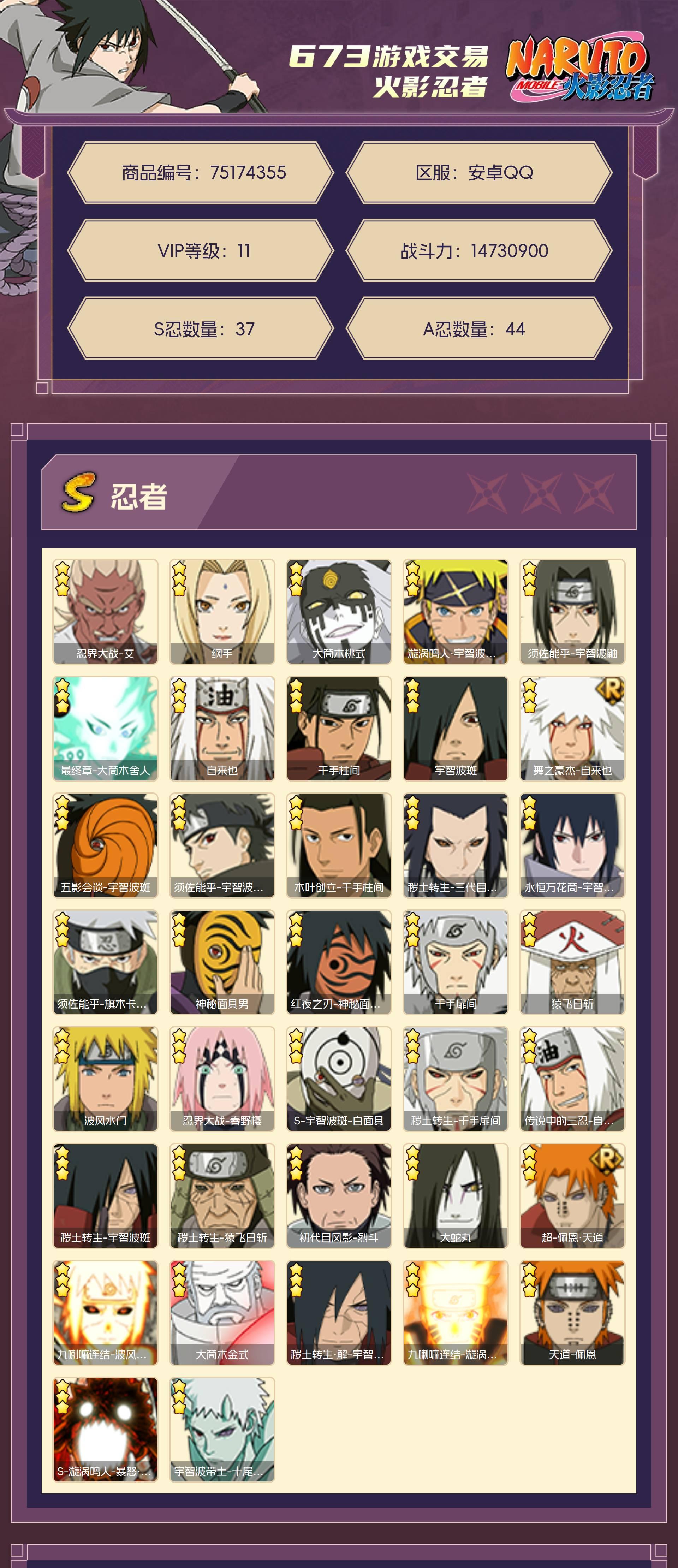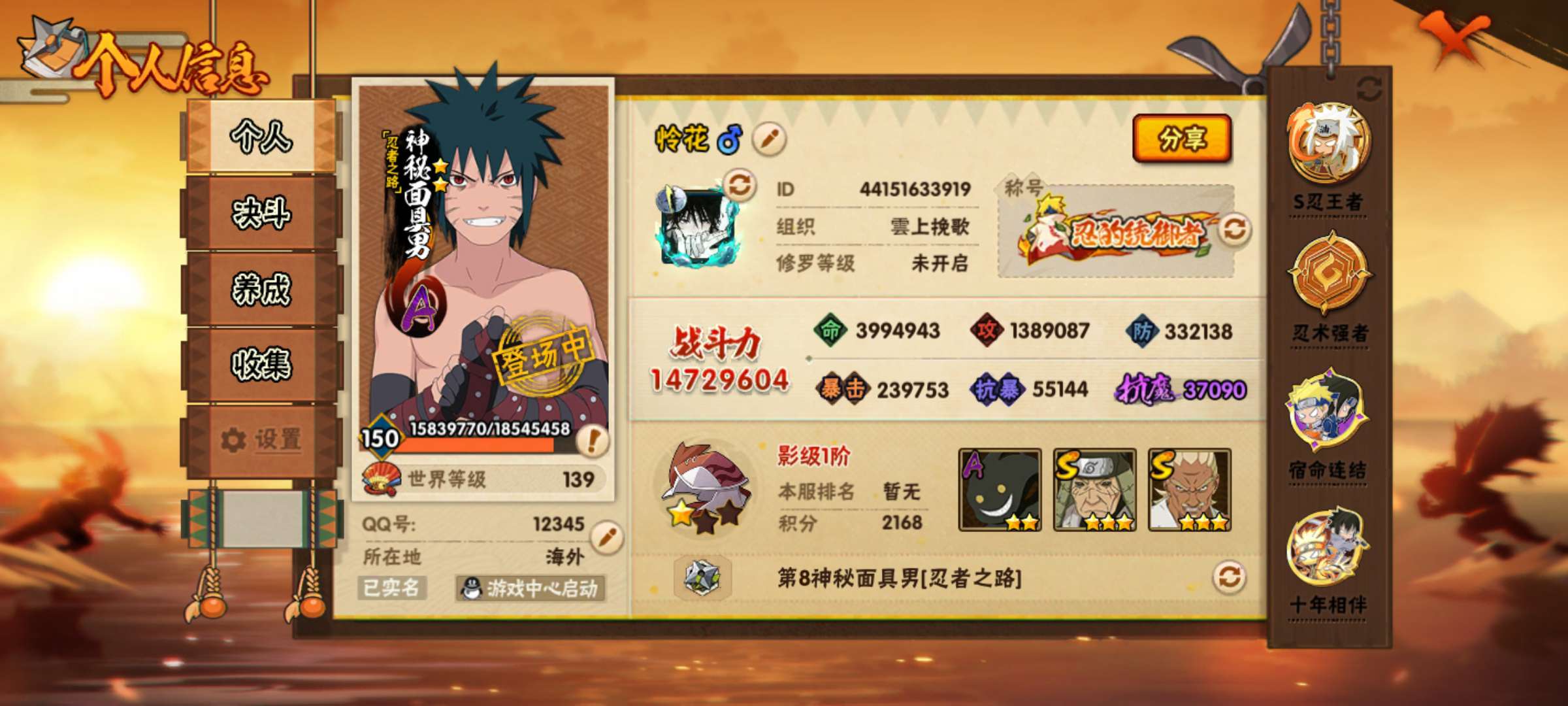 角色等级150 金币7900 战斗力14730900 S忍37 A忍44 11 段位影级