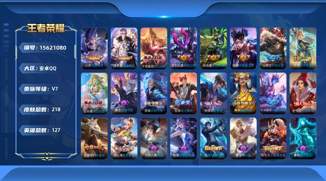 V7 2典藏 6传说 127英雄 218皮肤 可修改实名 万战小乔 海月