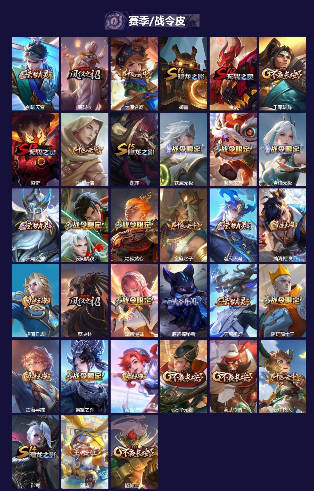 【传说皮】游龙清影(小青龙),黄金射手座,仲夏夜之梦(大飞蛾),一念神魔,淬星耀世,久胜战神,云鹰飞将(小将军),炽阳神光,无双飞将,音你心动-周瑜,乞巧织情,时之恋人-刘备(电焊工),绛天战甲(鸡嘴战神),碎云