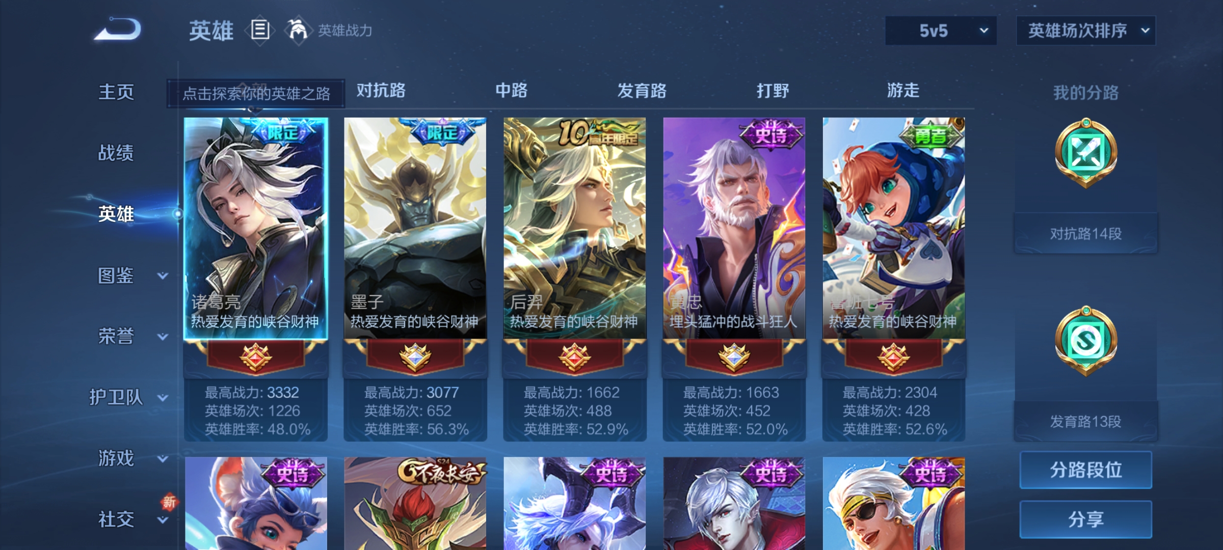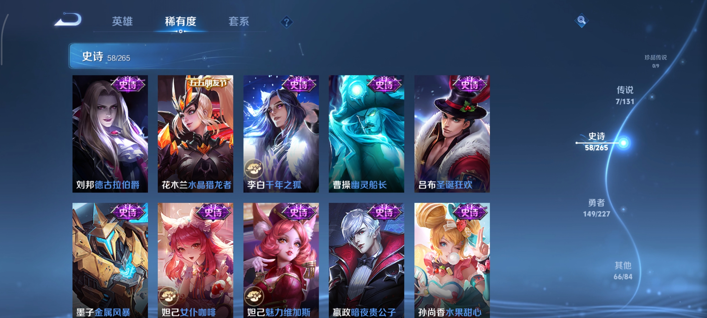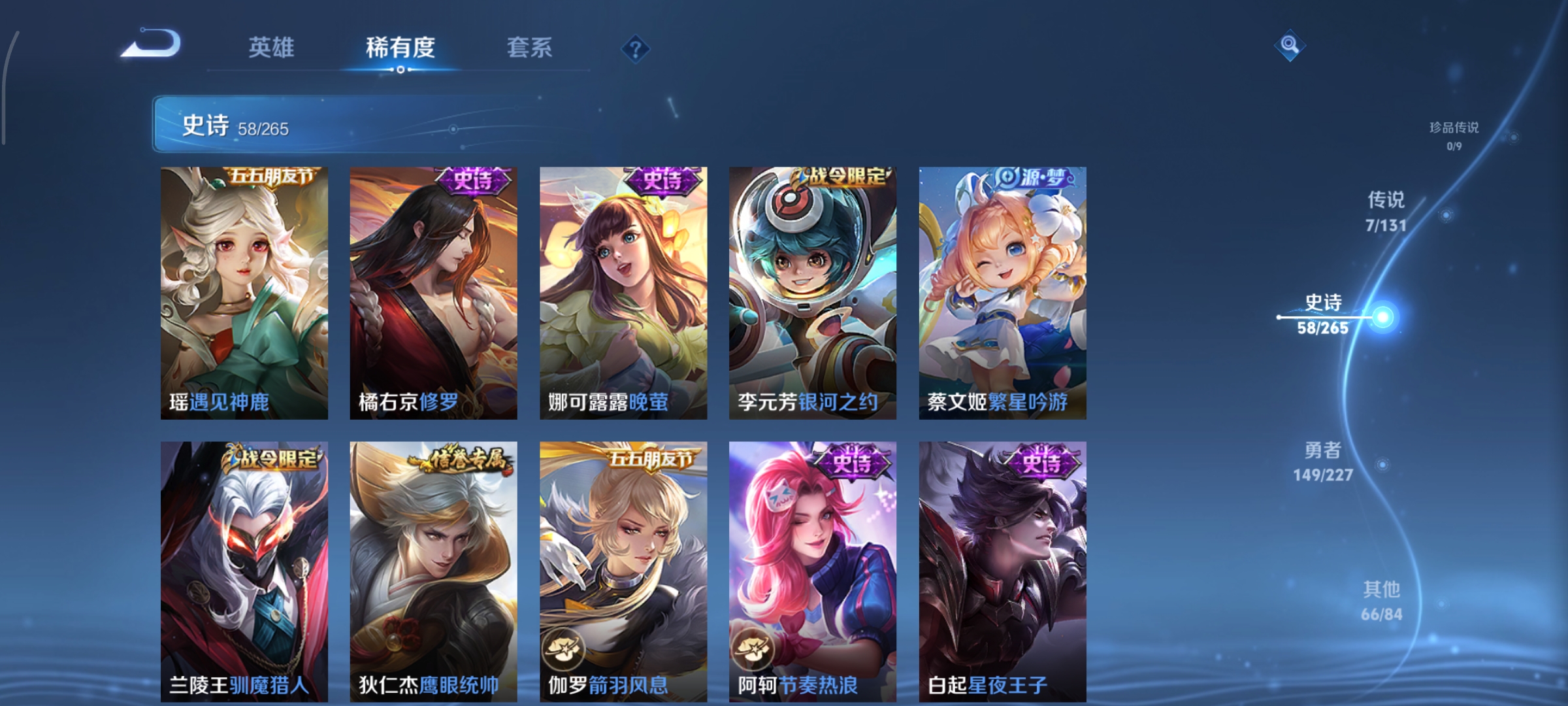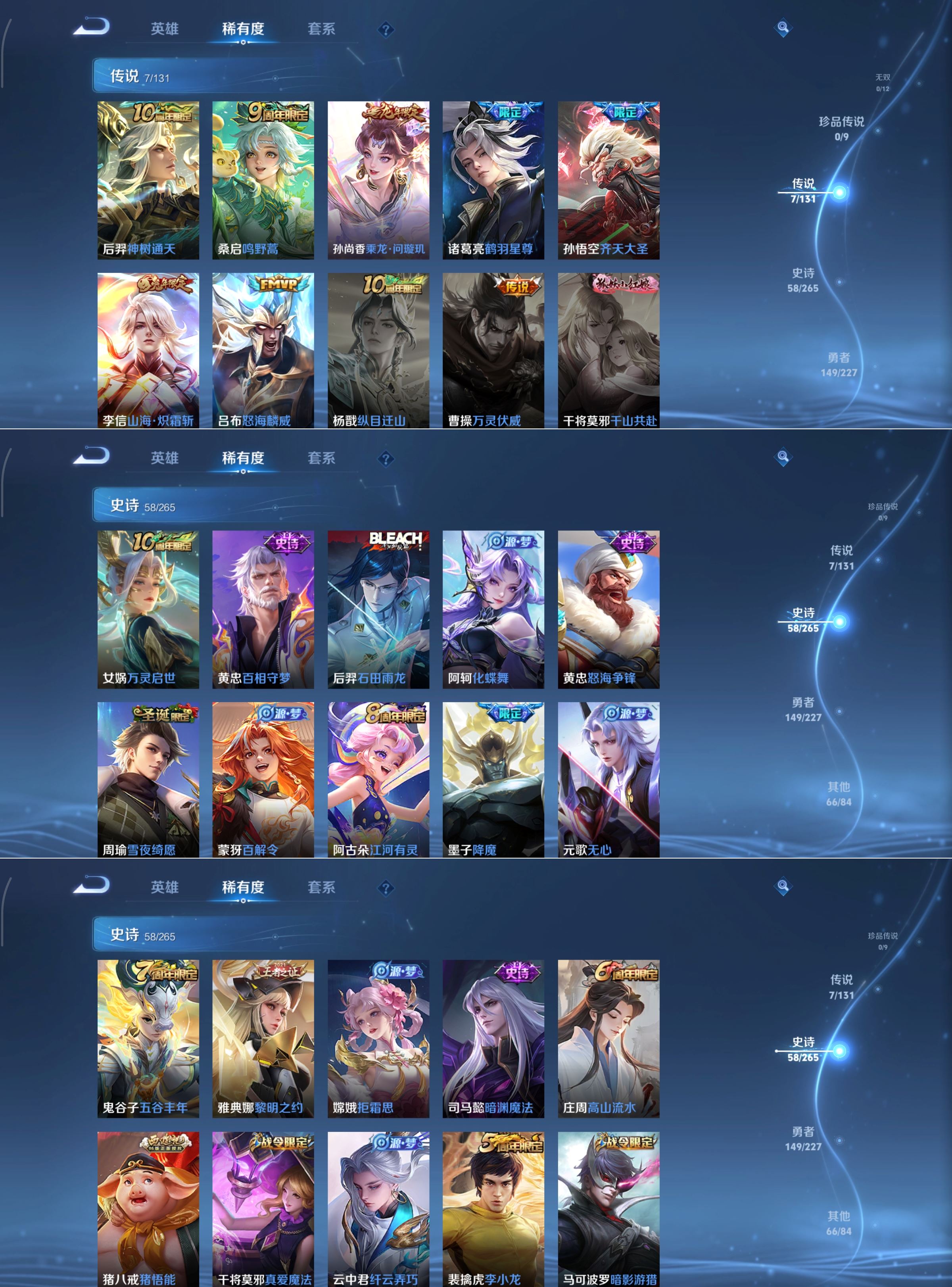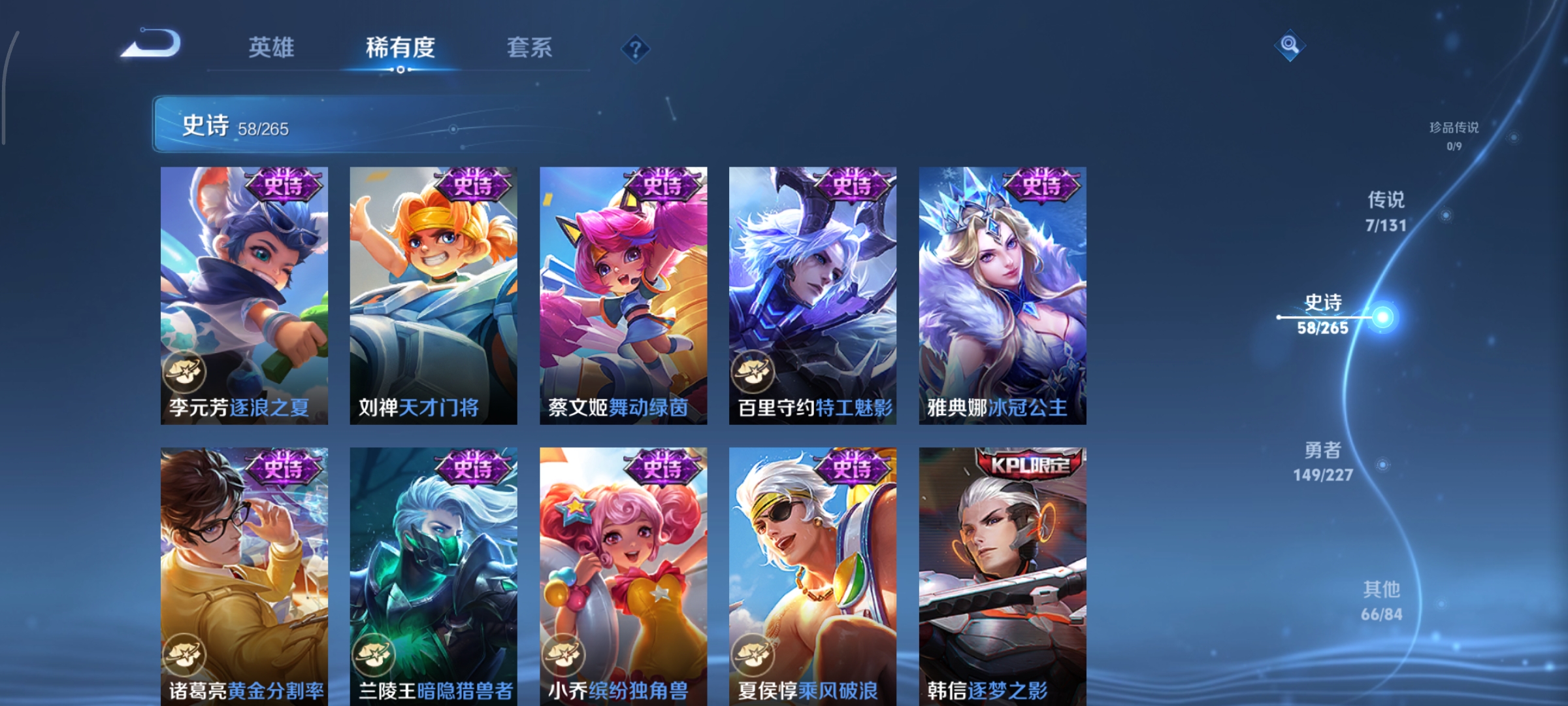 尊贵铂金III-126英雄-280皮肤-7传说-58史诗