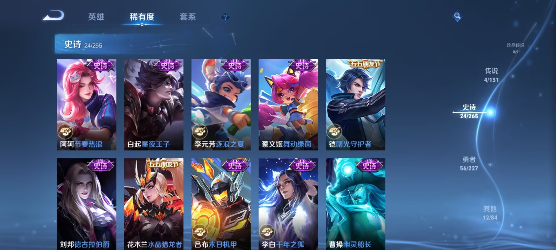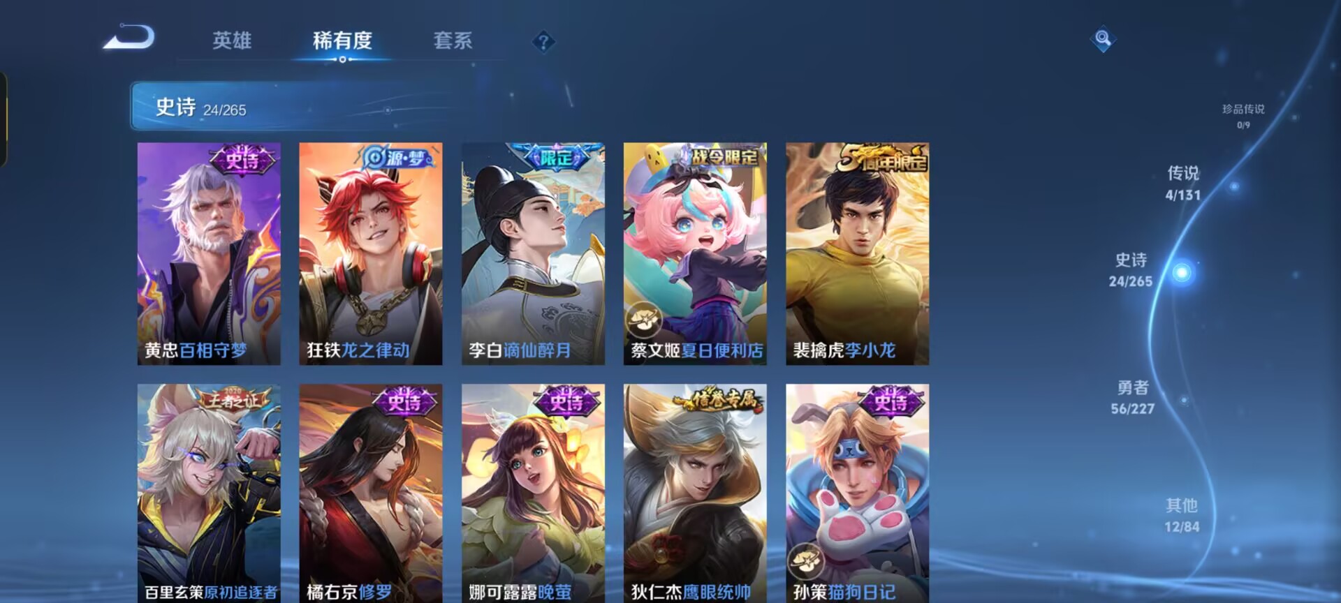【史诗皮肤】 布丁狗之约 谧流熔炉 龙之律动 谪仙醉月 踏浪烽翎 夏日便利店 百相守梦 舞动绿茵 幽灵船长 鹰眼统帅 鬼剑武藏 水晶猎龙者 修罗 曙光守护者 千年之狐 逐浪之夏 地狱岩魂 德古拉伯爵 绅士熊喵 末日机甲 晚萤 李小龙 猫狗日记 水果甜心 节奏热浪 星夜王子 原初追逐者