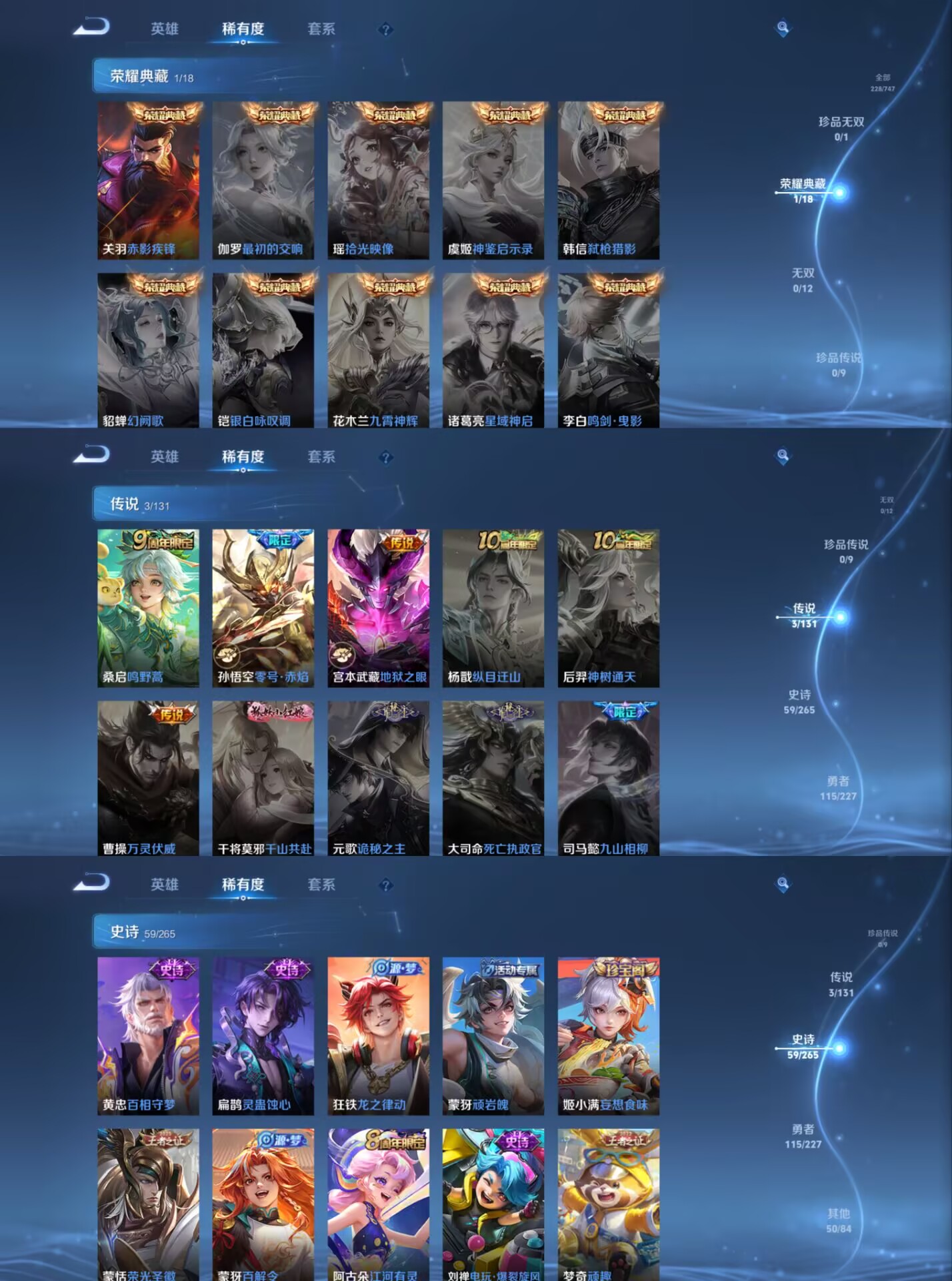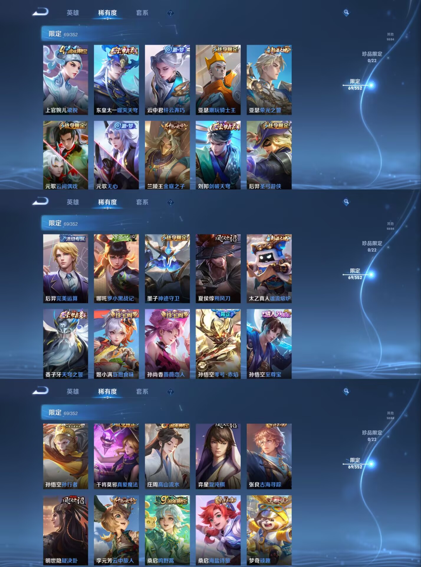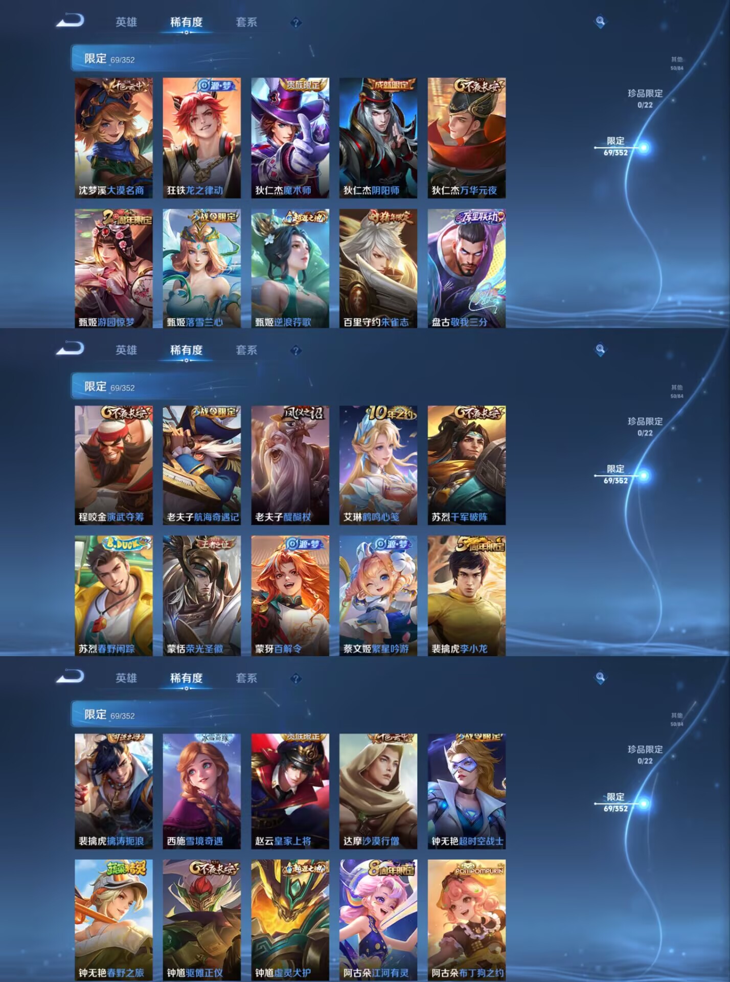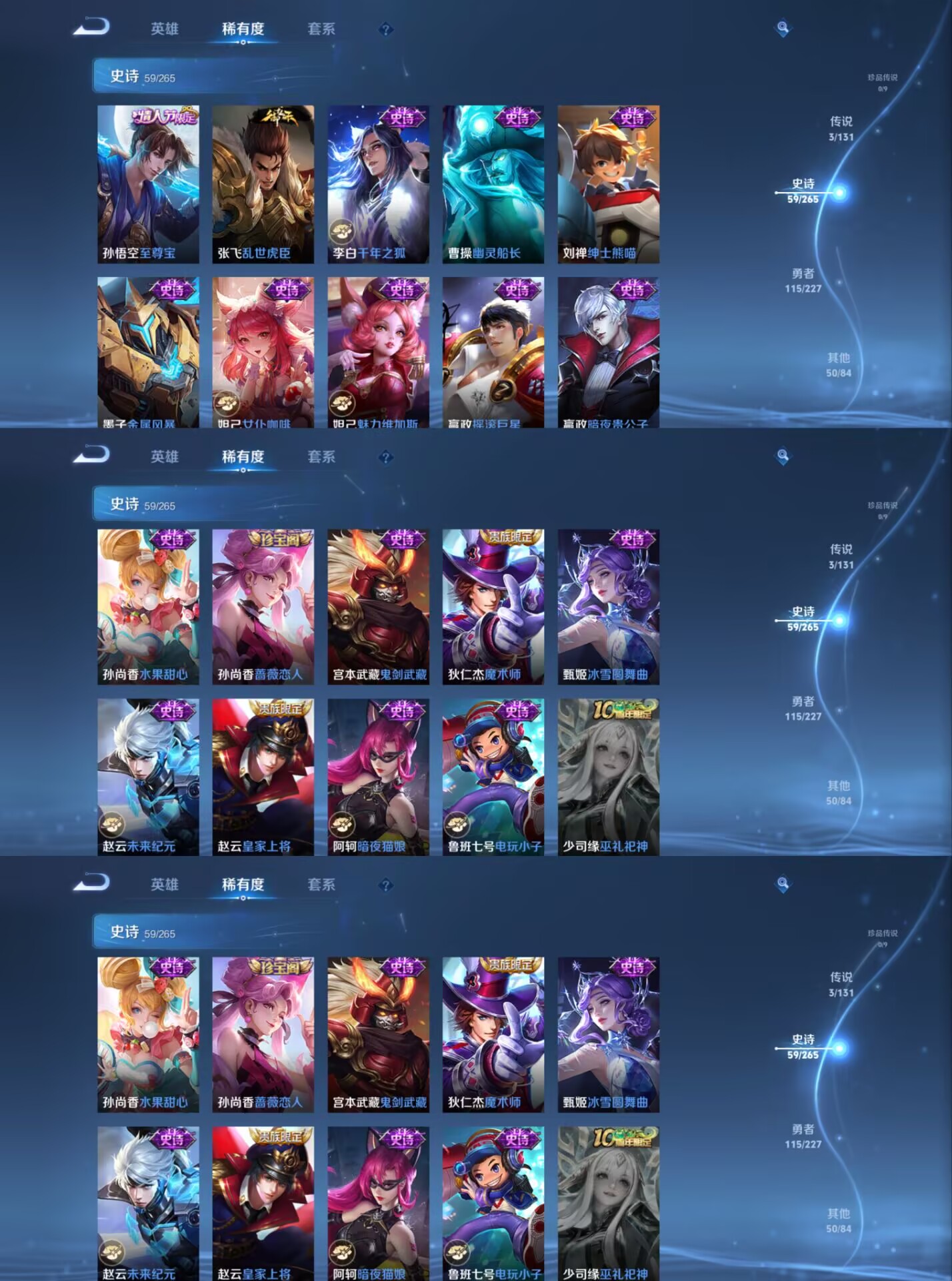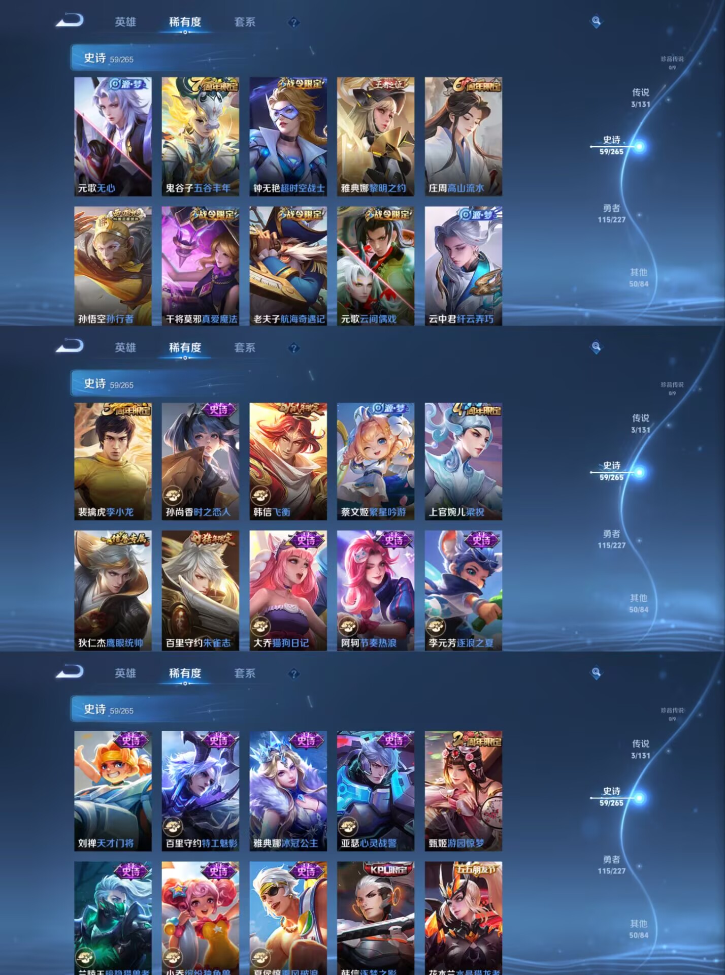 【史诗皮肤】 逐梦之影 飞衡 布丁狗之约 谧流熔炉 电玩小子 至尊宝 灵蛊蚀心 孙行者 龙之律动 九幽镇关 威尼斯狂欢 罗小黑战记 踏浪烽翎 聚星闪耀 江河有灵 幻夜行动 百解令 荣光圣徽 百相守梦 顽岩魄 超时空战士 顽趣 朱雀志 幽灵船长 繁星吟游 女仆咖啡 魅力维加斯 猫狗日记 魔术师 鹰眼统帅 真爱魔法 鬼剑武藏 水晶猎龙者 暗隐猎兽者