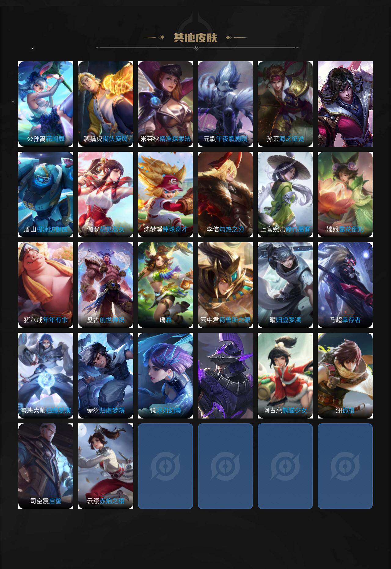 【限定皮肤】:白起狰,狄仁杰阴阳师,虞姬凯尔特女王,赵云皇家上将,墨子神迹守卫,嬴政白昼王子,鲁班七号狮舞东方,高渐离死亡摇滚,阿轲迷踪丽影,芈月重明,吕布猎兽之王,吕布御风骁将,周瑜赤莲之焰,元歌