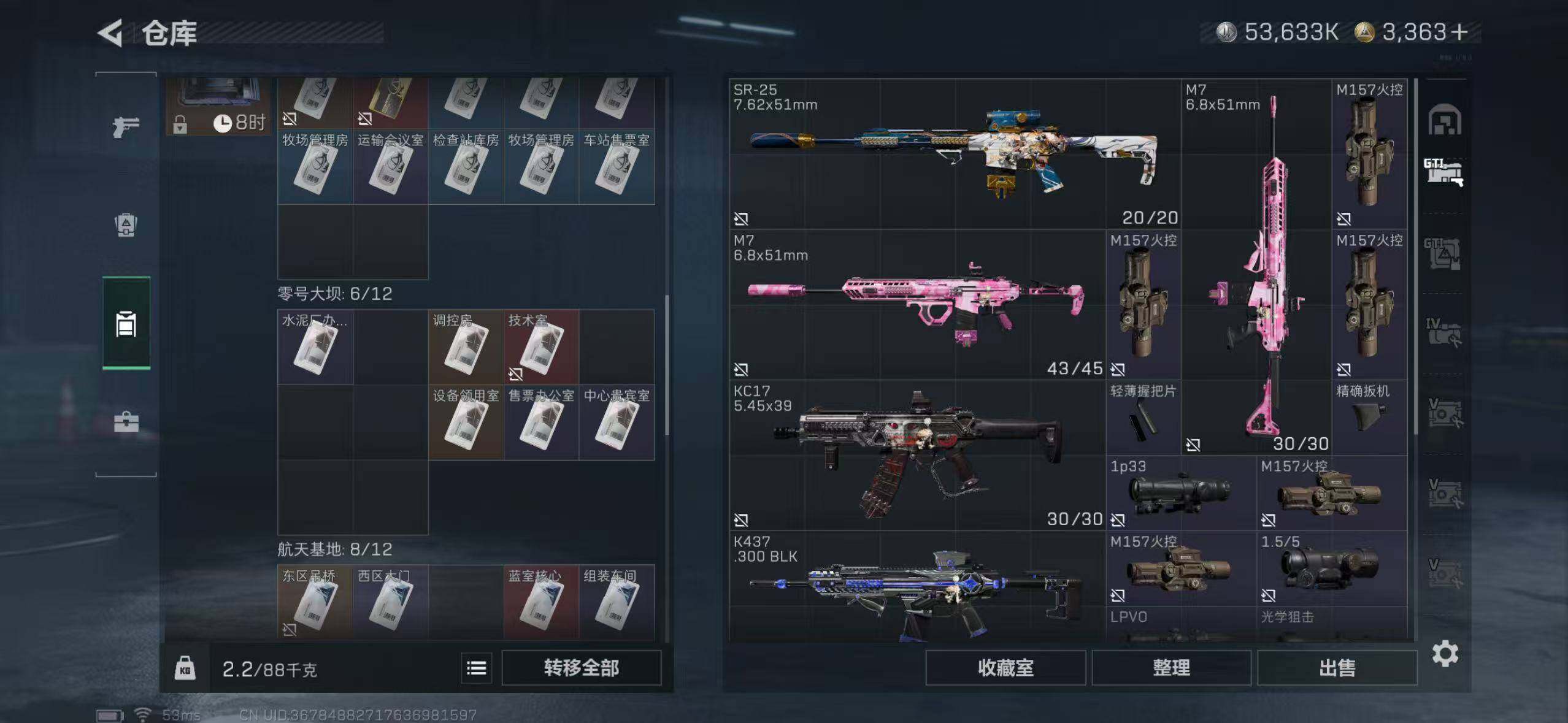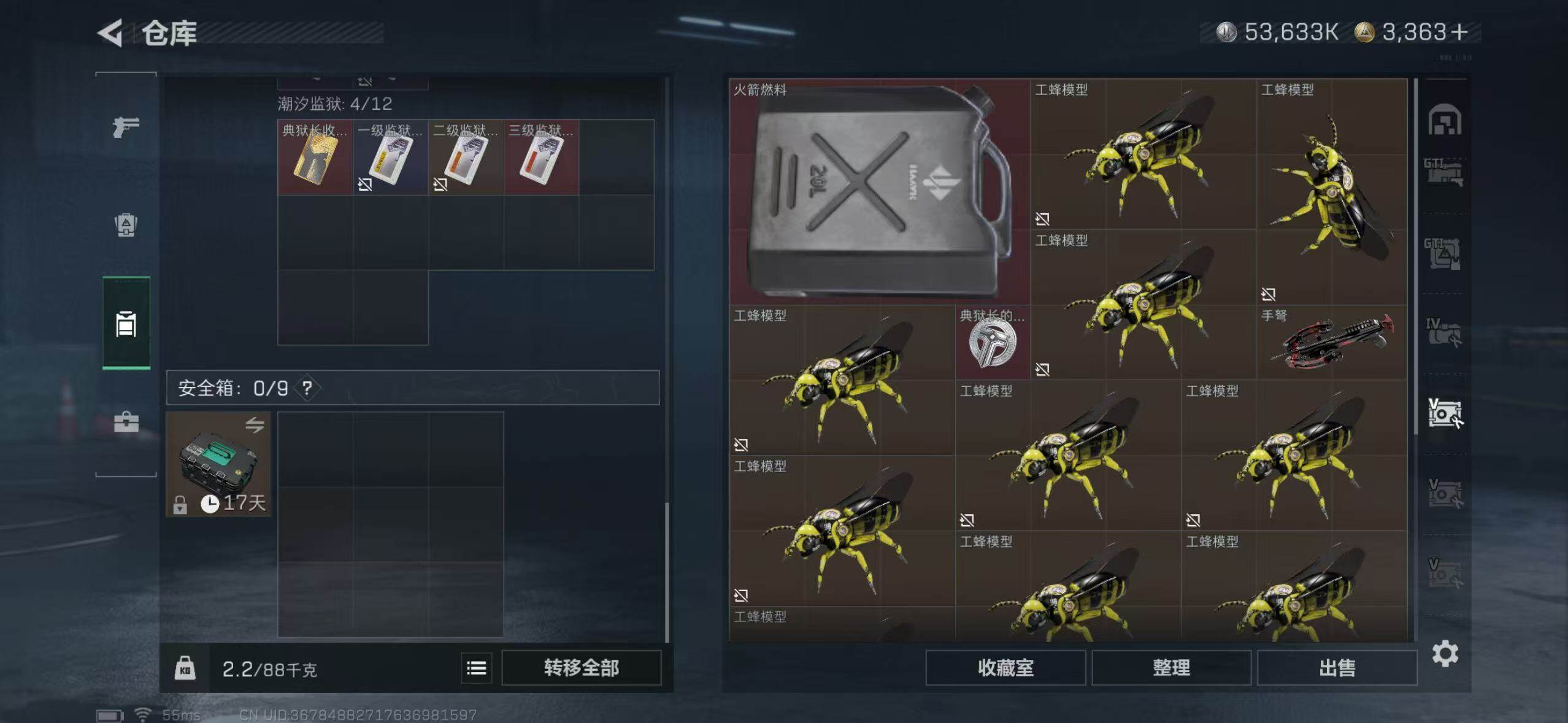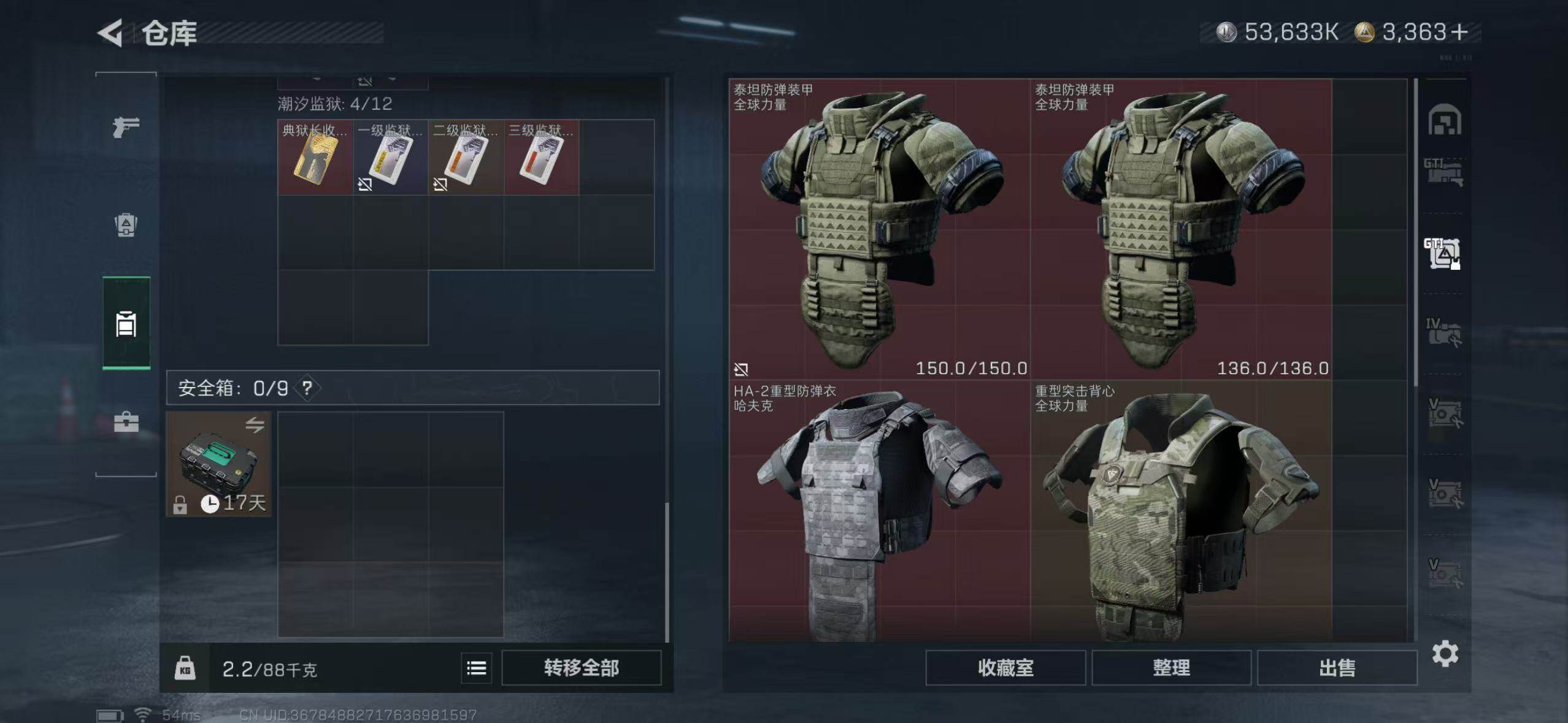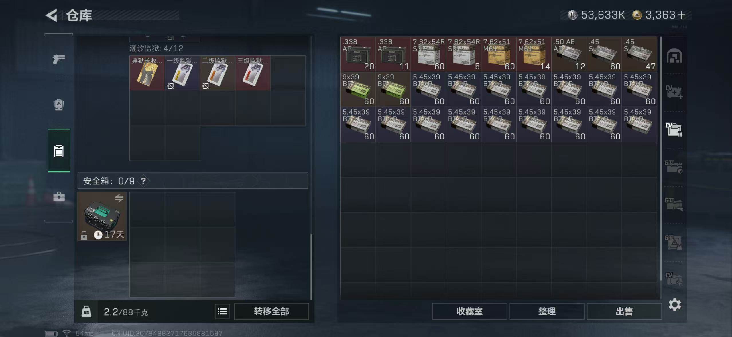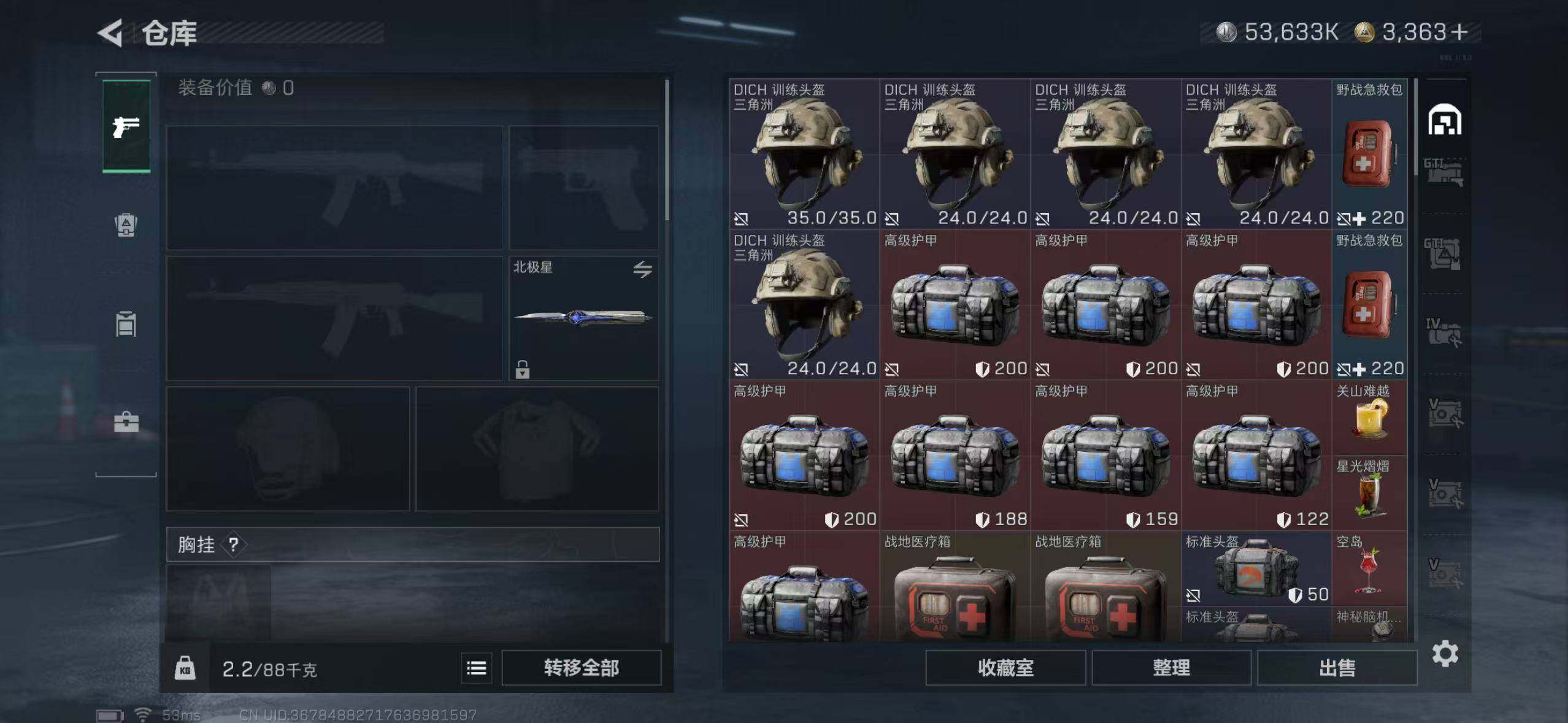 满体满负满仓三角币:3075行动等级:60 总资产:307.6M 哈夫币:5363.4W 近战武器:近战武器-北极星 干员皮肤:电锯惊魂,送葬人·无题密令,维什戴尔,黑·天际线 安全箱:顶级安全箱9(3x3) 满部门