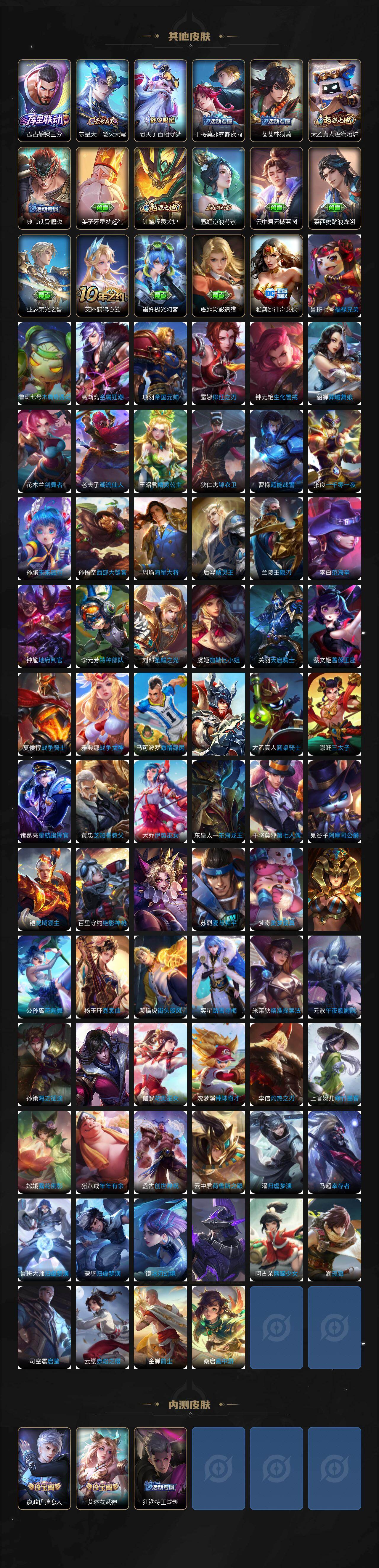 【传说皮肤】:裴擒虎祥瑞亨通,桑启鸣野蒿,墨子黄金天蝎座,亚连落雪白狼,吕布遇见神鼓,李信山海炽霜斩,曜李逍遥 ,虞姬启明星使,关羽武圣,李信一念神魔,刘备时之恋人,貂蝉猫影