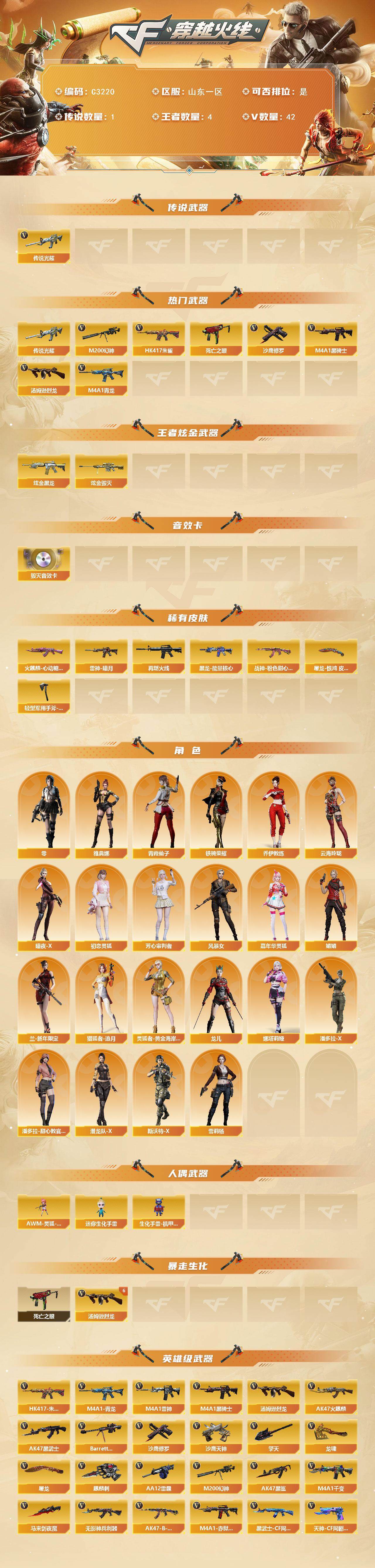【C3220】山东一区-42V-4王者-2炫金【6烈龙】【死亡之眼】【传说光耀】【M200-幻神】【M4A1-青龙】【HK417-朱雀】【魂·炼狱-玩具枪】【汤姆逊-烈龙】【死亡之眼】【零】【乔伊教练】【云海玲珑】【M4A1-雷神】【雷神-赛博朋克】【雷神-暗月】【AK47-火麒麟】【火麒麟-心动糖果】【M4A1-黑骑士】【黑骑士-摸金校尉】【黑龙-能量核心】【Barrett-毁灭】【Barrett-毁灭音效卡】