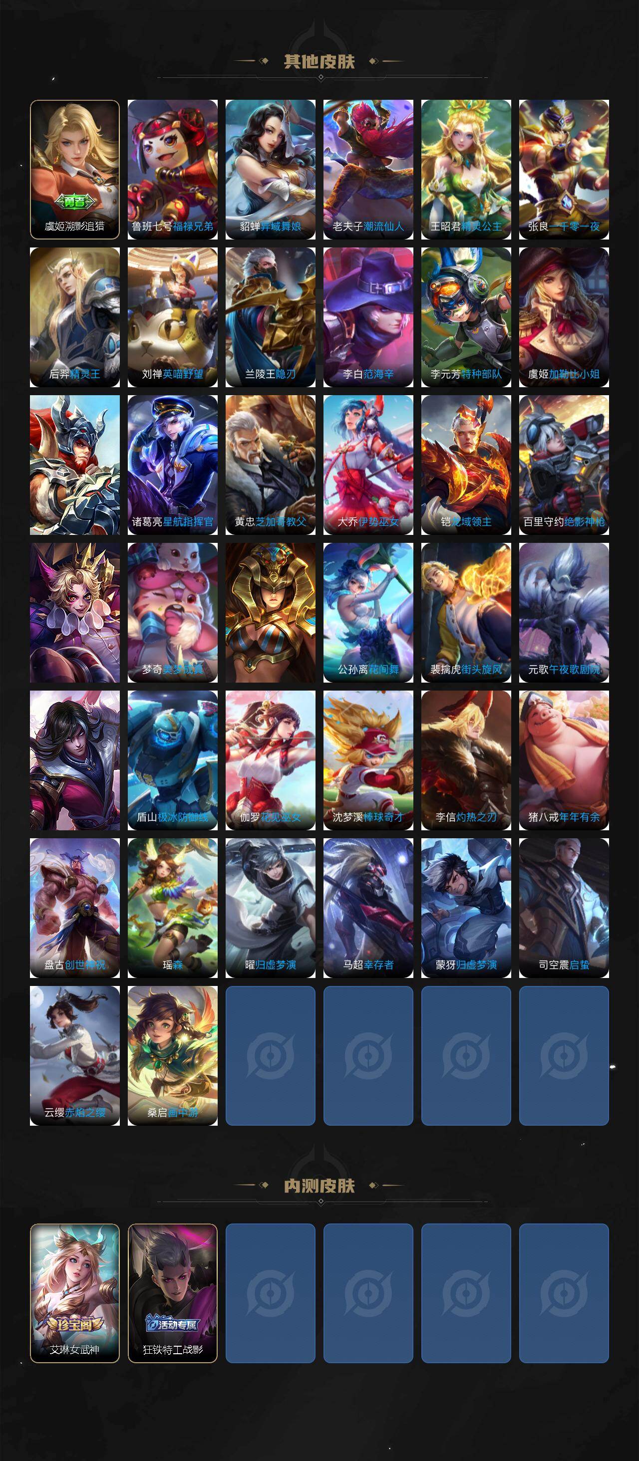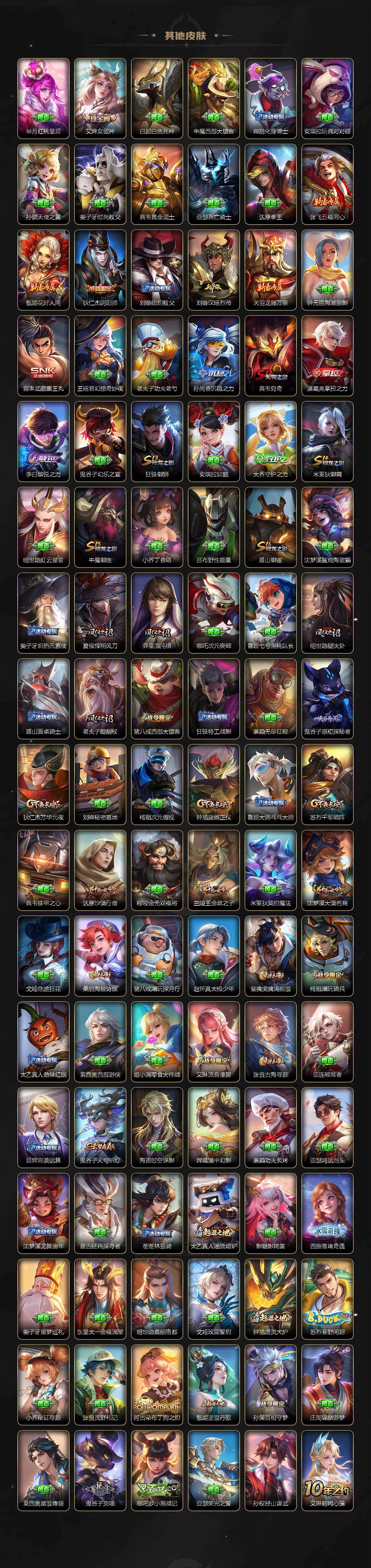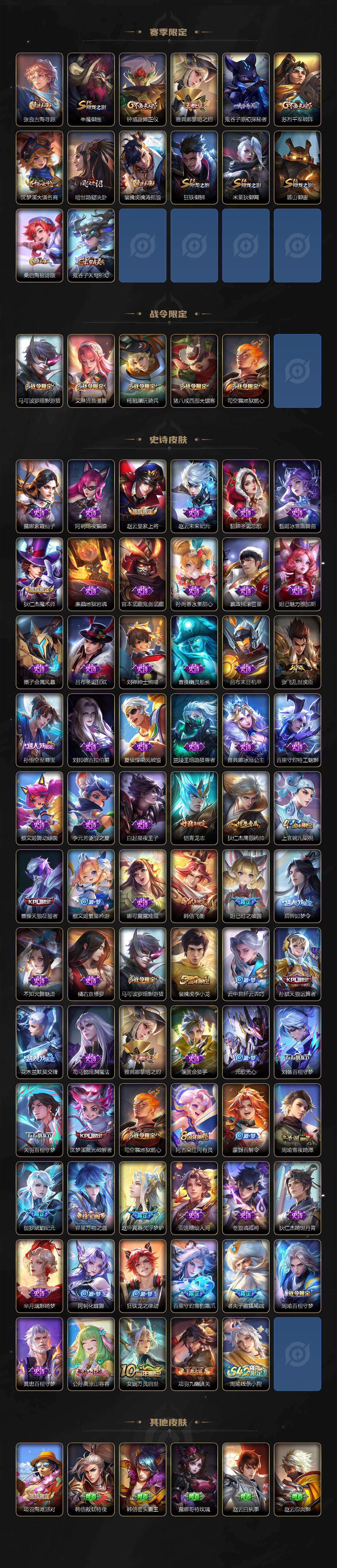 【传说皮肤】:后羿神树通天,司马懿九山相柳,公孙离云诺千山,司空震愿照山河定,澜愿照九州拓,虞姬愿照岁时盈,云缨幻光神枪,桑启鸣野蒿,孙尚香乘龙问璇玑,孙策乘龙淬吴钩,赵云乘龙铭钟鼎,露
