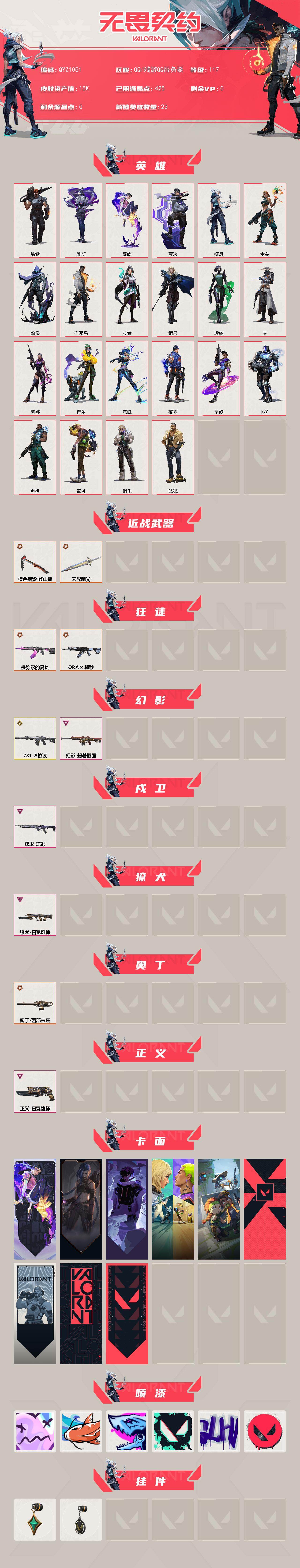 【QYZ1051】终极*5/传奇*2/卓越*4/皮肤*24/等级*117/段位:黄金/炼狱/维斯/暮蝶/钛狐/壹决/捷风/雷兹/幽影/不死鸟/贤者/猎枭/蝰蛇/零/芮娜/奇乐/霓虹/夜露/星礈/K/O/海神/盖可/钢锁/近战武器-橙色疾影 登山镐/近战武器-天界荣光/狂徒-多弥尔的复仇/狂徒-ORA x 颗秒/幻影-781-A协议/幻影-般若假面/戍卫-掠影/獠犬-日冕雄师/奥丁-西部未来/正义-日冕雄师/无畏契约:暮蝶 卡面/《双城之战》金克丝 卡面/逆向独行 卡面 /钢锁vs盖可 卡面/别冒