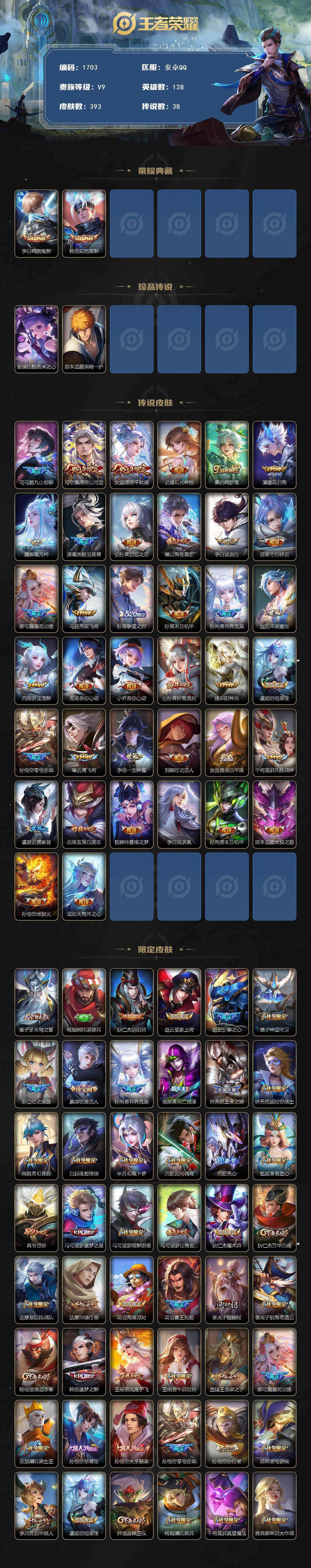 安卓Q-V9-最强王者段位-128英雄-393皮肤-2典藏皮肤-2珍品传说-38传说-125史诗