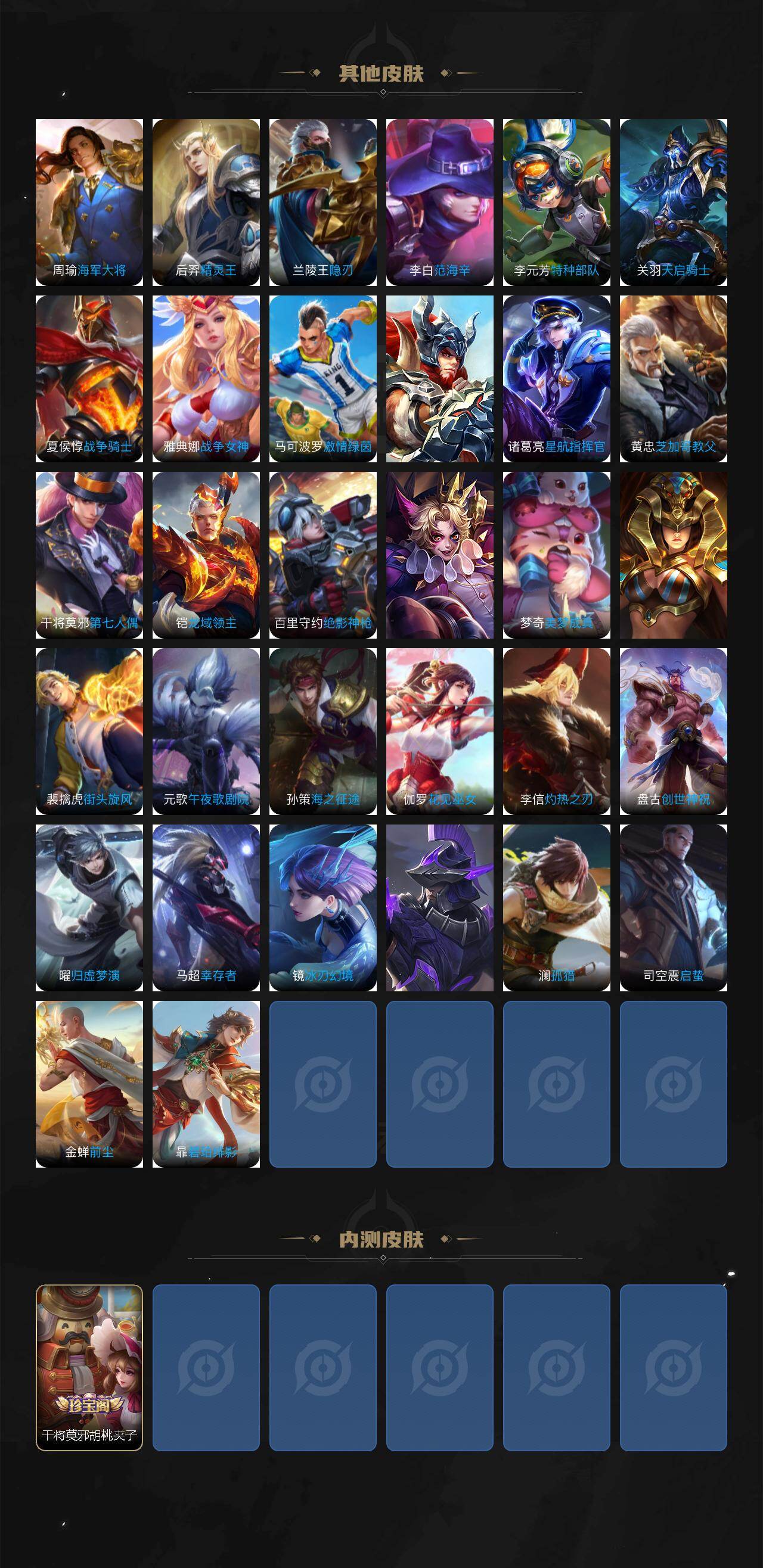 【传说皮肤】:后羿神树通天,司空震愿照山河定,澜愿照九州拓,云缨幻光神枪,裴擒虎祥瑞亨通,嬴政玄雷天君,李信山海炽霜斩,马超无双飞将,曜云鹰飞将,刘备时之恋人,达摩黄金狮子座,花木兰冠军飞将,宫本武藏地狱之眼