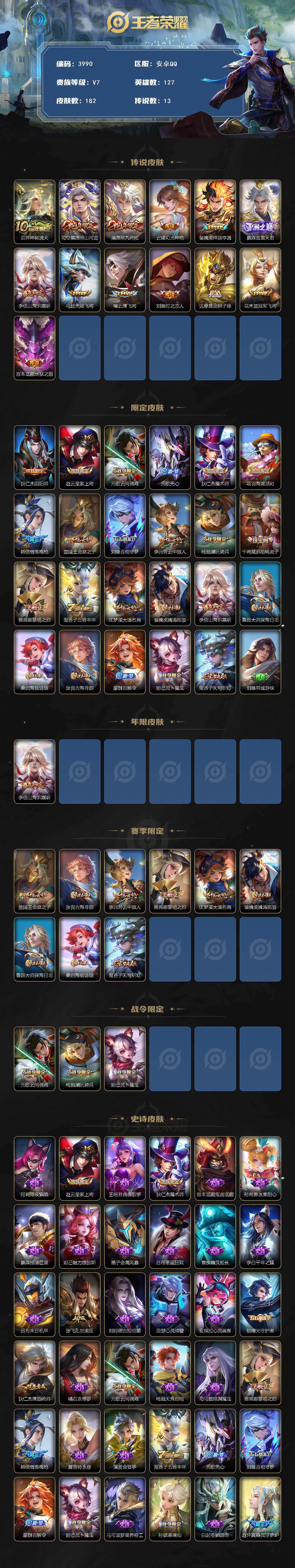 安卓Q-V7-至尊星耀V段位-127英雄-182皮肤-13传说-46史诗【英