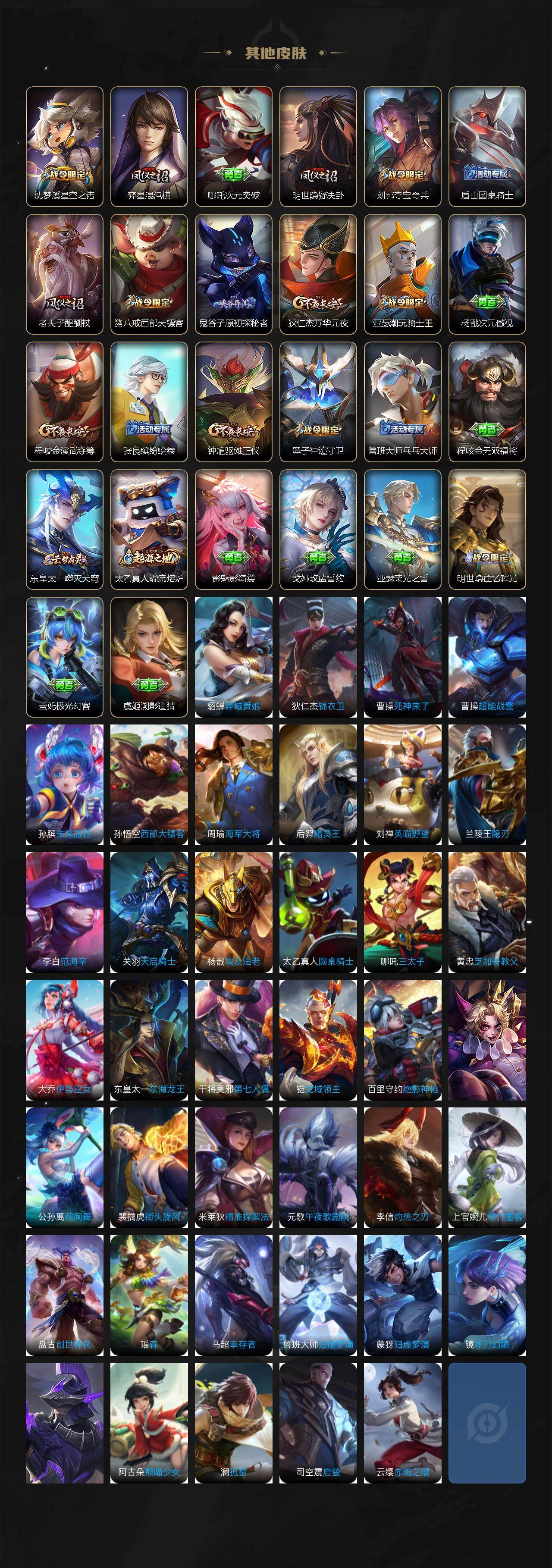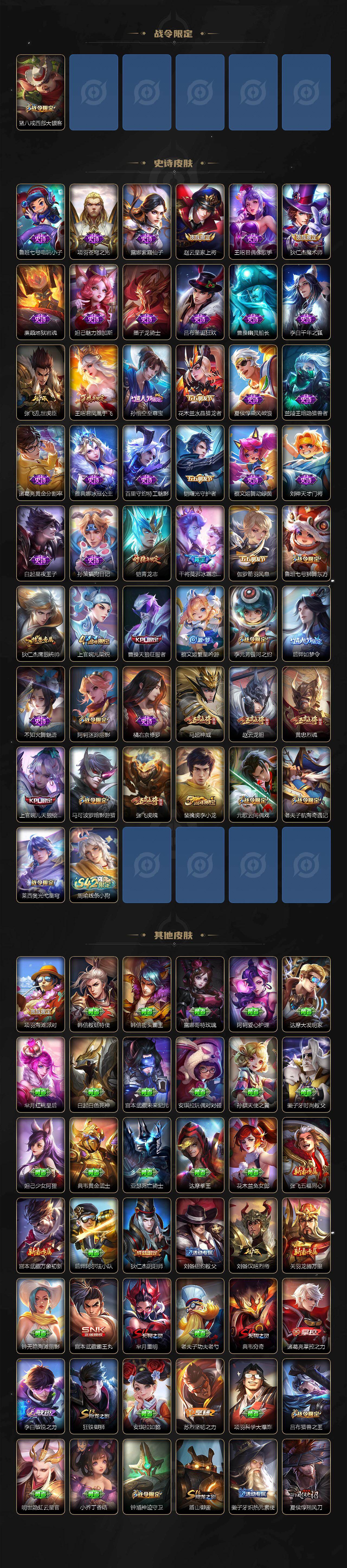 【限定皮肤】:狄仁杰阴阳师,赵云皇家上将,赵云龙胆,墨子神迹守卫,鲁班七号狮舞东方,