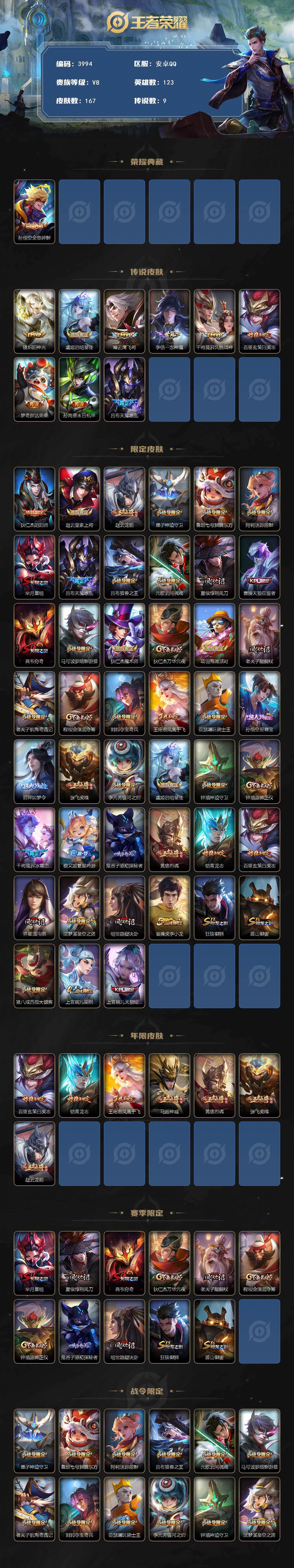 安卓Q-V8-至尊星耀III段位-123英雄-167皮肤-1典藏皮肤-9传说-