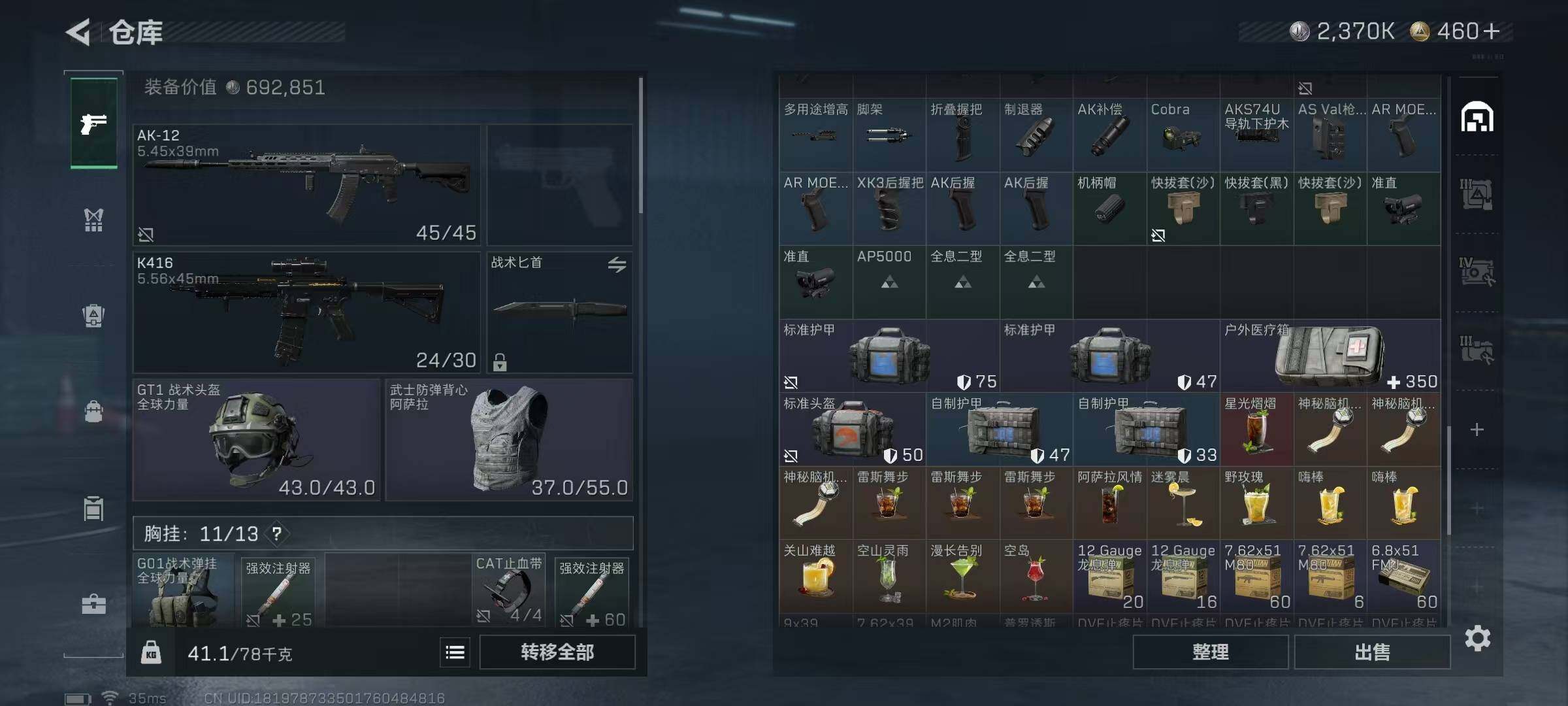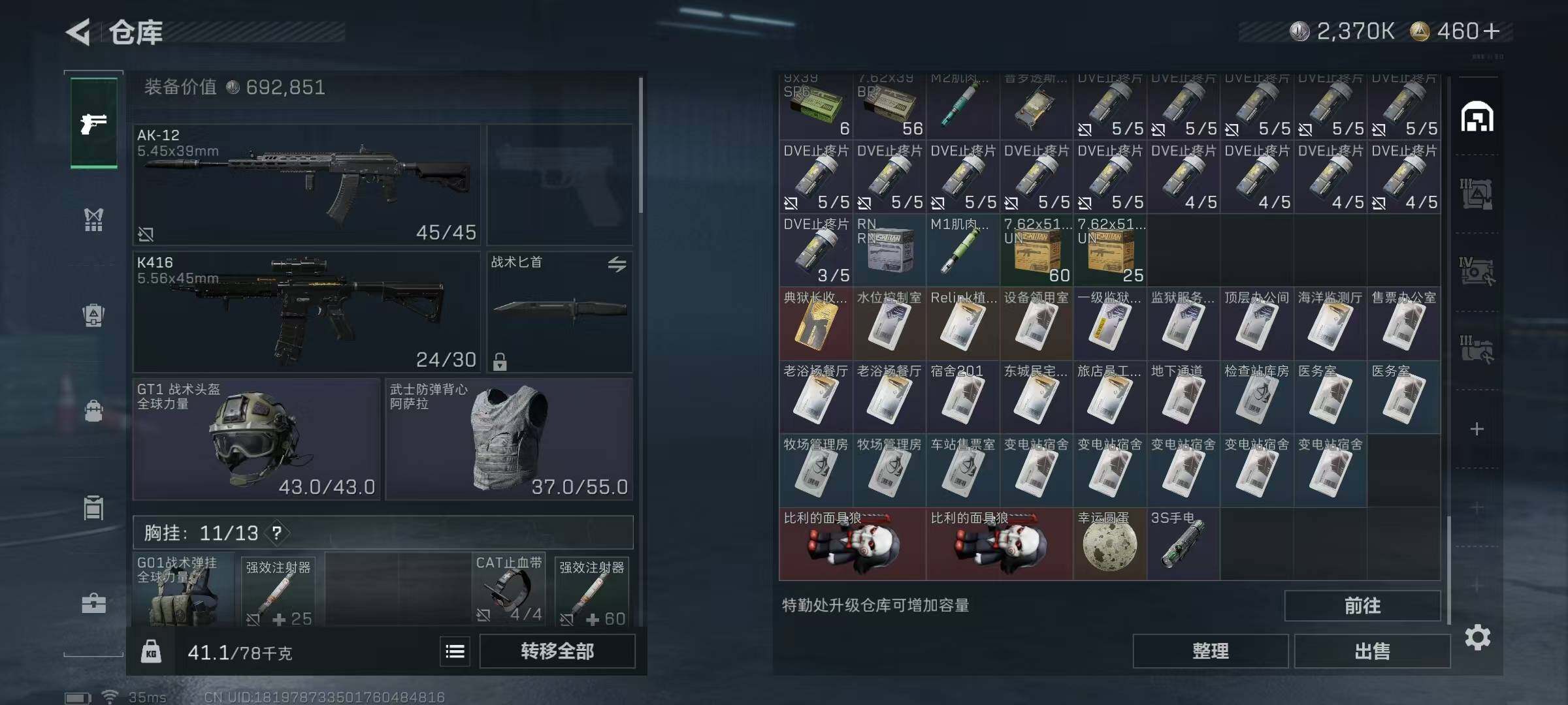 【SJZ3705】总资产(M):57M/哈夫币(K):2370K/哈夫币(K):2370K/全面战场等级:2_段位:无段位/烽火地带等级:60_段位:青铜/近战-黑鹰/SCAR-H战斗步枪-荣耀列队/腾龙突击步枪-冰天雪地/Vector冲锋枪-先锋/SMG-45-行动开启/SMG-45冲锋枪-幻影结构/勇士冲锋枪-冰天雪地/QJB201轻机枪-哈夫克卫队/G18-星链科技/G18-哈夫克航天/M4A1突击步枪-粉色涂装/M4A1突击步枪-高雅黑/QBZ95-1突击步枪-高雅黑/QBZ95-1突击