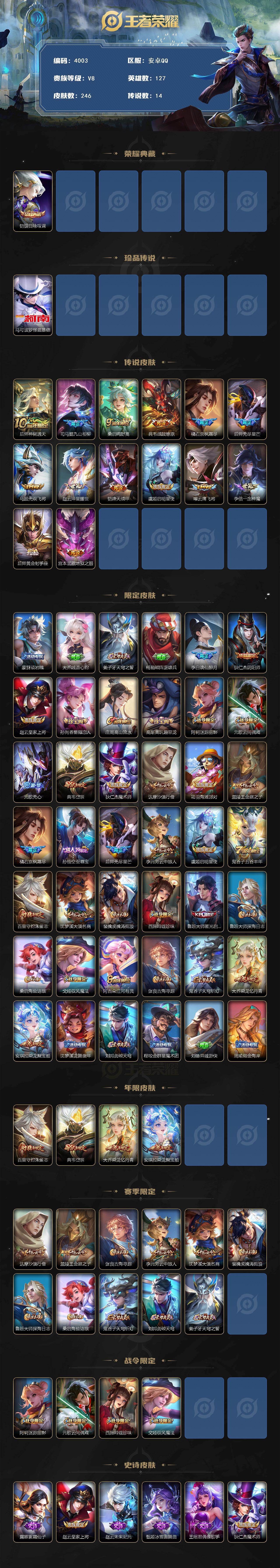 安卓Q-V8-尊贵铂金III段位-127英雄-246皮肤-1典藏皮肤-1珍品传说-14传说-69史诗