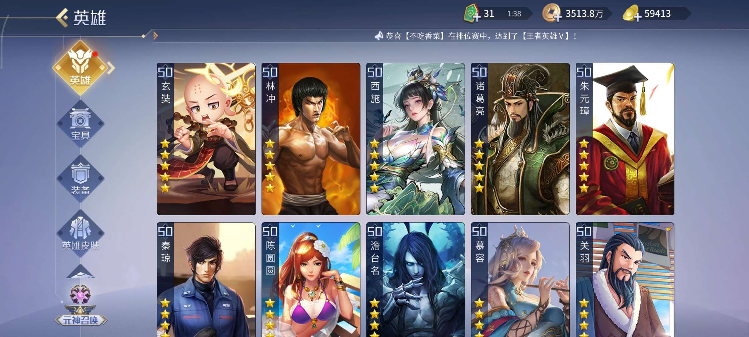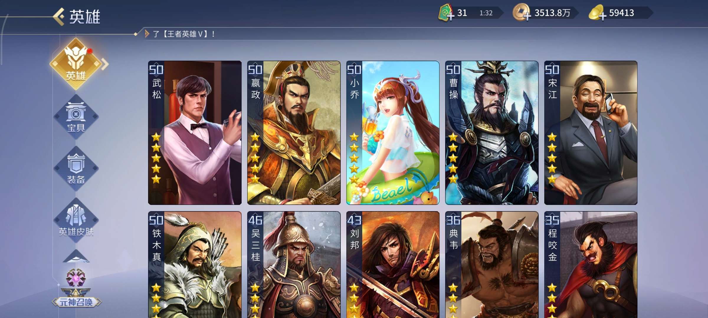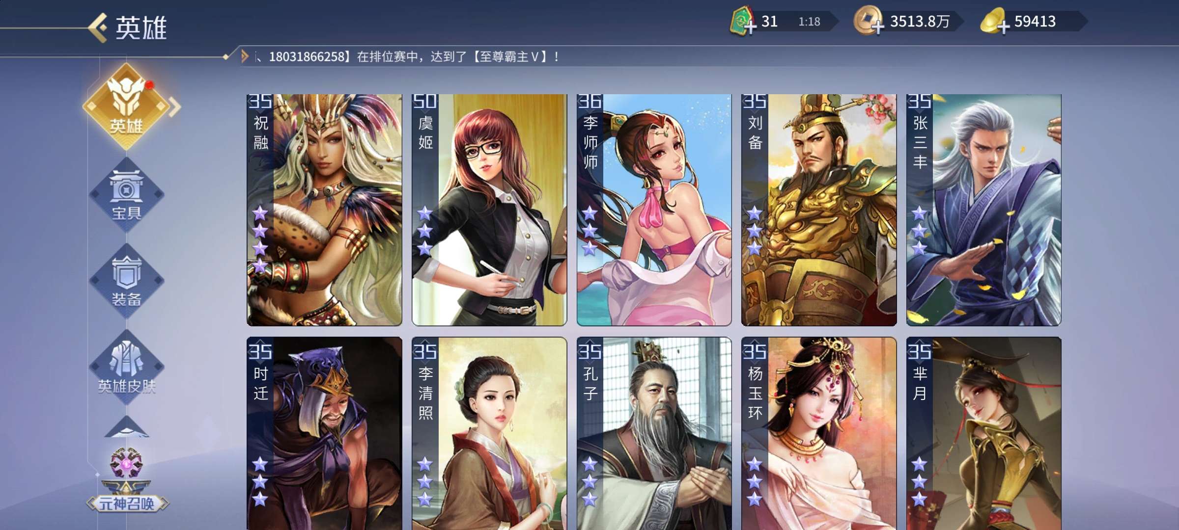 高v15,带5.8万元宝。英雄多