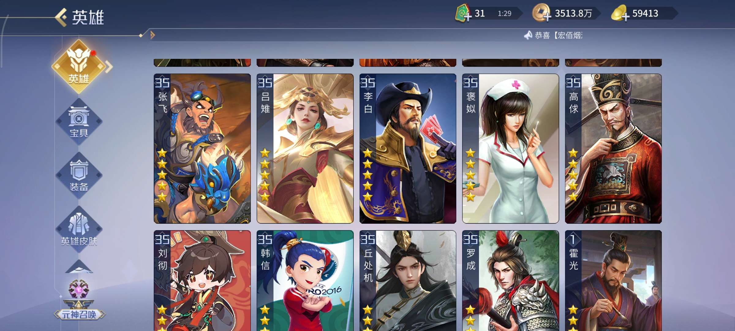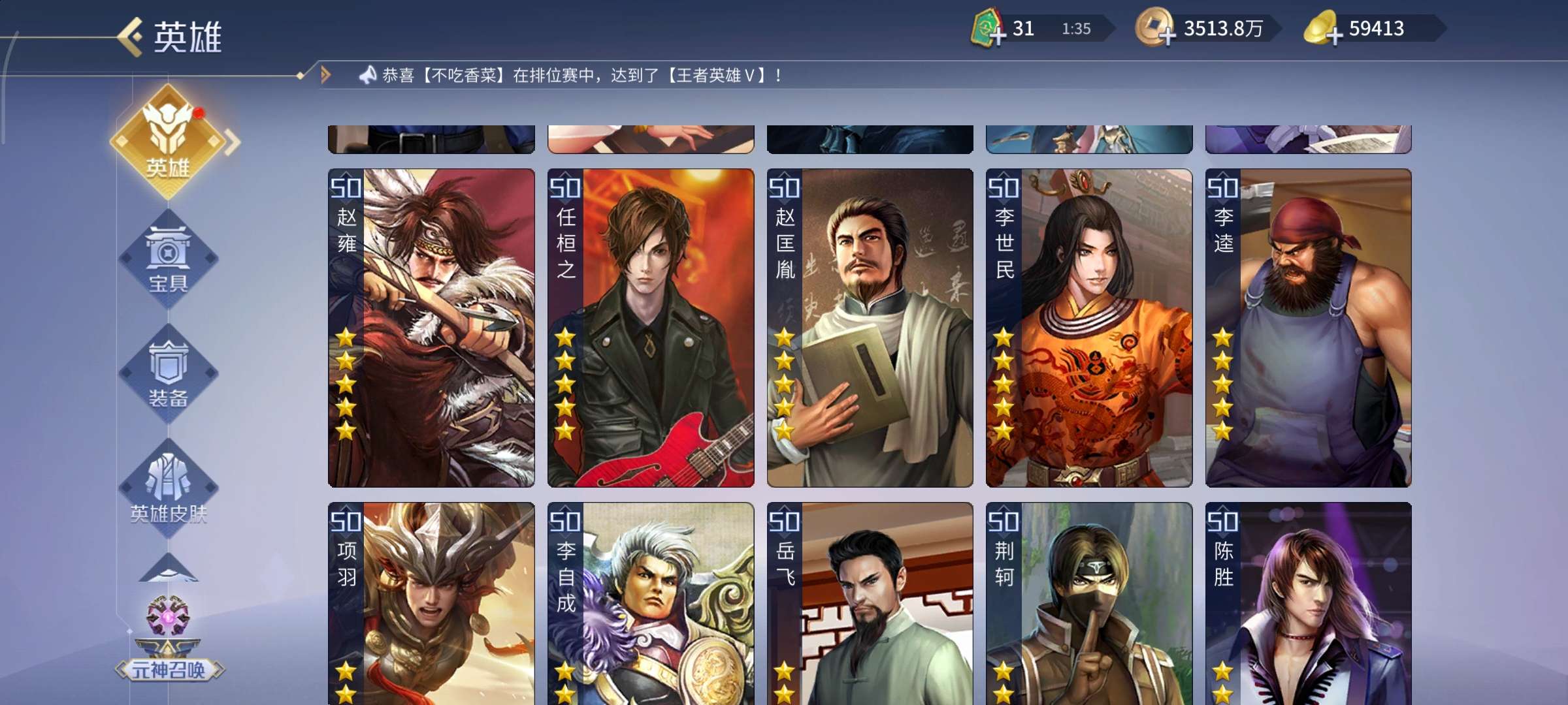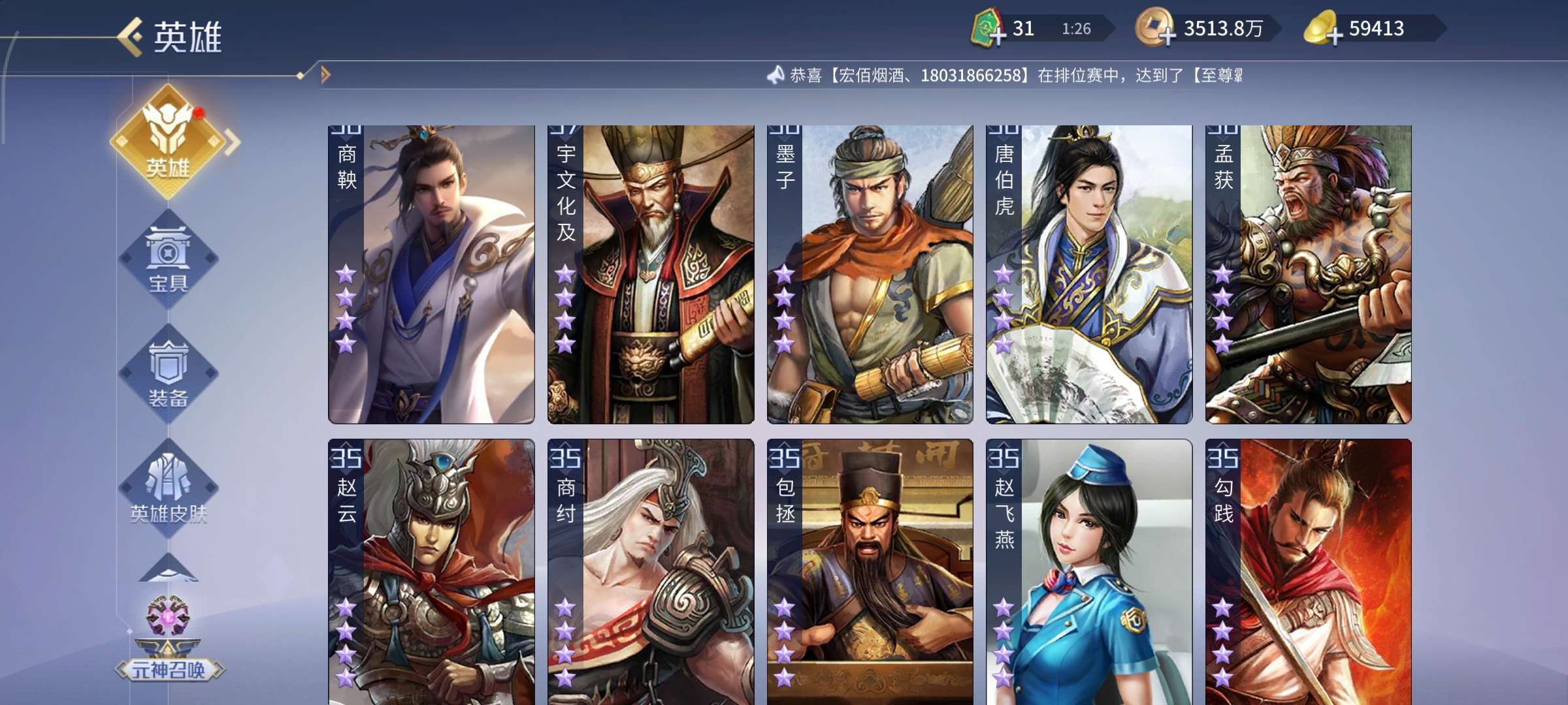高v15,带5.8万元宝。英雄多