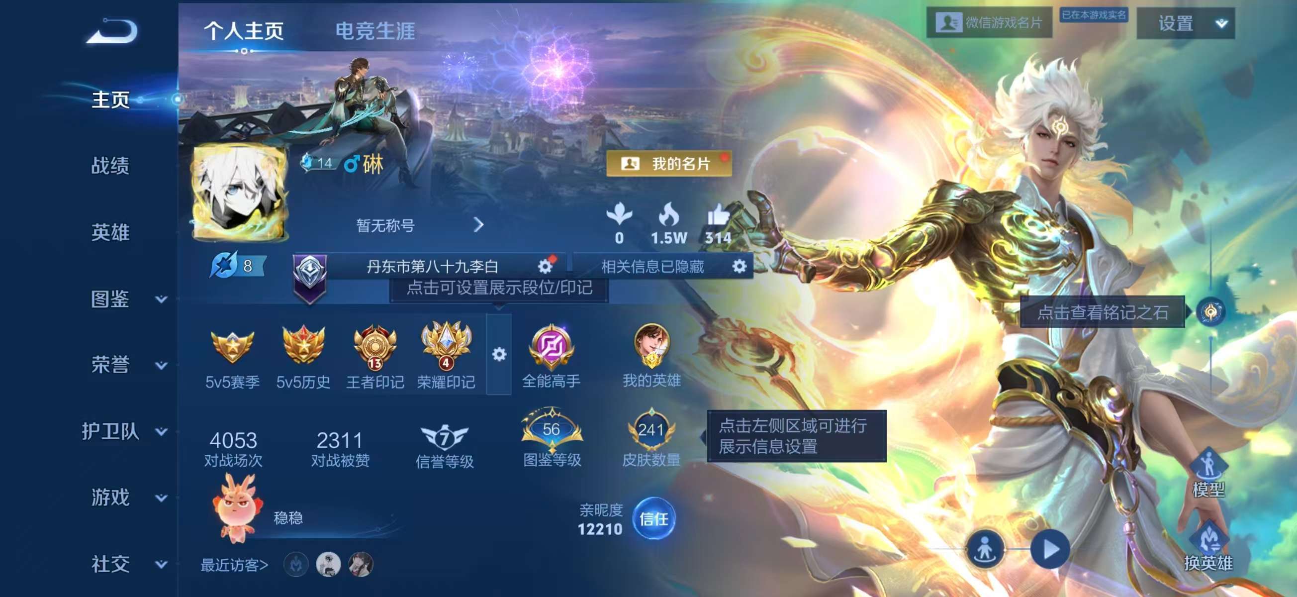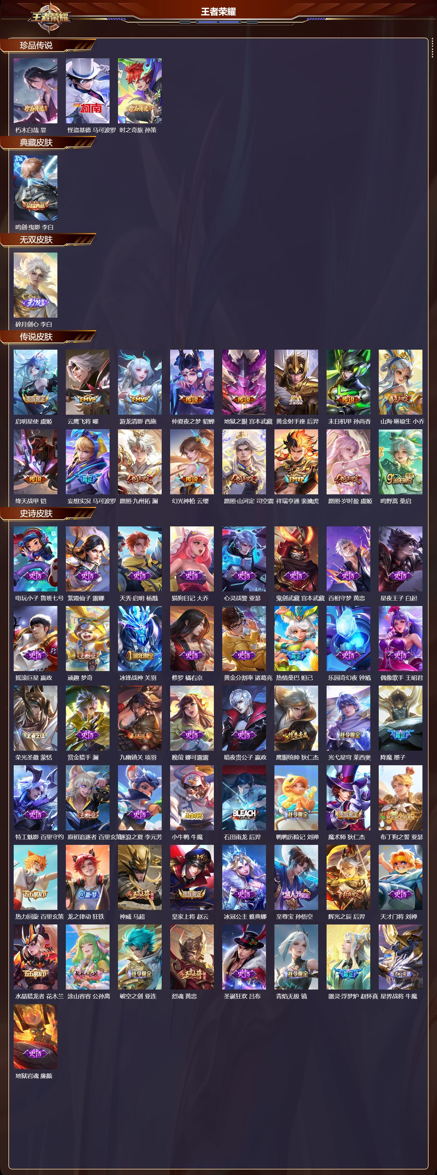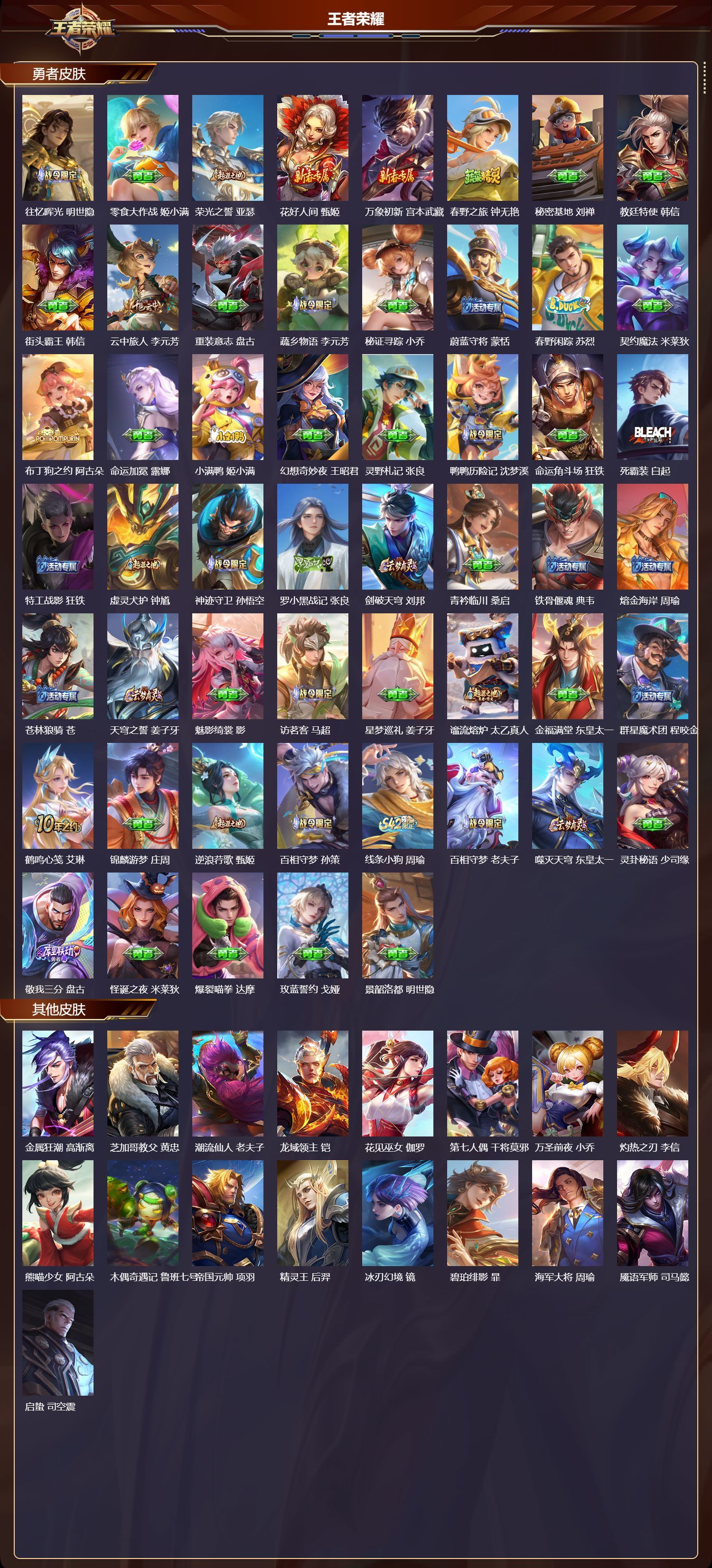 安卓微/最强王者/241皮肤/126英雄/1典藏/0珍品无双/1无双/3珍品传说/16传说/67史